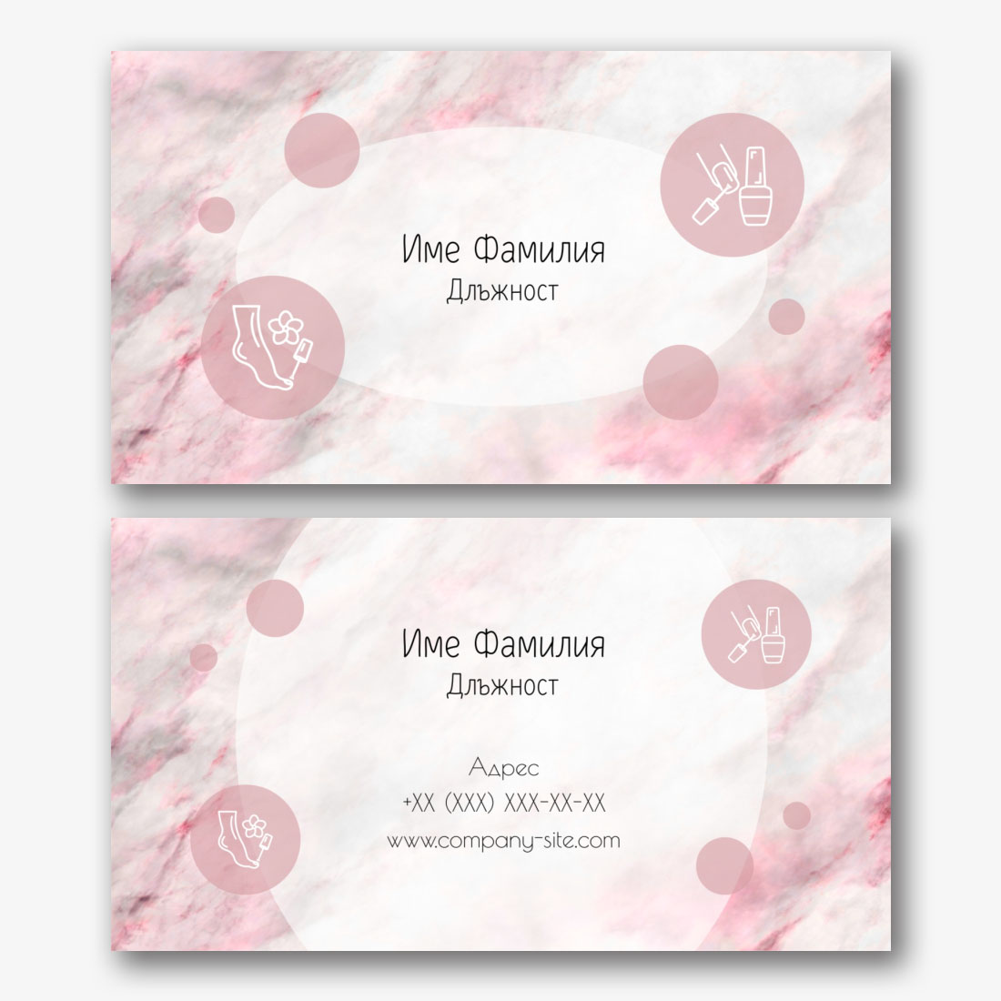 Нашият готов шаблон за визитка за маникюрист е идеалното решение за професионалисти в областта на красотата. Този стилен и модерен дизайн на визитка привлича вниманието и помага да се създаде запомнящ се образ. Шаблонът е подходящ не само за маникюристи, но и за други професионалисти в индустрията за красота, като майстори на педикюр, гримьори, козметици и фризьори. Визитката може да бъде полезна и за собствениците на салони за красота и спа центрове, които предоставят широк спектър от услуги. Едно от ключовите предимства на нашия шаблон е неговата гъвкавост и възможност за пълна персонализация в онлайн конструктора. Можете лесно да промените всички елементи на визитката, вариращи от фона до шрифтовете и цветовата схема. В онлайн конструктора има много инструменти, които ви позволяват да добавите логото на вашата компания, данни за контакт, адреси в социалните медии и дори снимки на вашата работа. По този начин можете да създадете уникална визитка, която напълно ще отговаря на вашия стил и професионален имидж. Процесът на редактиране е много прост и интуитивен. Можете да изберете всеки елемент от визитката и да промените неговия размер, местоположение или цвят. Например, ако искате да подчертаете данните си за контакт, можете да промените шрифта или да добавите ярък фон. Можете също така да използвате готови икони за социални мрежи, за да направите визитката по-информативна и удобна за вашите клиенти.