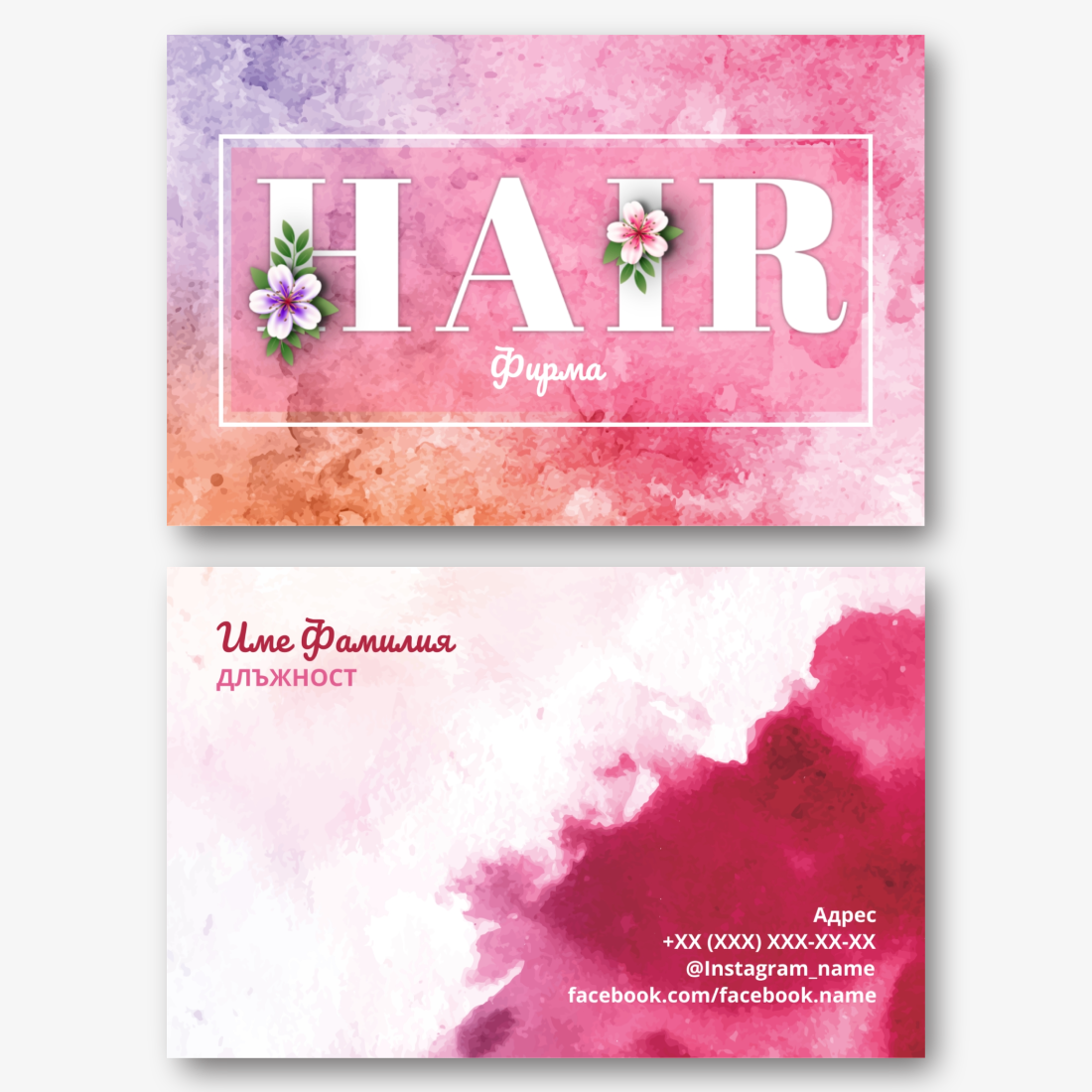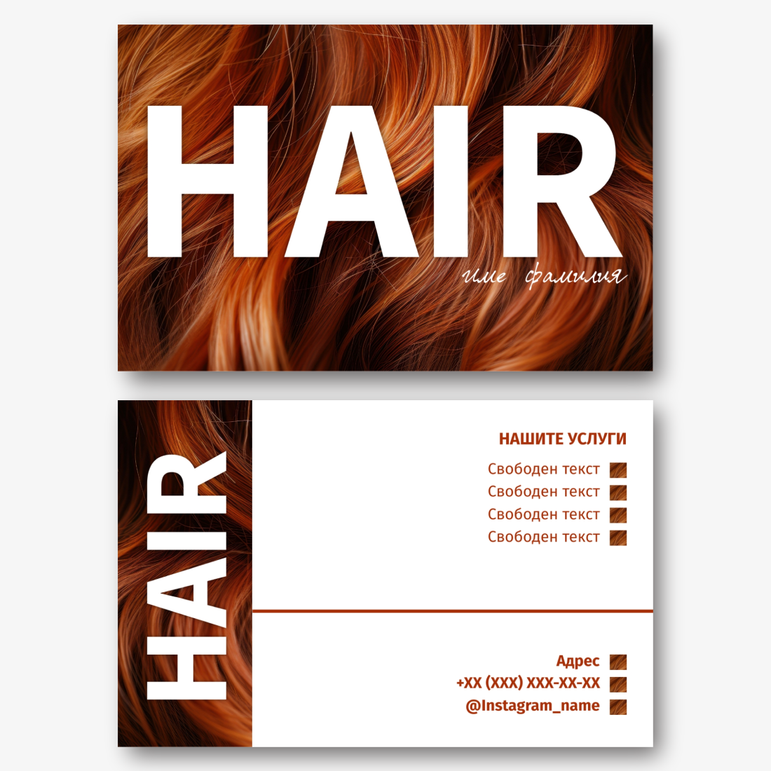 Шаблонът за фризьор и колорист на евровизит на нашия онлайн дизайнер е идеалното решение за професионалисти в областта на красотата и грижата за косата. Нашият шаблон за евро визитка има стилен и модерен дизайн, който привлича вниманието и оставя ярко впечатление на потенциалните клиенти. Фокусът е върху визуалната привлекателност, което е особено важно за специалистите по естетика. Визитката съдържа елементи, които подчертават професионализма и творческия подход на майстора, независимо дали е фризьор, колорист или стилист. Едно от основните предимства на нашия шаблон е неговата гъвкавост и възможност за пълно персонализиране според вашите индивидуални нужди. В онлайн конструктора можете лесно да промените цветовете, шрифтовете и оформлението на елементите на визитката, за да съответства максимално на вашата марка и стил. Можете да добавите своя снимка, лого на салон или информация за контакт, което ще направи визитката уникална и запомняща се. Нашият онлайн дизайнер предоставя интуитивен интерфейс, който прави процеса на създаване на визитка лесен и забавен.