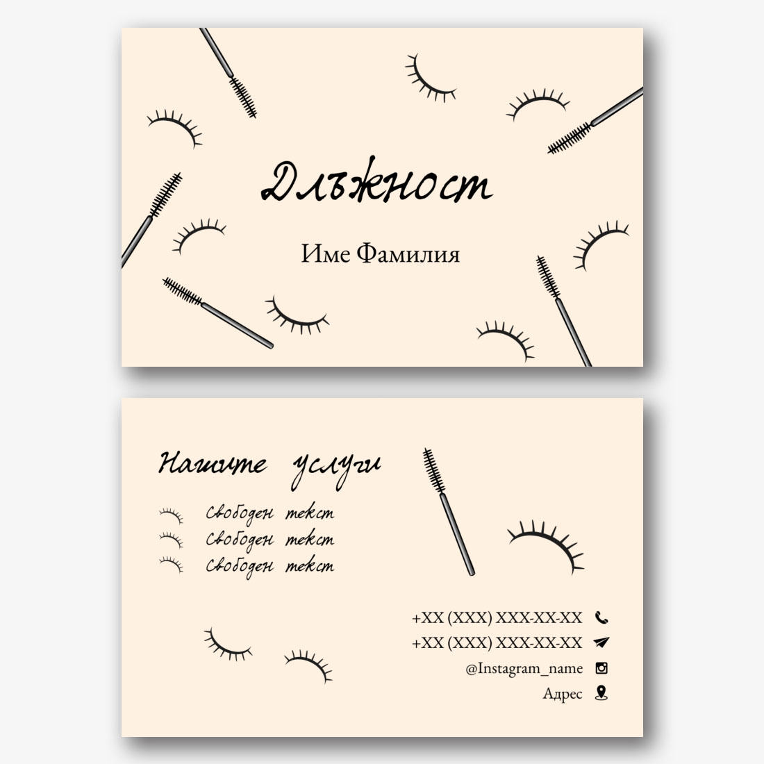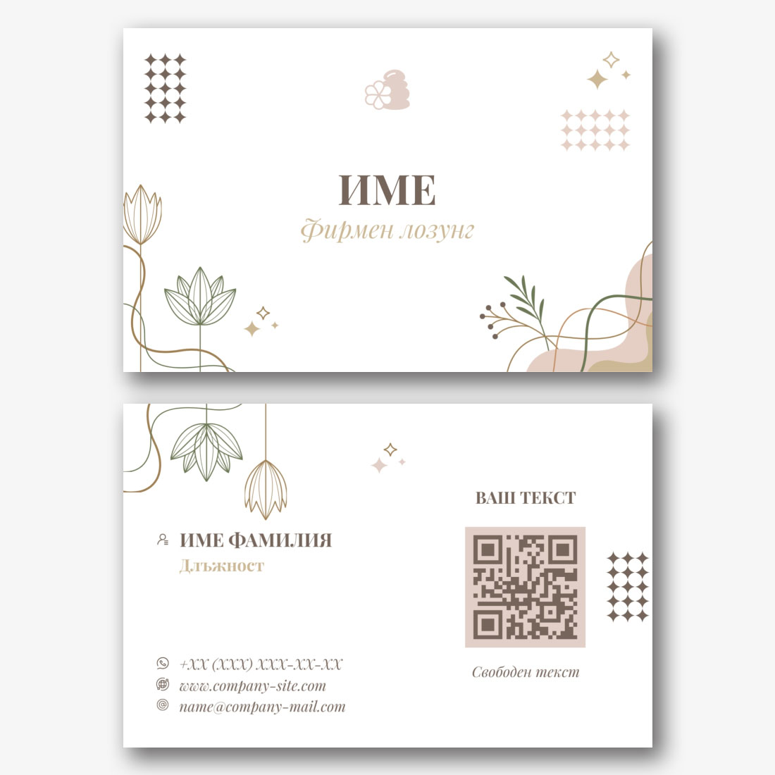 Шаблонът за евроизитка на козметолог е готово решение, което е създадено, като се вземат предвид нуждите на специалистите в областта на красотата и здравето. Той е идеален за козметици, дерматолози, масажисти, маникюристи и педикюри, както и за собственици на салони за красота и СПА центрове. Визитката е изработена в елегантен и модерен стил, който подчертава професионализма и високото ниво на предоставяните услуги. Шаблонът предоставя всички необходими елементи: място за име, информация за контакт, Адрес на салон или офис, както и лого и описание на услугите. Този дизайн улеснява представянето на важна информация по удобен и привлекателен начин. Използвайки нашия онлайн конструктор, можете лесно да промените всеки елемент от евро визитката. Можете да изберете различен шрифт, да промените цветовете, да добавите вашите изображения или лого и да персонализирате оформлението на текста и графиката по ваш вкус.