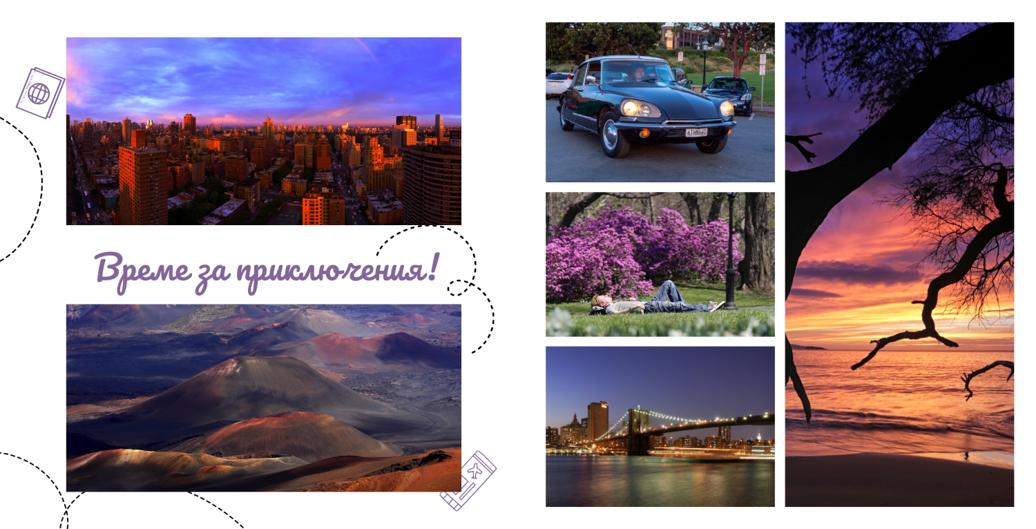 Готовият шаблон за фотокнига" време за приключения " с твърди корици е идеалният избор за тези, които ценят акцентите и искат да ги запазят в уникална форма. Този шаблон е особено подходящ за професионалисти, работещи в областта на туризма, пътуванията или дейностите на открито. Туроператорите могат да го използват за създаване на цветни албуми с фотохроники за пътуване, а фотографите могат да го използват, за да представят работата си, свързана с природата и приключенията. Въпреки това, "време за приключения" е не само готово решение, но и основа за творчество. Нашият онлайн дизайнер предлага широка гама от възможности за редактиране. Можете да промените фона, да добавите вашите снимки, текст, и декоративни елементи. Ако трябва да промените местоположението на снимките или да добавите нови страници, дизайнерът ви позволява да направите това само с няколко кликвания. Този шаблон е чудесен и за лична употреба. Създайте уникална фотокнига, посветена на вашите собствени приключения, независимо дали това е ваканция на море, поход в планината или семейно пътуване.