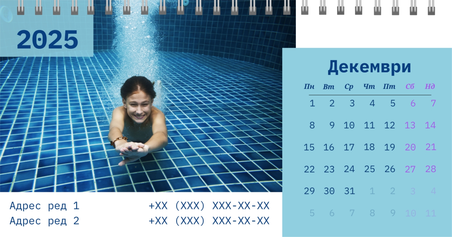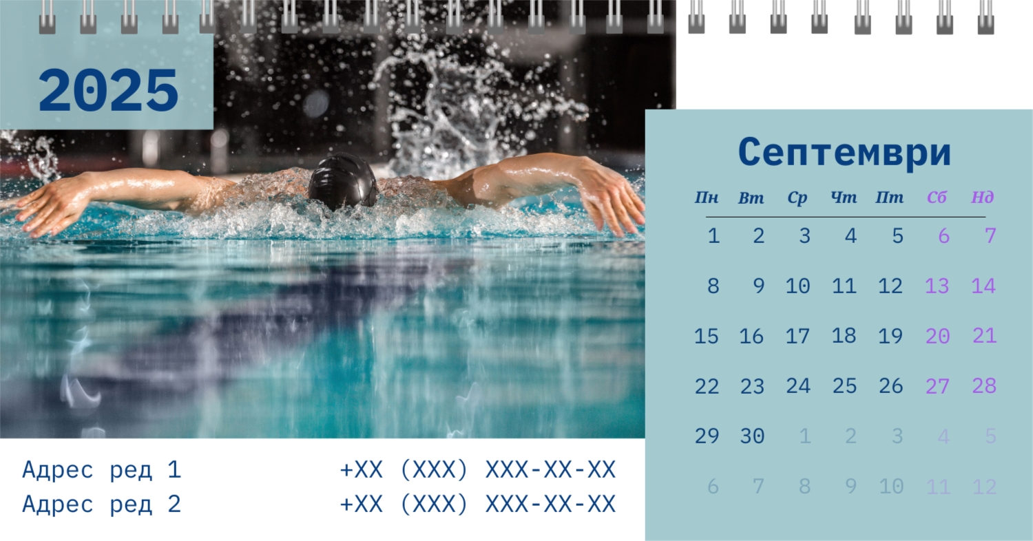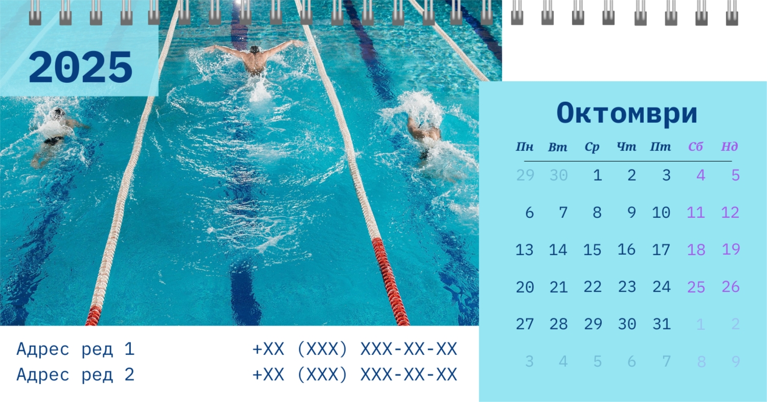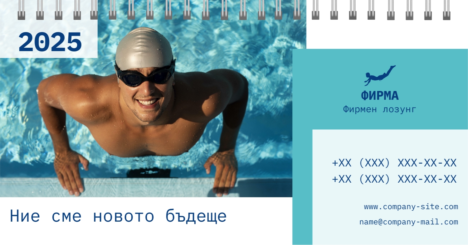 Безплатен шаблон за календар-къща за преобръщане онлайн за реклама на басейн, уроци по плуване. Създайте оформление "направи си сам" в онлайн конструктора на календари.