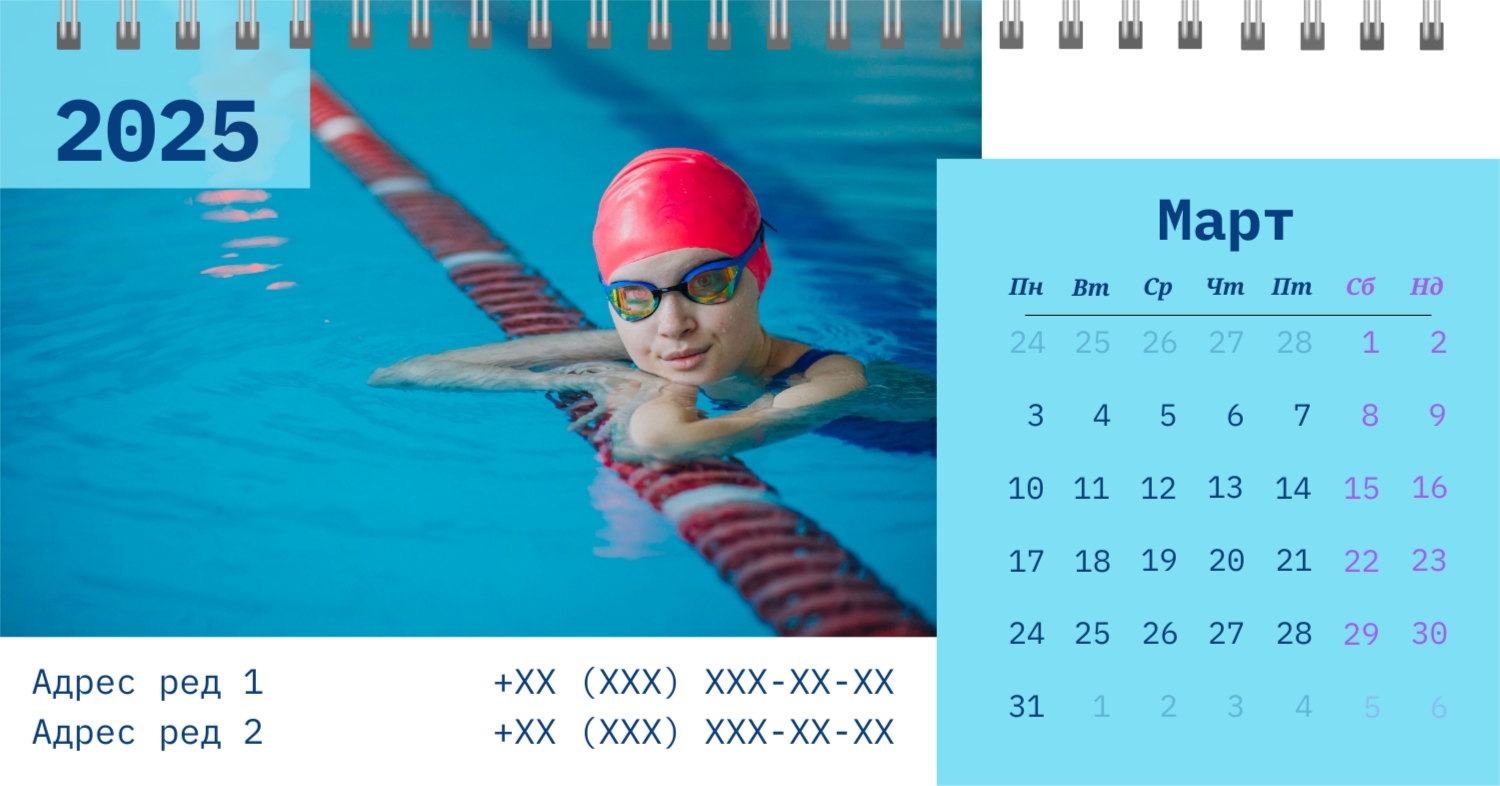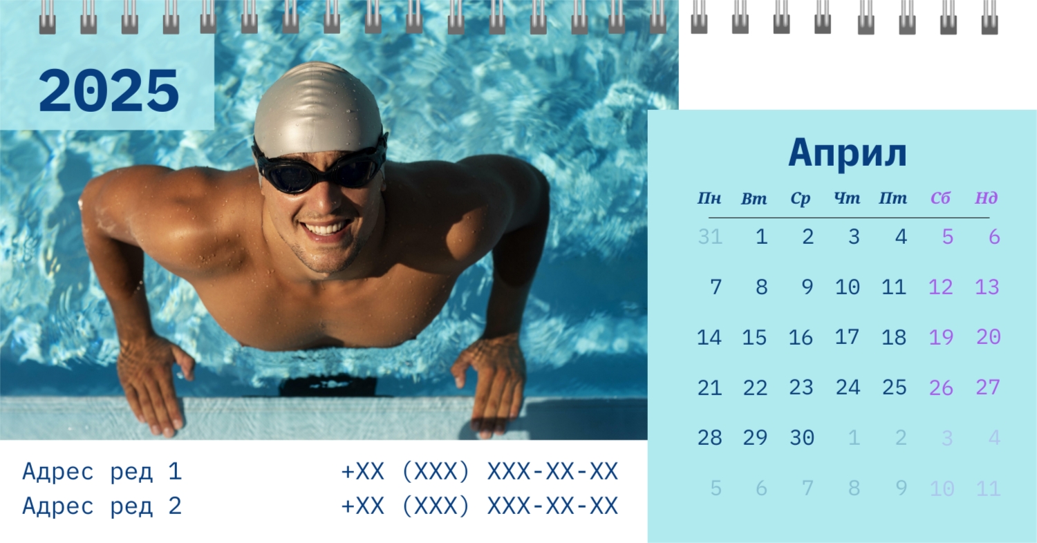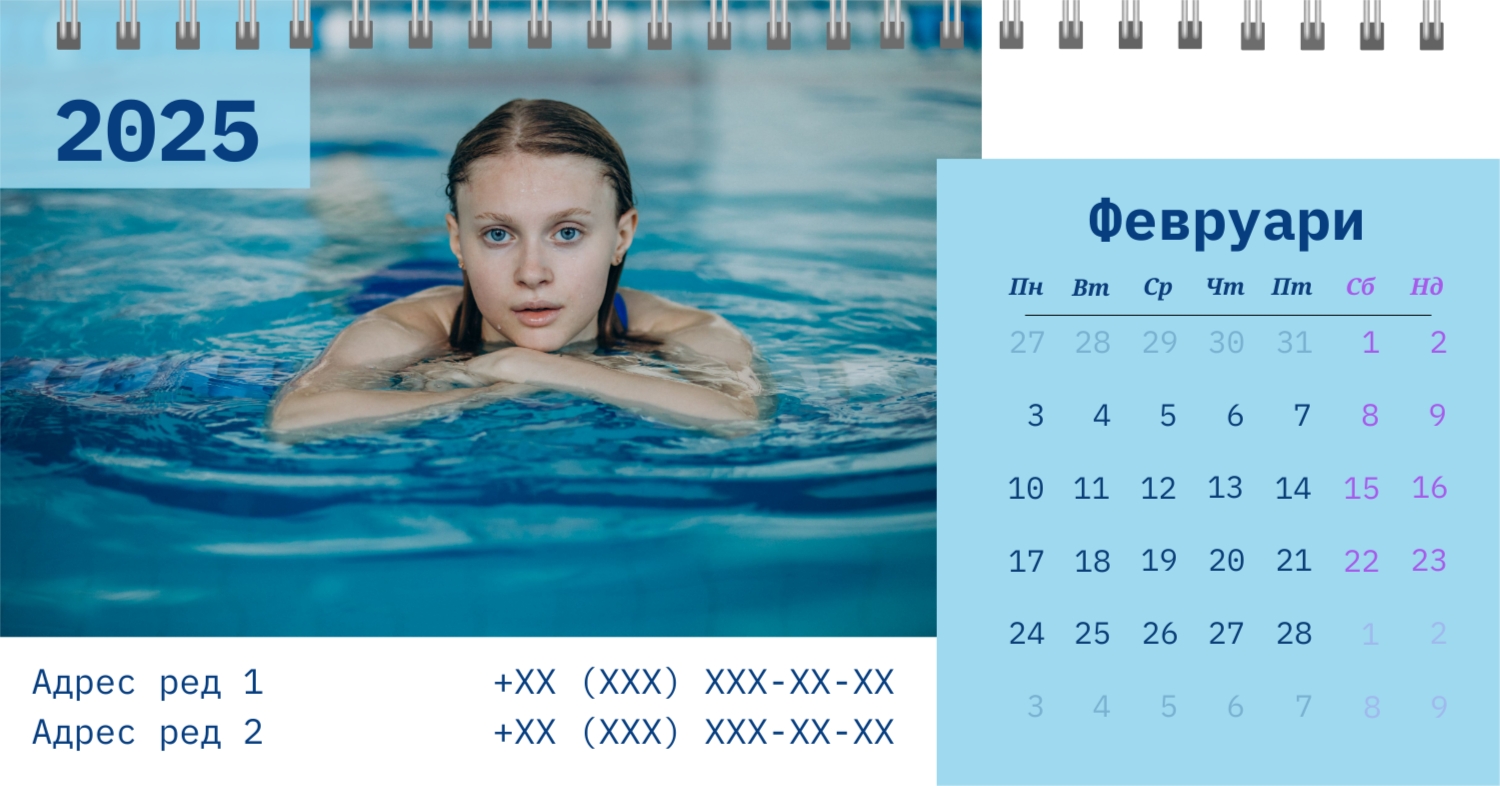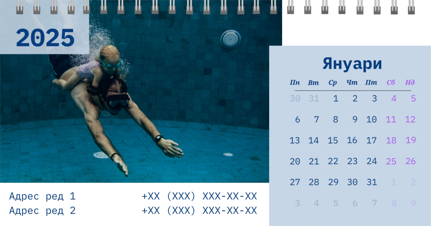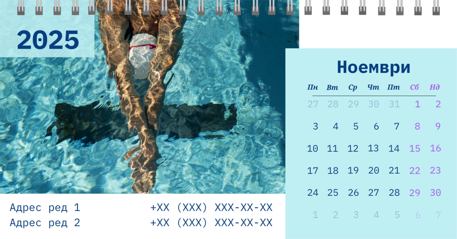 Безплатен шаблон за календар-къща за преобръщане онлайн за реклама на басейн, уроци по плуване. Създайте оформление "направи си сам" в онлайн конструктора на календари.