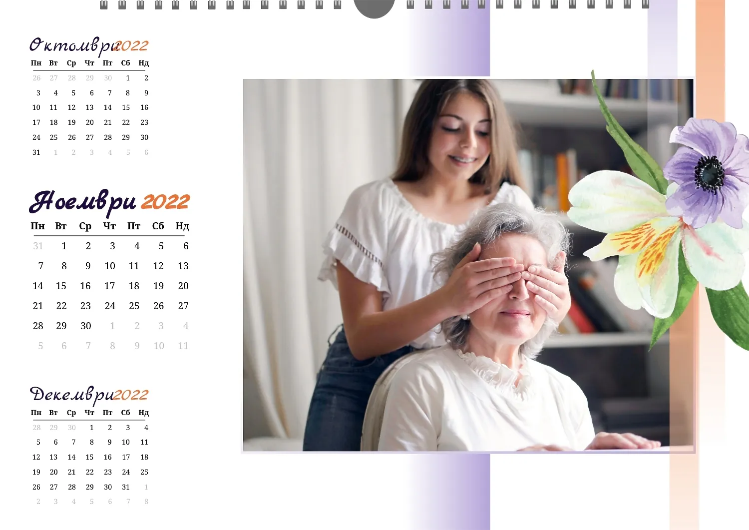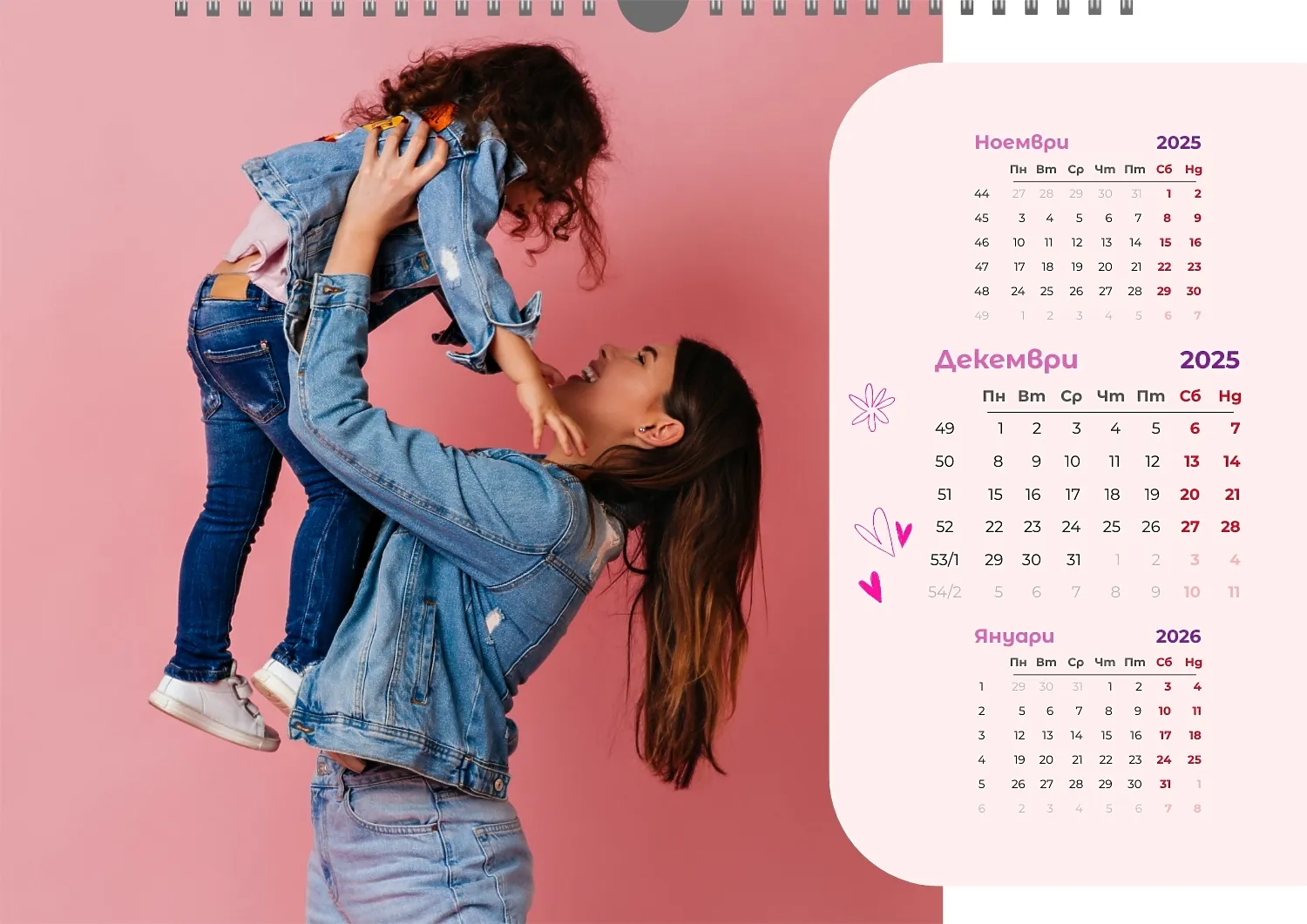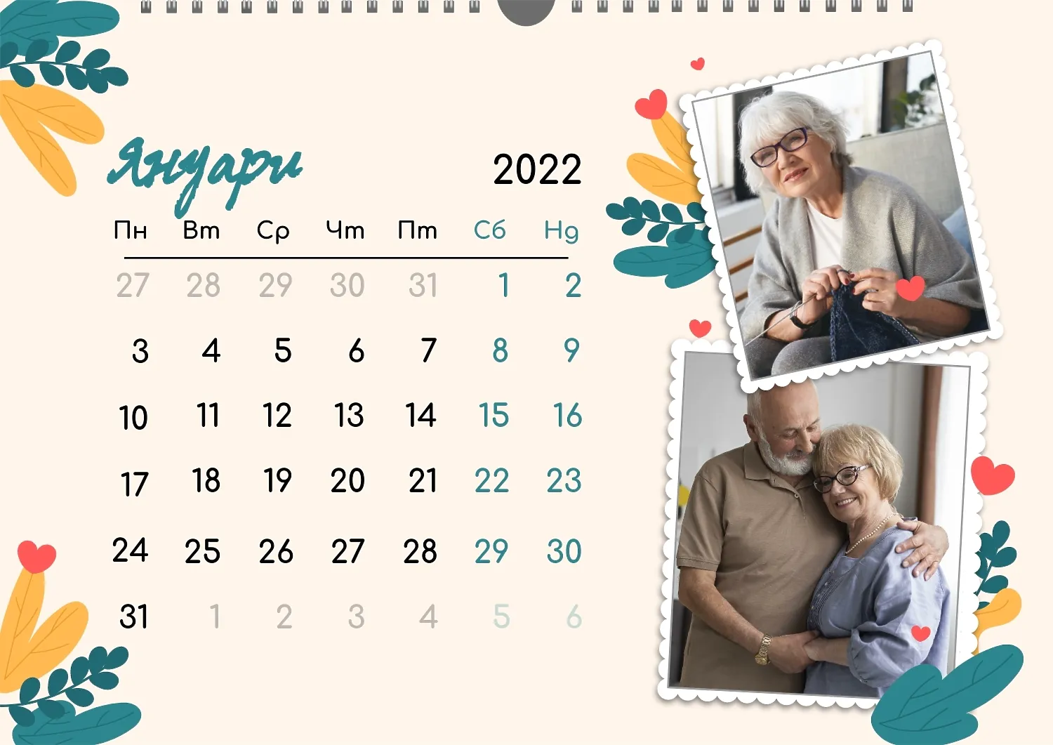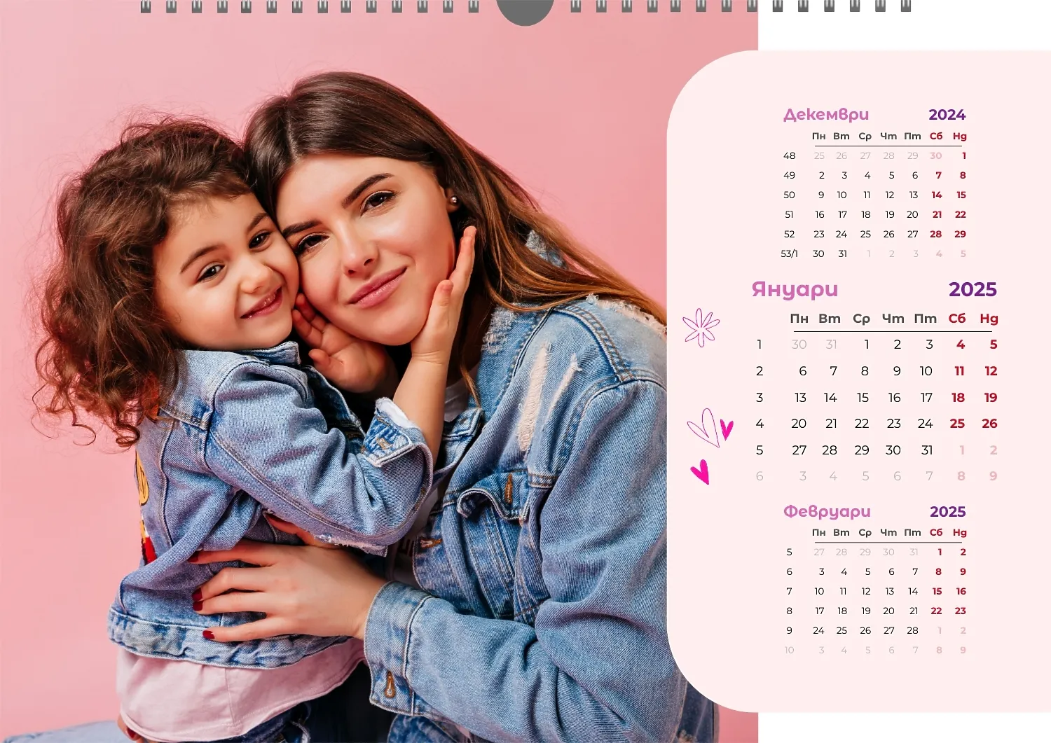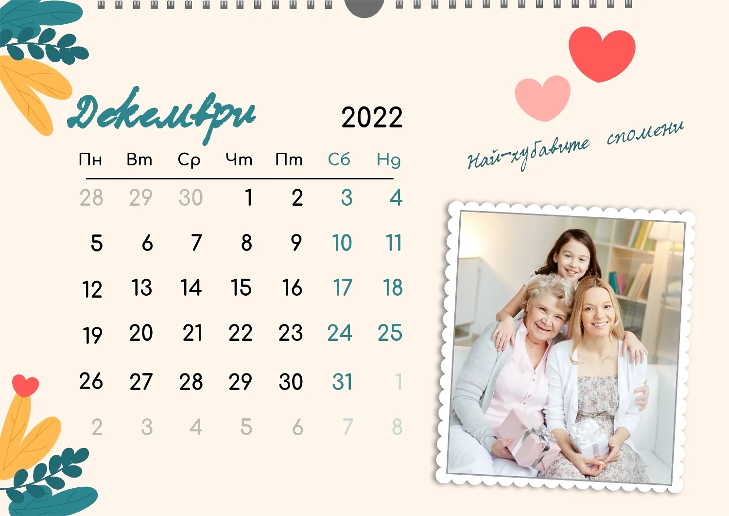 Безплатен шаблон за новогодишен календар като подарък за близки. Създайте оформление със собствените си ръце в конструктора на календари.