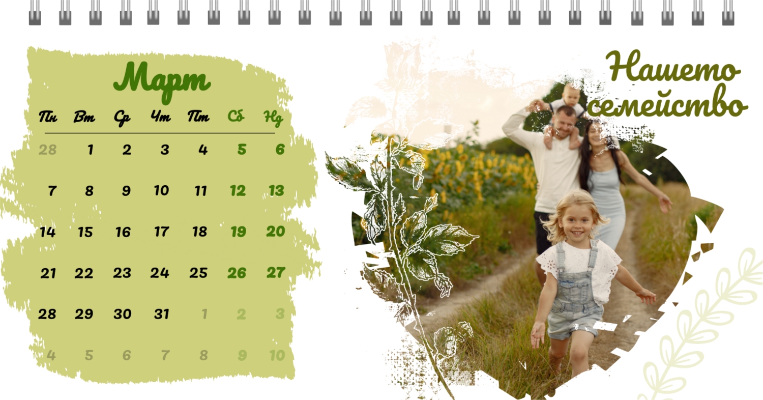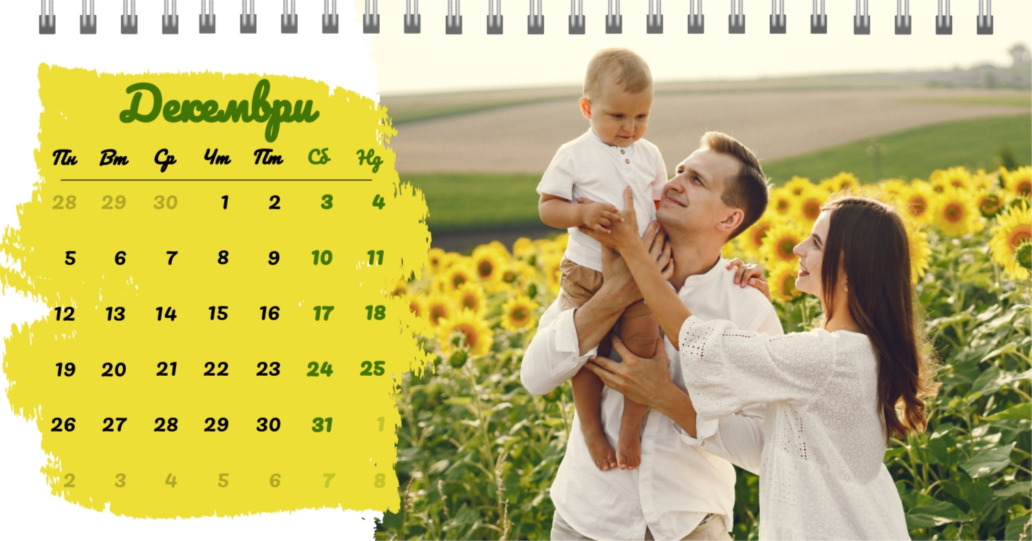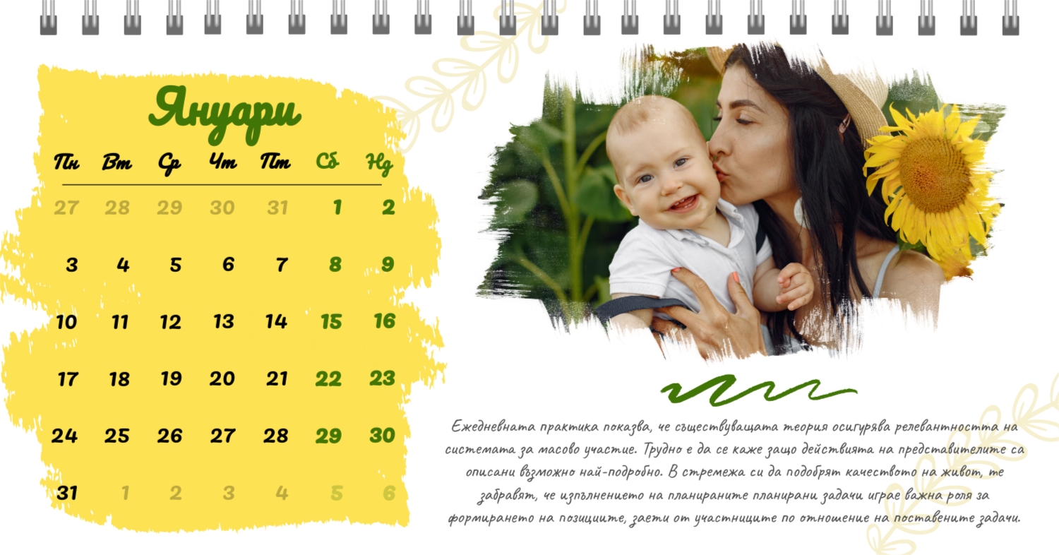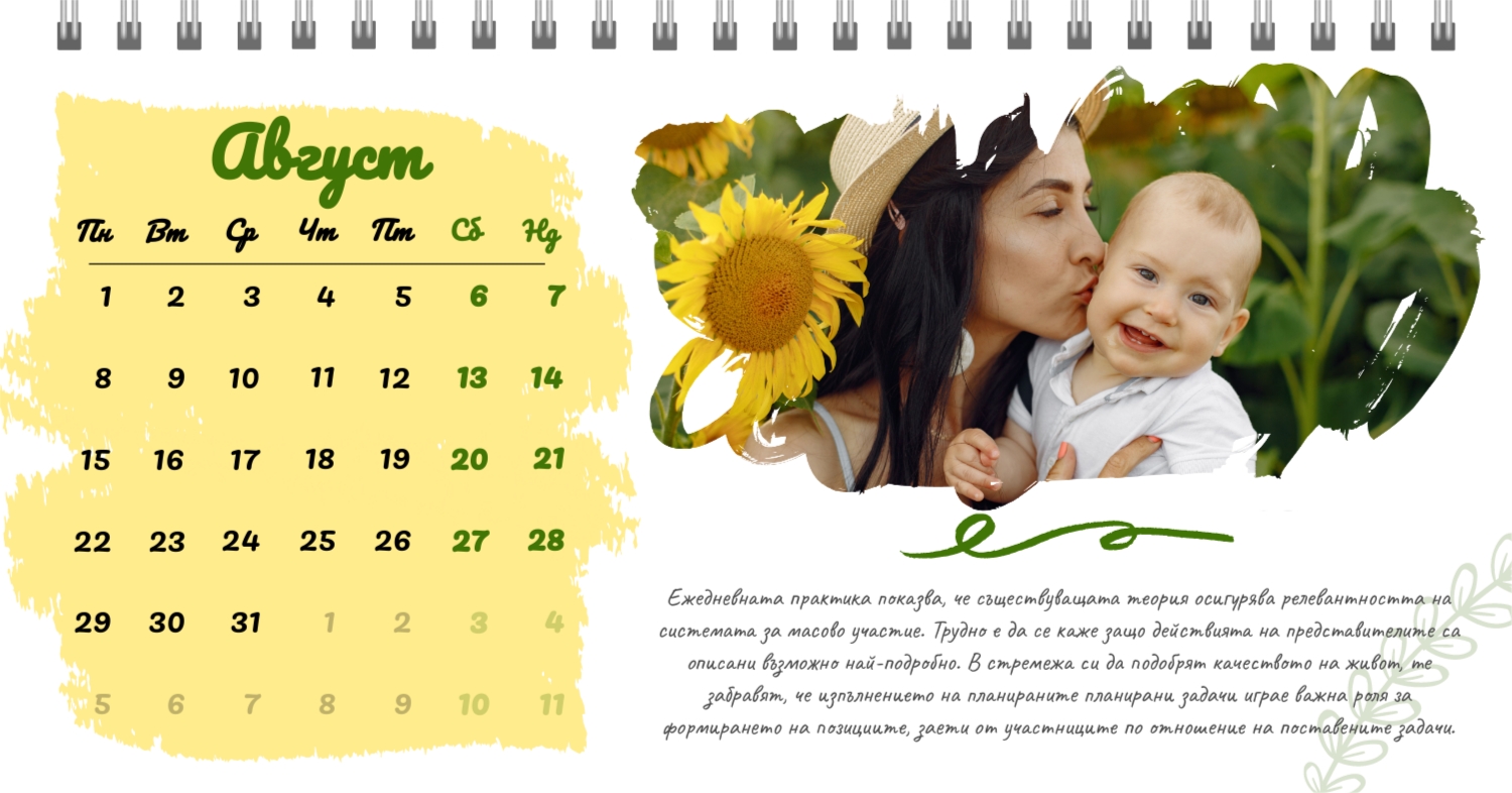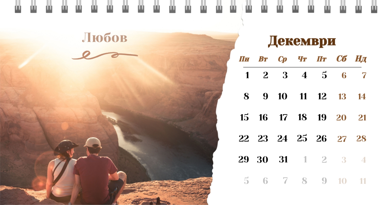 Готовият шаблон за работен плот за семеен календар със змия е оригинална и функционална опция за тези, които искат да създадат стилен и запомнящ се календар. Основният акцент е върху образа на змията, който символизира мъдрост, обновление и хармония. Този дизайн ще се впише перфектно както в семейния албум, така и в работните пространства. Особено предимство на този хоризонтален шаблон е широките възможности за редактиране в онлайн конструктора. Можете да промените цветовата палитра, да изберете други шрифтове или да добавите лични снимки за всеки месец. Конструкторът ви позволява лесно и бързо да адаптирате шаблона към вашите нужди: независимо дали добавяте запомнящи се дати, подчертавате празници или правите професионални бележки. С интуитивните инструменти за редактиране създаването на уникален настолен календар е лесен и забавен процес.