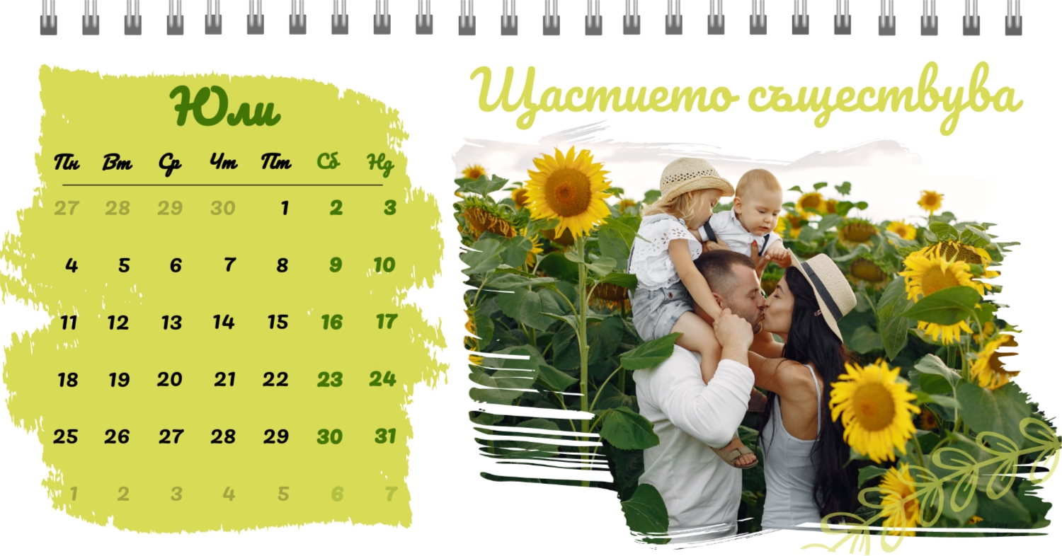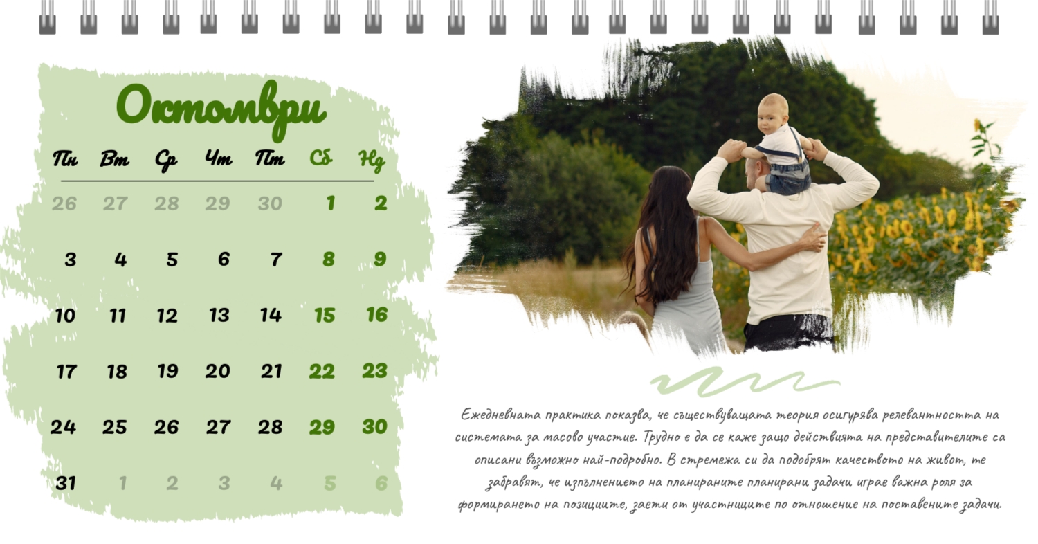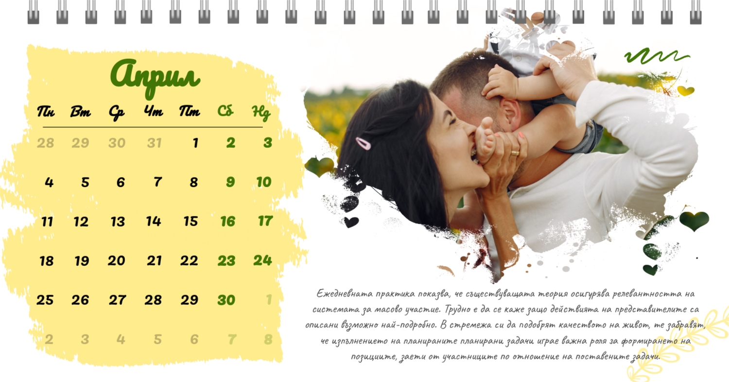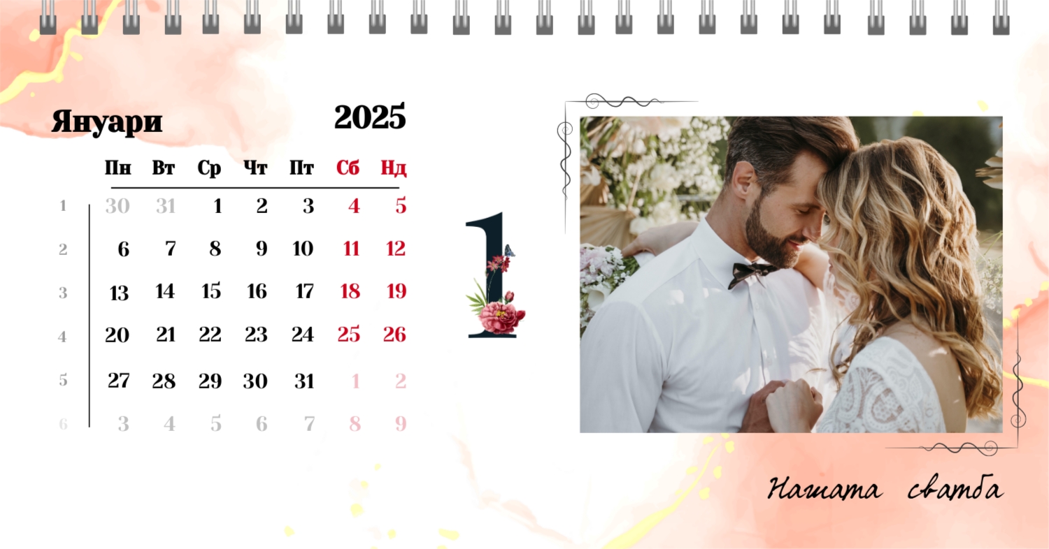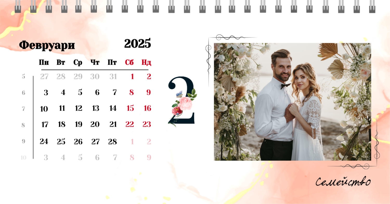 Готовият шаблон за работен плот за семеен календар със змия е оригинална и функционална опция за тези, които искат да създадат стилен и запомнящ се календар. Основният акцент е върху образа на змията, който символизира мъдрост, обновление и хармония. Този дизайн ще се впише перфектно както в семейния албум, така и в работните пространства. Особено предимство на този хоризонтален шаблон е широките възможности за редактиране в онлайн конструктора. Можете да промените цветовата палитра, да изберете други шрифтове или да добавите лични снимки за всеки месец. Конструкторът ви позволява лесно и бързо да адаптирате шаблона към вашите нужди: независимо дали добавяте запомнящи се дати, подчертавате празници или правите професионални бележки. С интуитивните инструменти за редактиране създаването на уникален настолен календар е лесен и забавен процес.