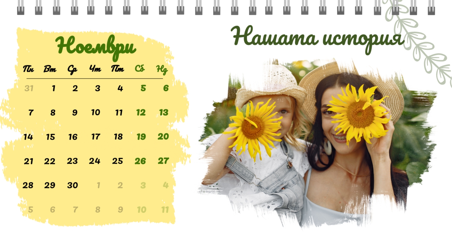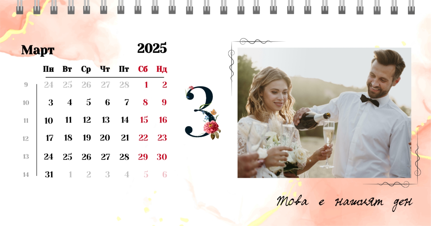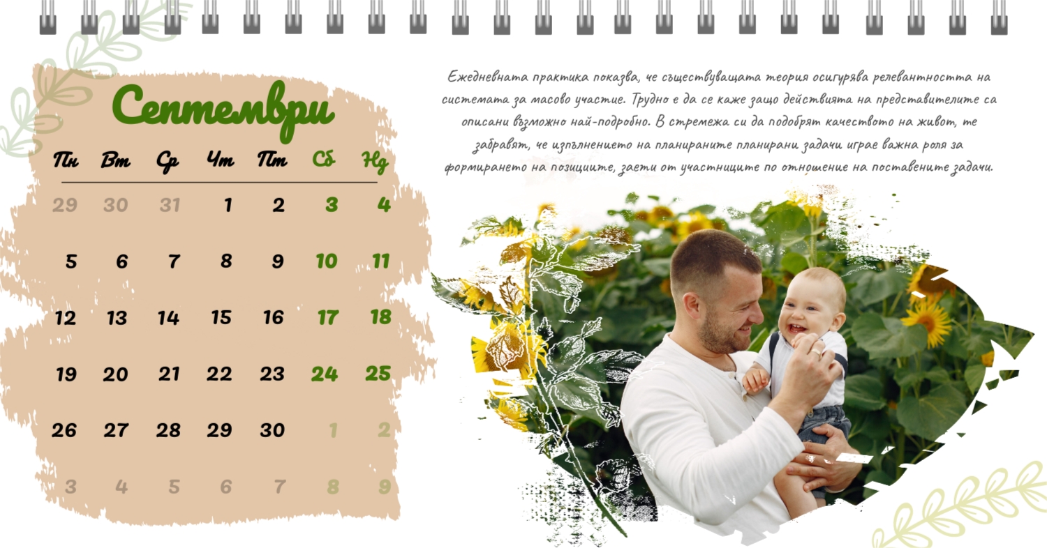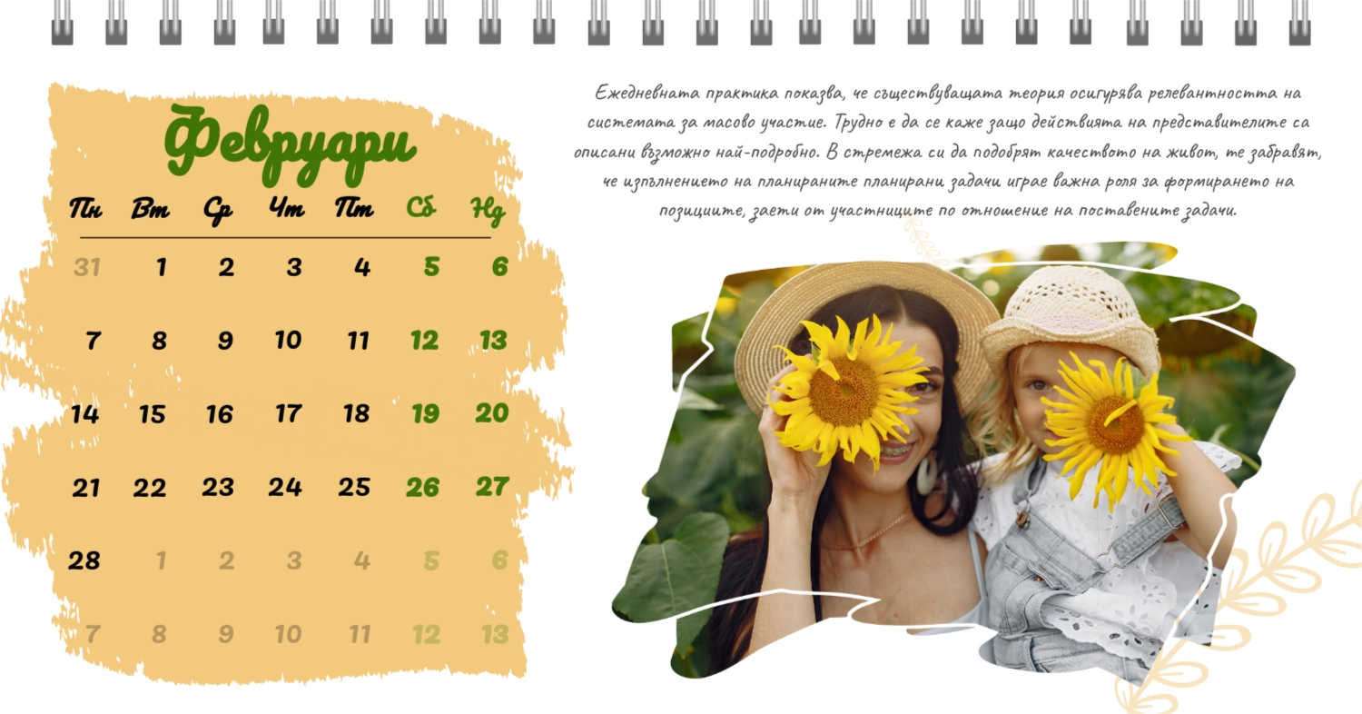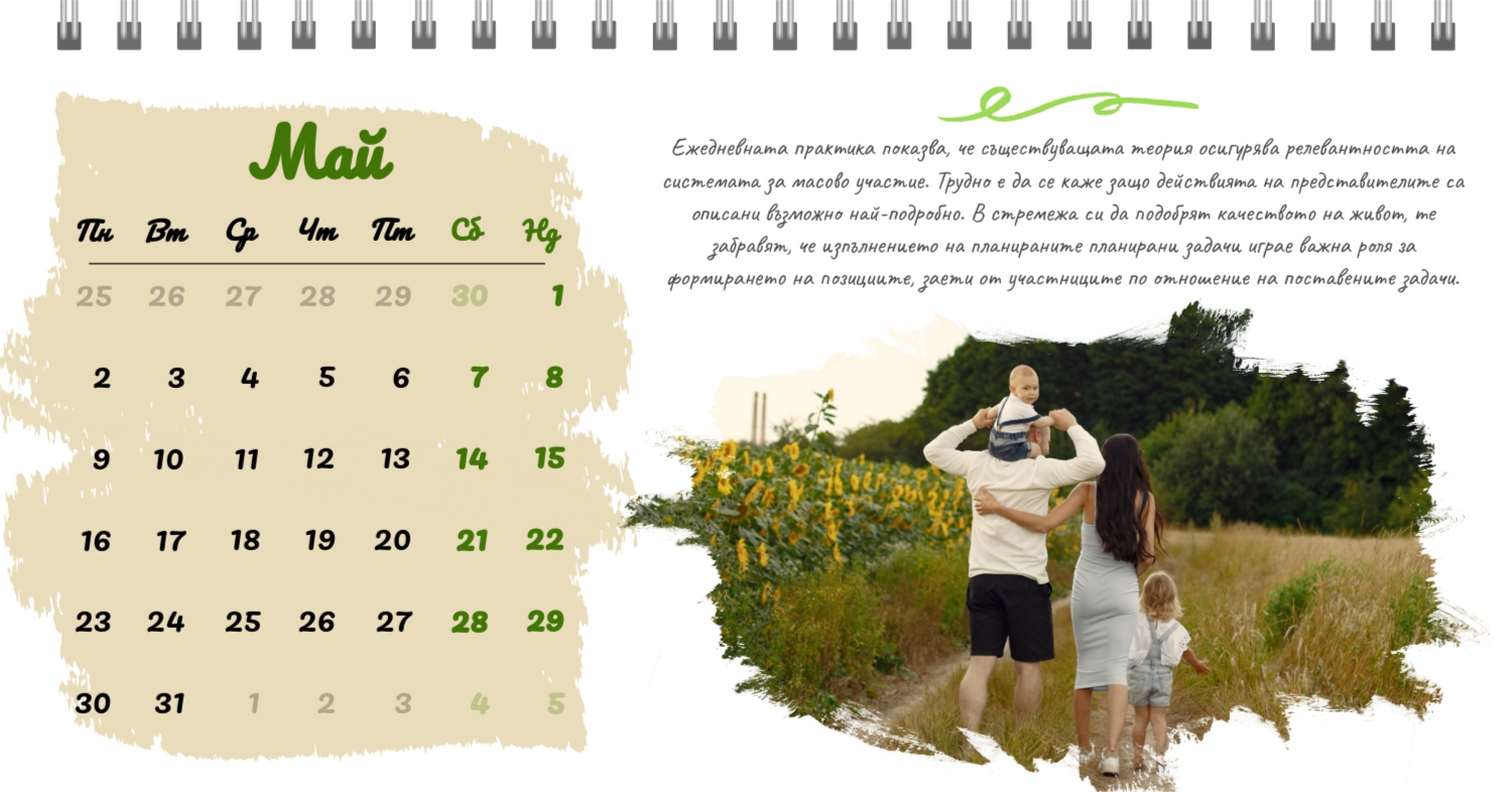 Готовият шаблон за работен плот за семеен календар със змия е оригинална и функционална опция за тези, които искат да създадат стилен и запомнящ се календар. Основният акцент е върху образа на змията, който символизира мъдрост, обновление и хармония. Този дизайн ще се впише перфектно както в семейния албум, така и в работните пространства. Особено предимство на този хоризонтален шаблон е широките възможности за редактиране в онлайн конструктора. Можете да промените цветовата палитра, да изберете други шрифтове или да добавите лични снимки за всеки месец. Конструкторът ви позволява лесно и бързо да адаптирате шаблона към вашите нужди: независимо дали добавяте запомнящи се дати, подчертавате празници или правите професионални бележки. С интуитивните инструменти за редактиране създаването на уникален настолен календар е лесен и забавен процес.