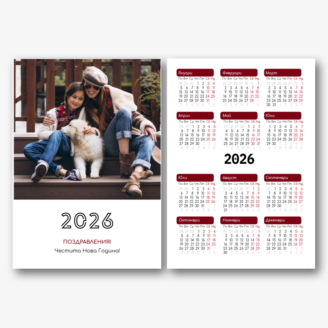 Календарът за семейни снимки е не само практичен инструмент за планиране, но и топло напомняне за най - близките ви хора. Готовият шаблон ви позволява лесно да създадете уникален джобен календар, който ще ви радва през цялата година. Този шаблон е идеален за семейства, които искат да запазят спомени, както и за професионалисти, които ценят индивидуалността и искат да добавят личен щрих към своите проекти. Джобен календар със семейни снимки може да се използва в различни области. Това ще бъде чудесно решение за възпитатели и възпитатели, които създават персонализирани подаръци за родителите. Фотографите могат да предложат на клиентите оригинален начин за запазване на семейни снимки. Също така ще бъде полезно за дизайнери и търговци, работещи върху лични продукти за подаръци или промоции. В нашия уеб дизайнер можете да добавяте свои снимки, да променяте оформлението на елементите, да избирате стила на шрифта и дори да избирате цветовата схема по ваш вкус. Дизайнерът разполага с удобни инструменти, за да ви позволи да настроите календара си възможно най-точно според вашите нужди. Искате ли да оставите повече място за бележки или да подчертаете важни дати? Това е лесно да се направи благодарение на настройките за гъвкавост.