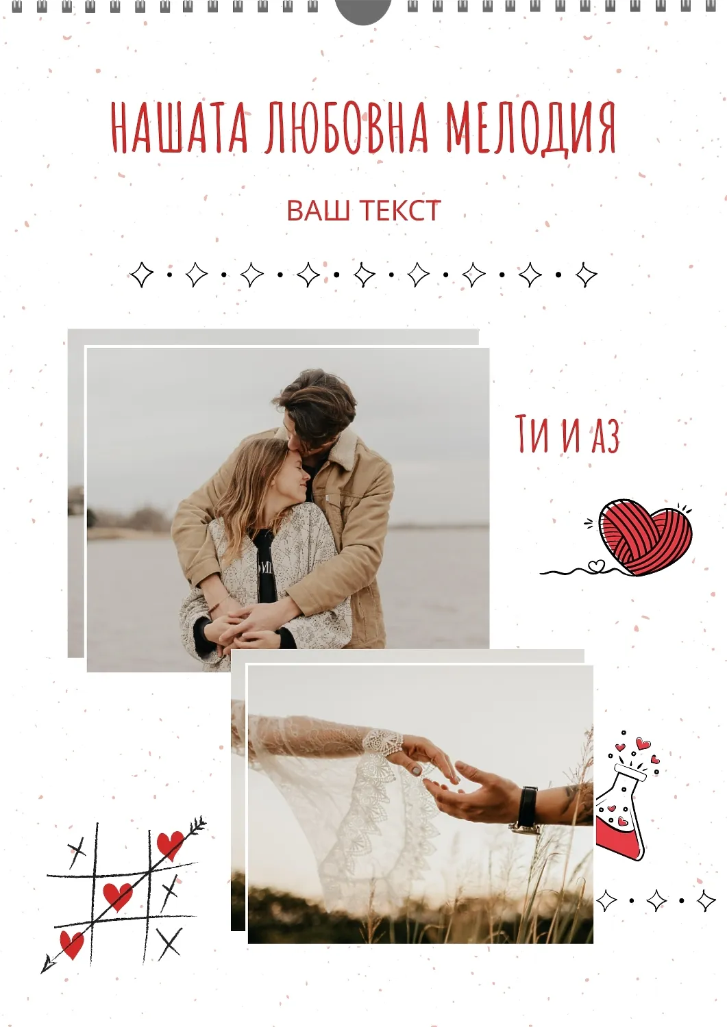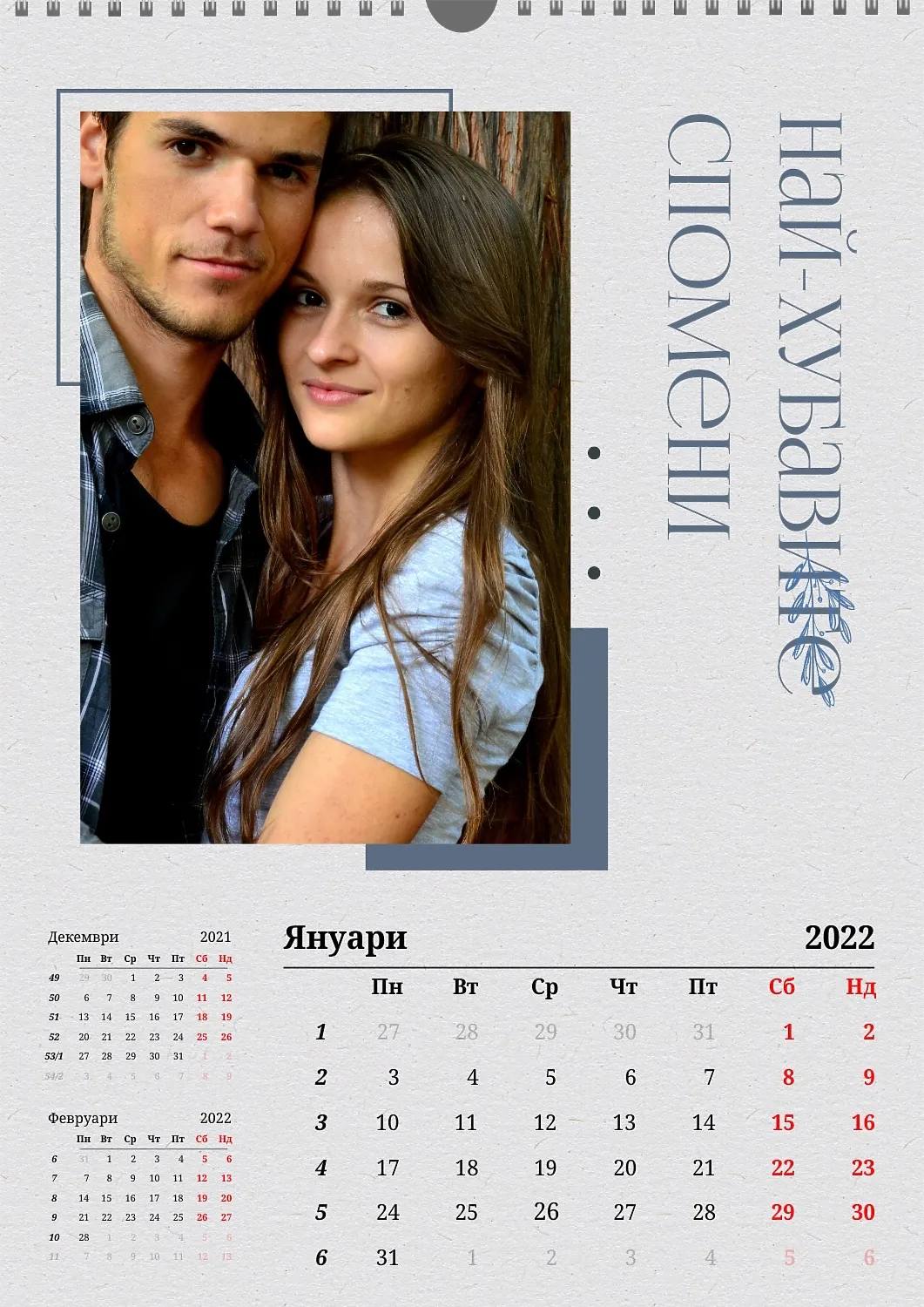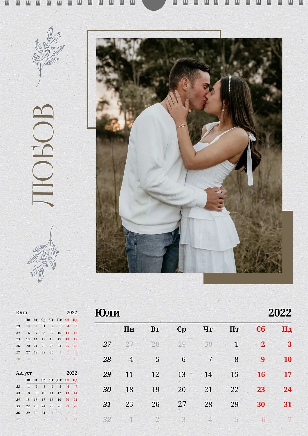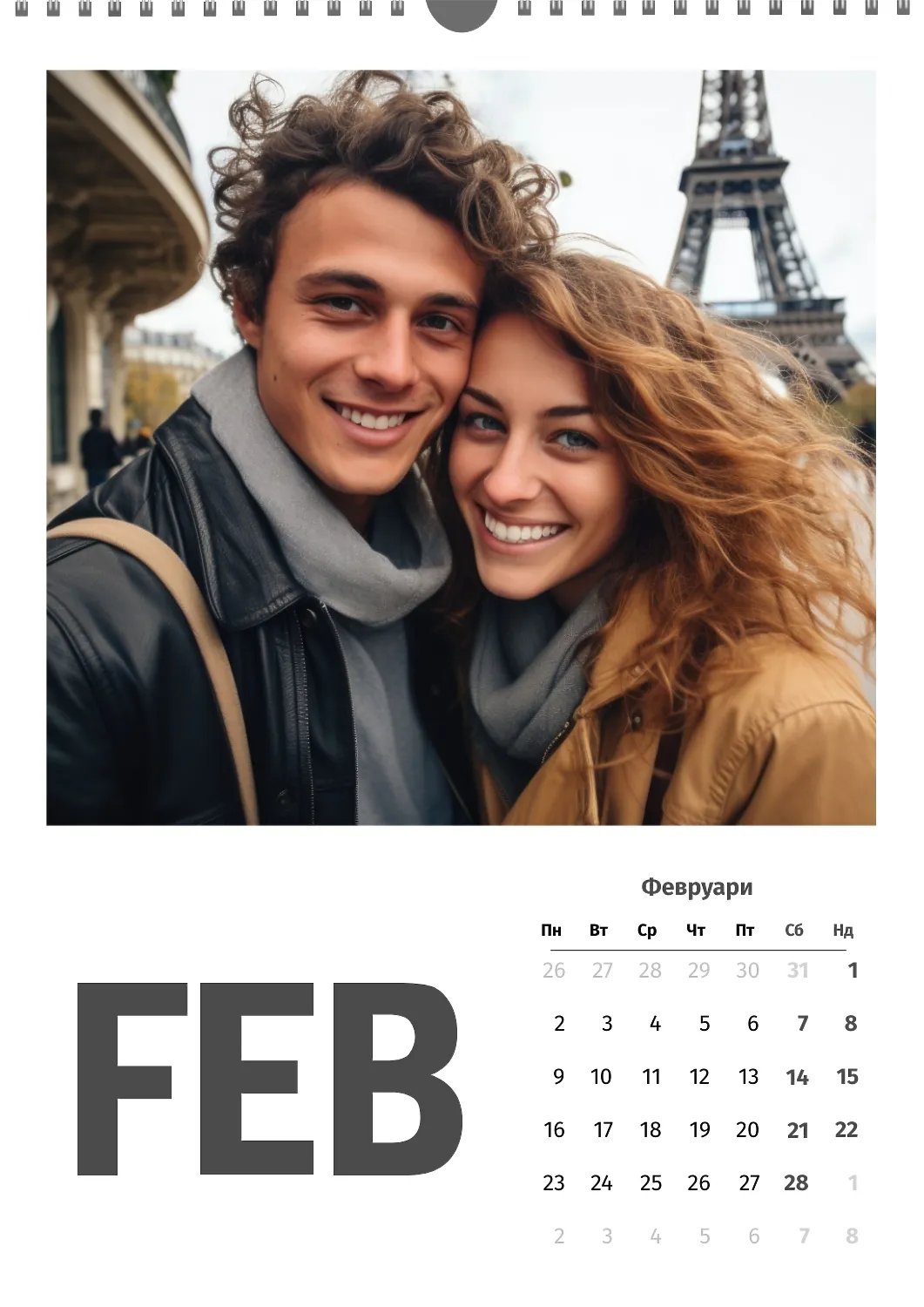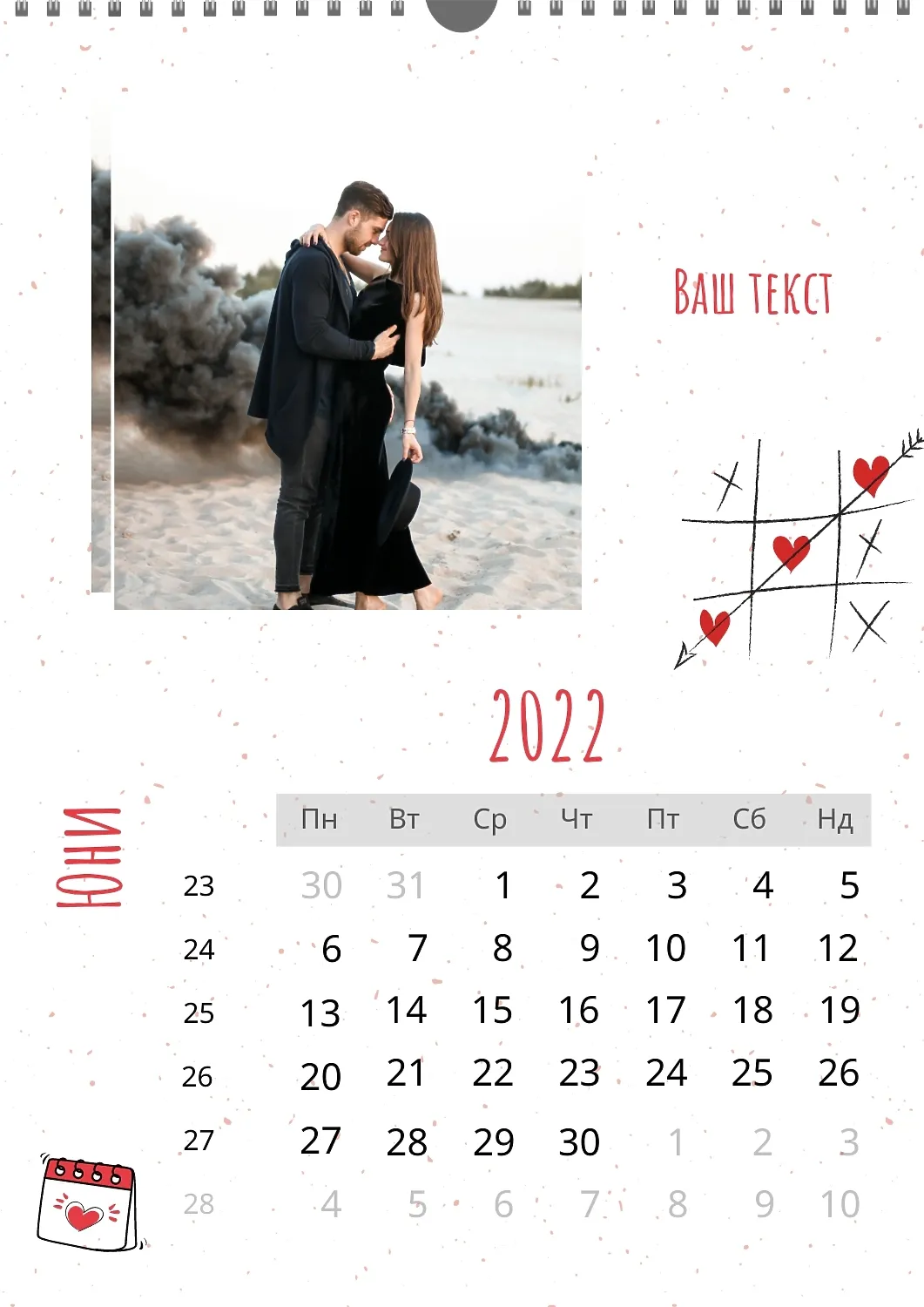Готовият шаблон за календар за влюбена двойка е идеалният начин да създадете уникален и трогателен подарък. Той осигурява романтичен дизайн, който подчертава специалната връзка между партньорите. Такъв календар може да се превърне не само в приятен сувенир, но и в стилен елемент от интериора. Този шаблон е чудесен за фотографи, специализирани в 0, тъй като може да се използва за красиво проектиране на професионални снимки. Също така ще бъде полезно за дизайнери и блогъри, работещи в романтични теми, а също така е идеално за собствениците на сватбени агенции, които искат да предложат на клиентите необичаен подарък. Основното предимство на този календар е възможността за пълна персонализация в нашия онлайн конструктор. Можете да качите вашите снимки, да промените фона, да добавите запомнящи се дати, романтични надписи или дори забавни коментари към всеки месец. Благодарение на простия и интуитивен интерфейс редактирането ще отнеме минимум време, а резултатът ще зарадва с индивидуалност и високо качество. Създавайки такъв календар със собствените си ръце, вие влагате топлина и грижа в него, което го прави наистина специален.