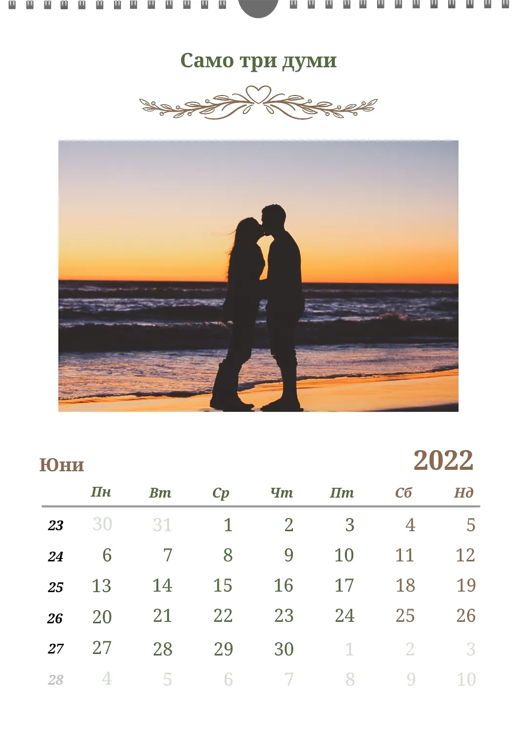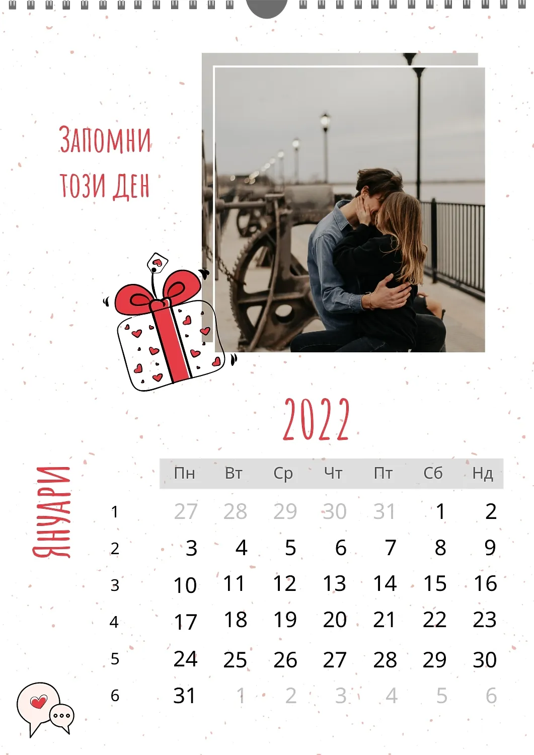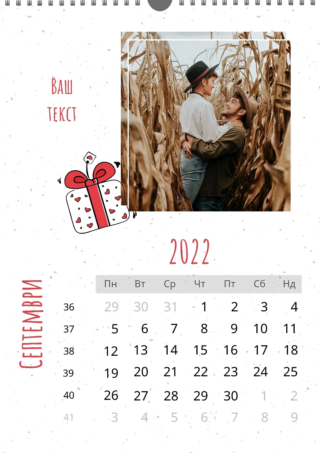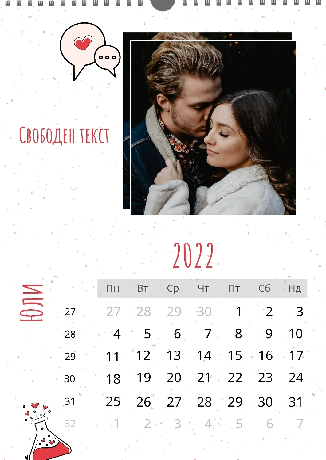 Готовият шаблон за календар за влюбена двойка е идеалният начин да създадете уникален и трогателен подарък. Той осигурява романтичен дизайн, който подчертава специалната връзка между партньорите. Такъв календар може да се превърне не само в приятен сувенир, но и в стилен елемент от интериора. Този шаблон е чудесен за фотографи, специализирани в 0, тъй като може да се използва за красиво проектиране на професионални снимки. Също така ще бъде полезно за дизайнери и блогъри, работещи в романтични теми, а също така е идеално за собствениците на сватбени агенции, които искат да предложат на клиентите необичаен подарък. Основното предимство на този календар е възможността за пълна персонализация в нашия онлайн конструктор. Можете да качите вашите снимки, да промените фона, да добавите запомнящи се дати, романтични надписи или дори забавни коментари към всеки месец. Благодарение на простия и интуитивен интерфейс редактирането ще отнеме минимум време, а резултатът ще зарадва с индивидуалност и високо качество. Създавайки такъв календар със собствените си ръце, вие влагате топлина и грижа в него, което го прави наистина специален.