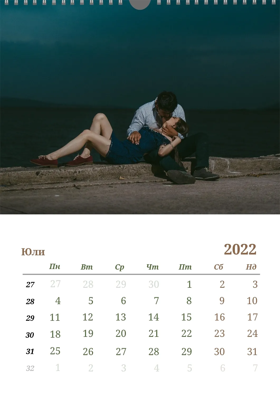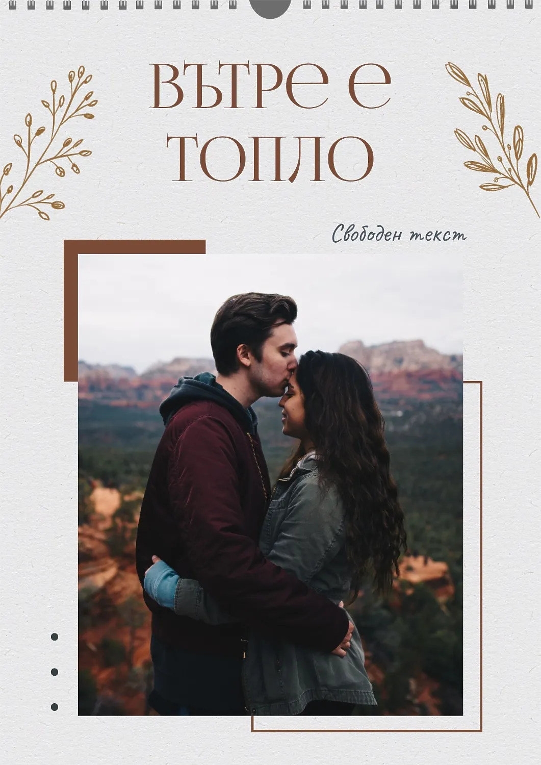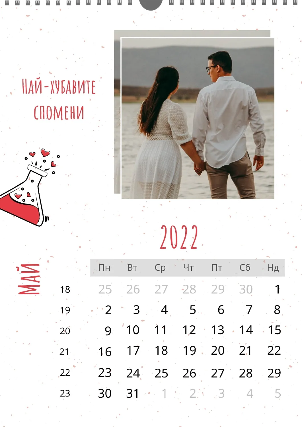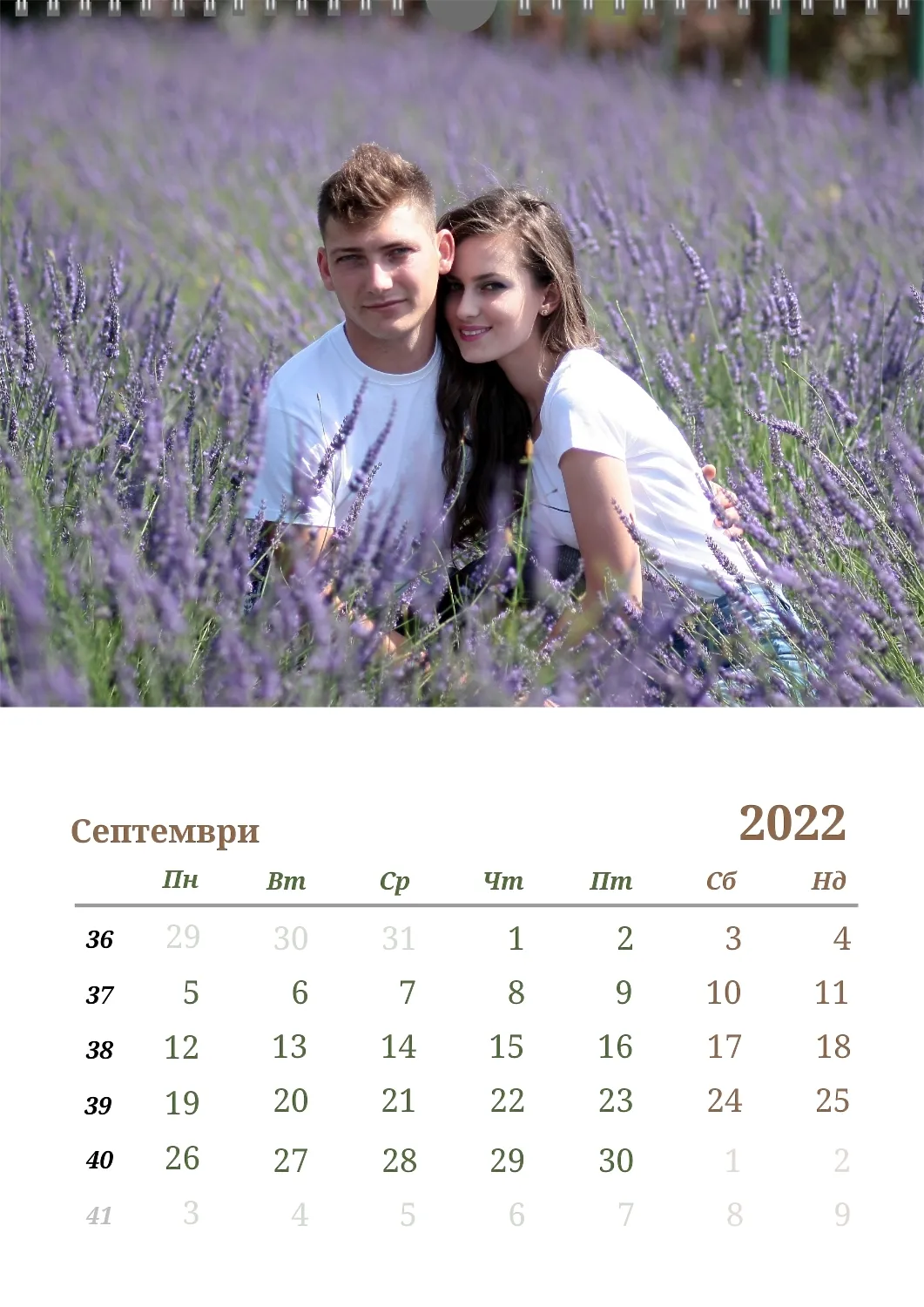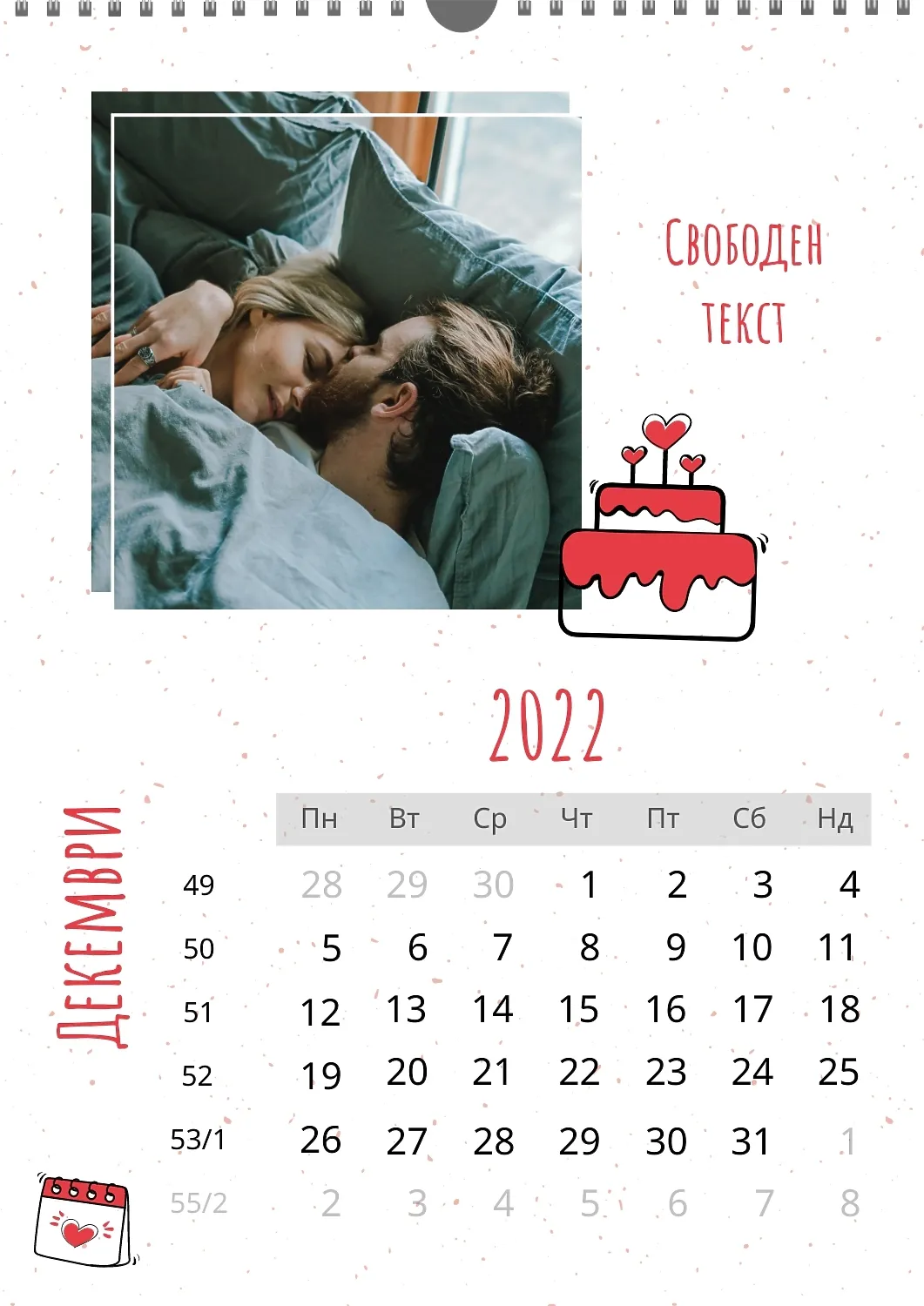 Готовият шаблон за календар за влюбена двойка е идеалният начин да създадете уникален и трогателен подарък. Той осигурява романтичен дизайн, който подчертава специалната връзка между партньорите. Такъв календар може да се превърне не само в приятен сувенир, но и в стилен елемент от интериора. Този шаблон е чудесен за фотографи, специализирани в 0, тъй като може да се използва за красиво проектиране на професионални снимки. Също така ще бъде полезно за дизайнери и блогъри, работещи в романтични теми, а също така е идеално за собствениците на сватбени агенции, които искат да предложат на клиентите необичаен подарък. Основното предимство на този календар е възможността за пълна персонализация в нашия онлайн конструктор. Можете да качите вашите снимки, да промените фона, да добавите запомнящи се дати, романтични надписи или дори забавни коментари към всеки месец. Благодарение на простия и интуитивен интерфейс редактирането ще отнеме минимум време, а резултатът ще зарадва с индивидуалност и високо качество. Създавайки такъв календар със собствените си ръце, вие влагате топлина и грижа в него, което го прави наистина специален.