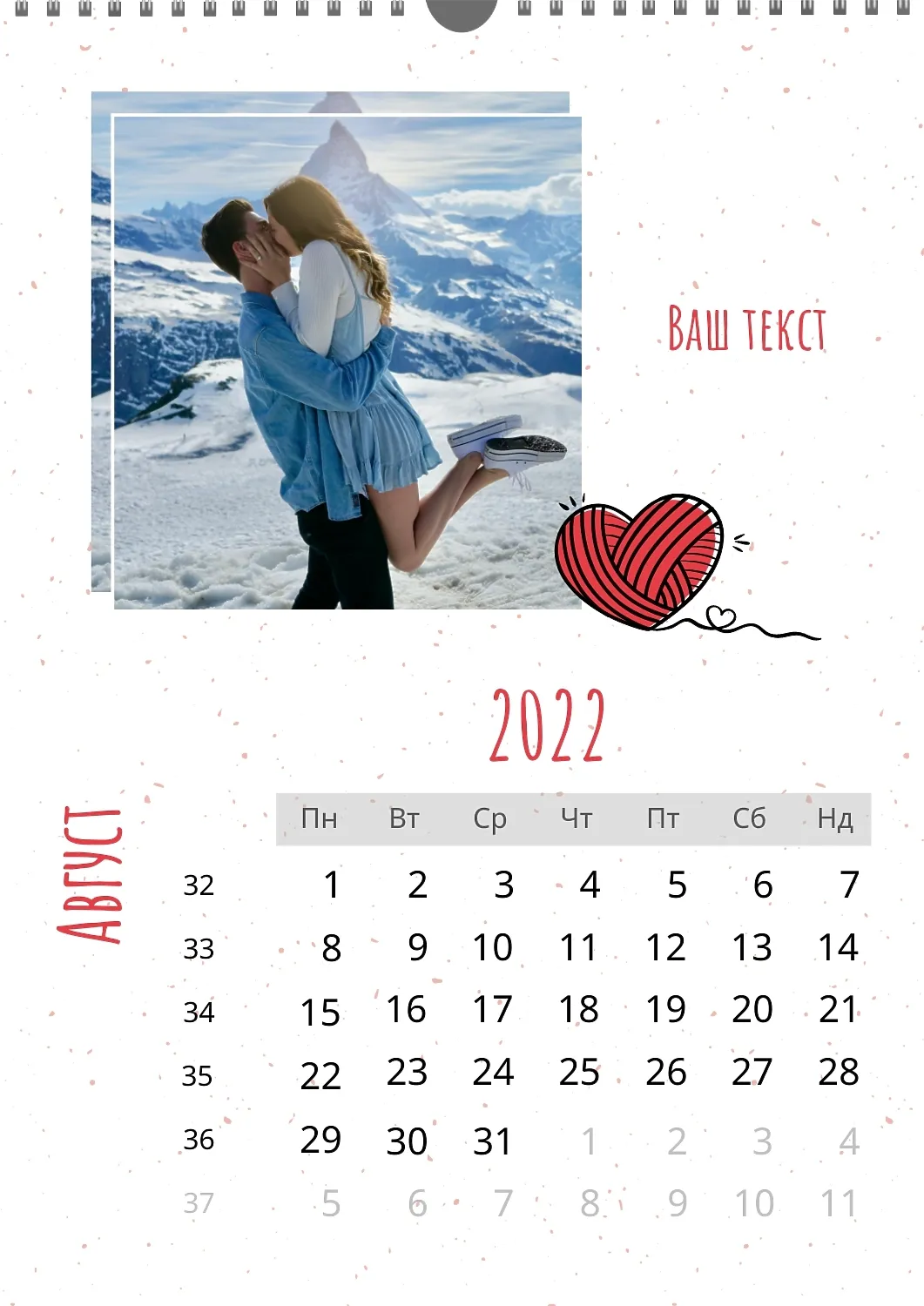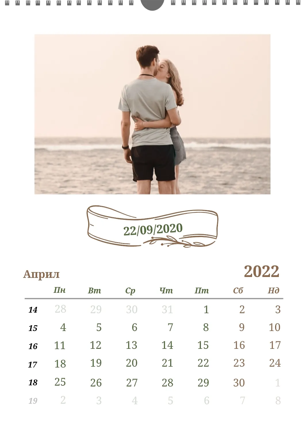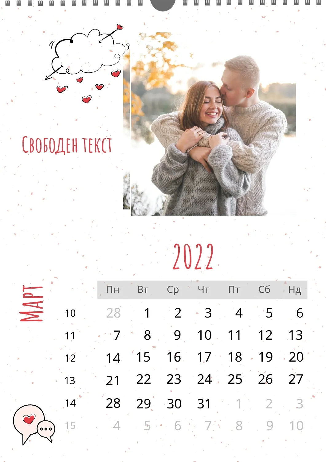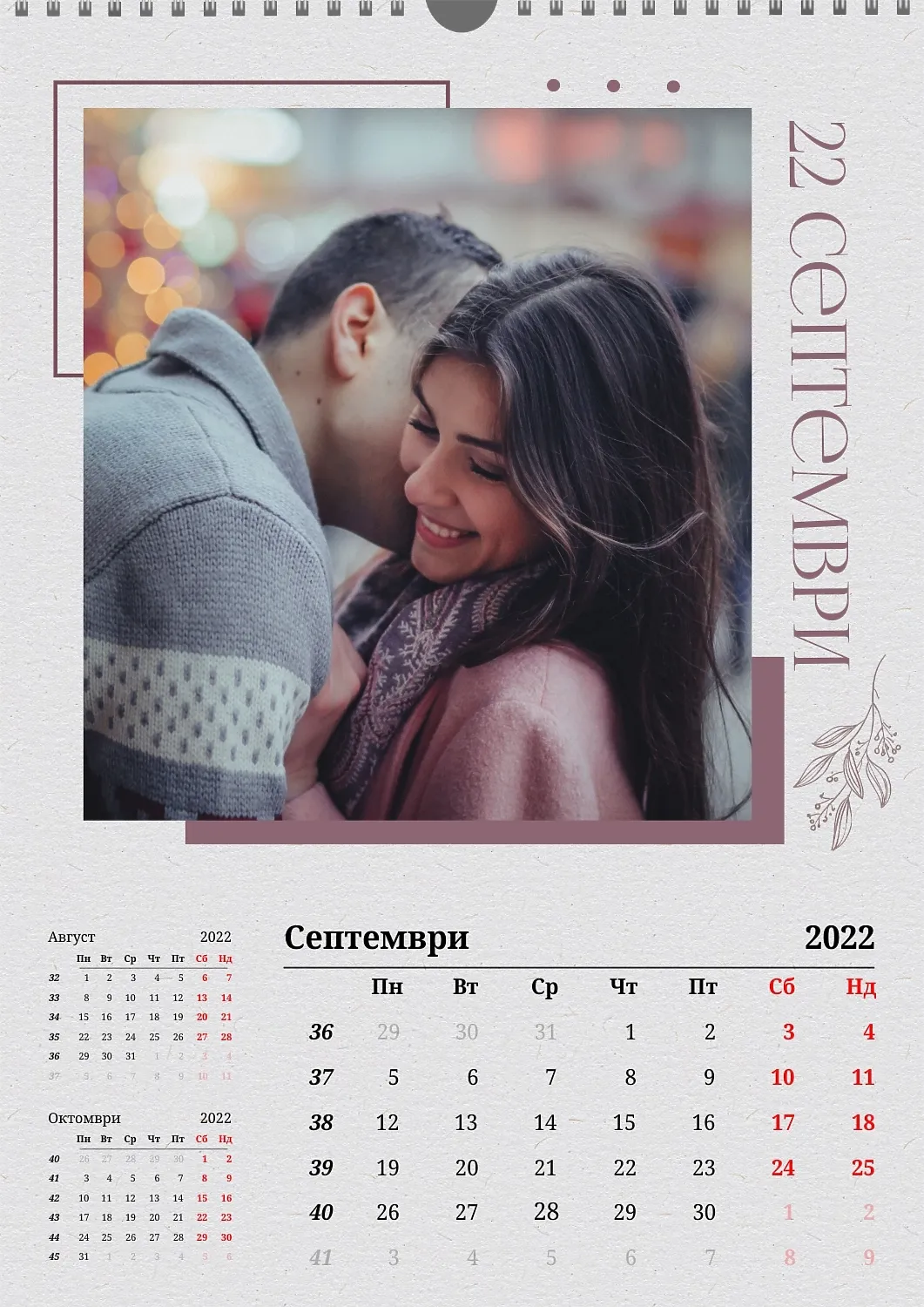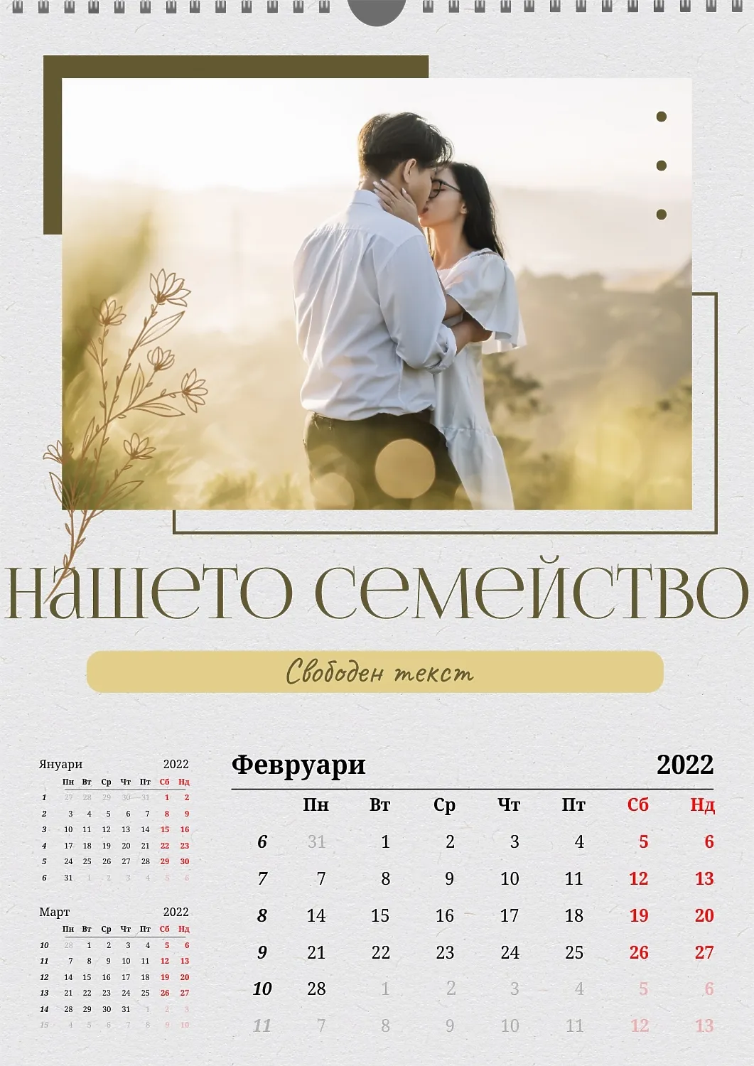 Готовият шаблон за календар за влюбена двойка е идеалният начин да създадете уникален и трогателен подарък. Той осигурява романтичен дизайн, който подчертава специалната връзка между партньорите. Такъв календар може да се превърне не само в приятен сувенир, но и в стилен елемент от интериора. Този шаблон е чудесен за фотографи, специализирани в 0, тъй като може да се използва за красиво проектиране на професионални снимки. Също така ще бъде полезно за дизайнери и блогъри, работещи в романтични теми, а също така е идеално за собствениците на сватбени агенции, които искат да предложат на клиентите необичаен подарък. Основното предимство на този календар е възможността за пълна персонализация в нашия онлайн конструктор. Можете да качите вашите снимки, да промените фона, да добавите запомнящи се дати, романтични надписи или дори забавни коментари към всеки месец. Благодарение на простия и интуитивен интерфейс редактирането ще отнеме минимум време, а резултатът ще зарадва с индивидуалност и високо качество. Създавайки такъв календар със собствените си ръце, вие влагате топлина и грижа в него, което го прави наистина специален.