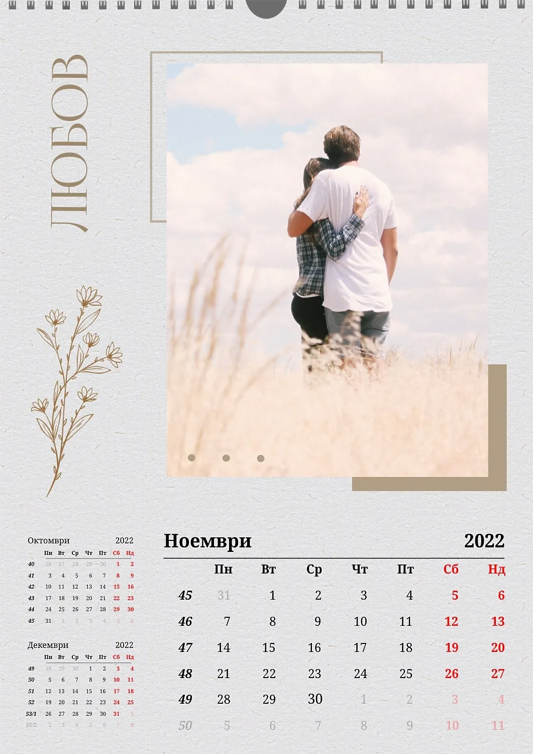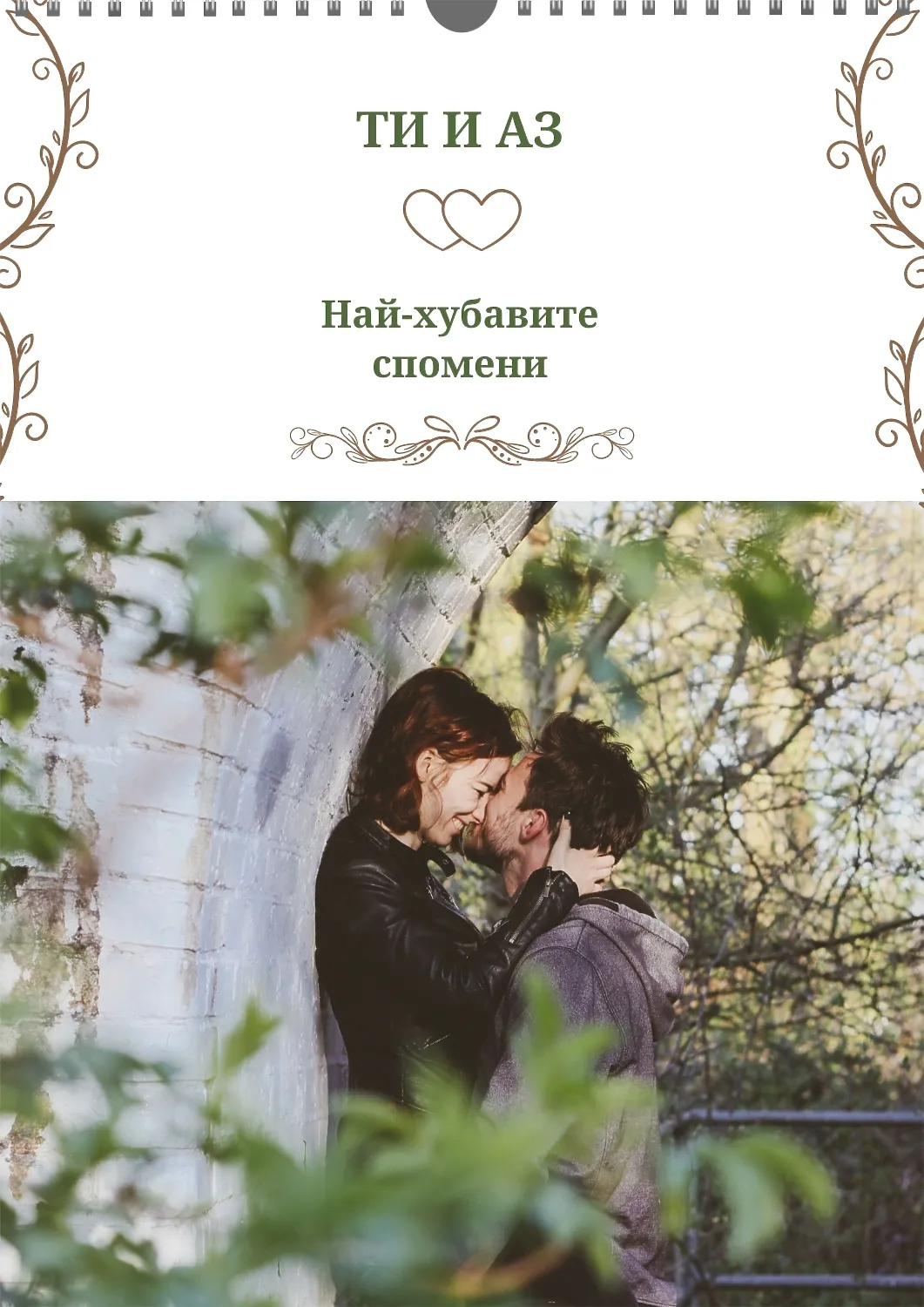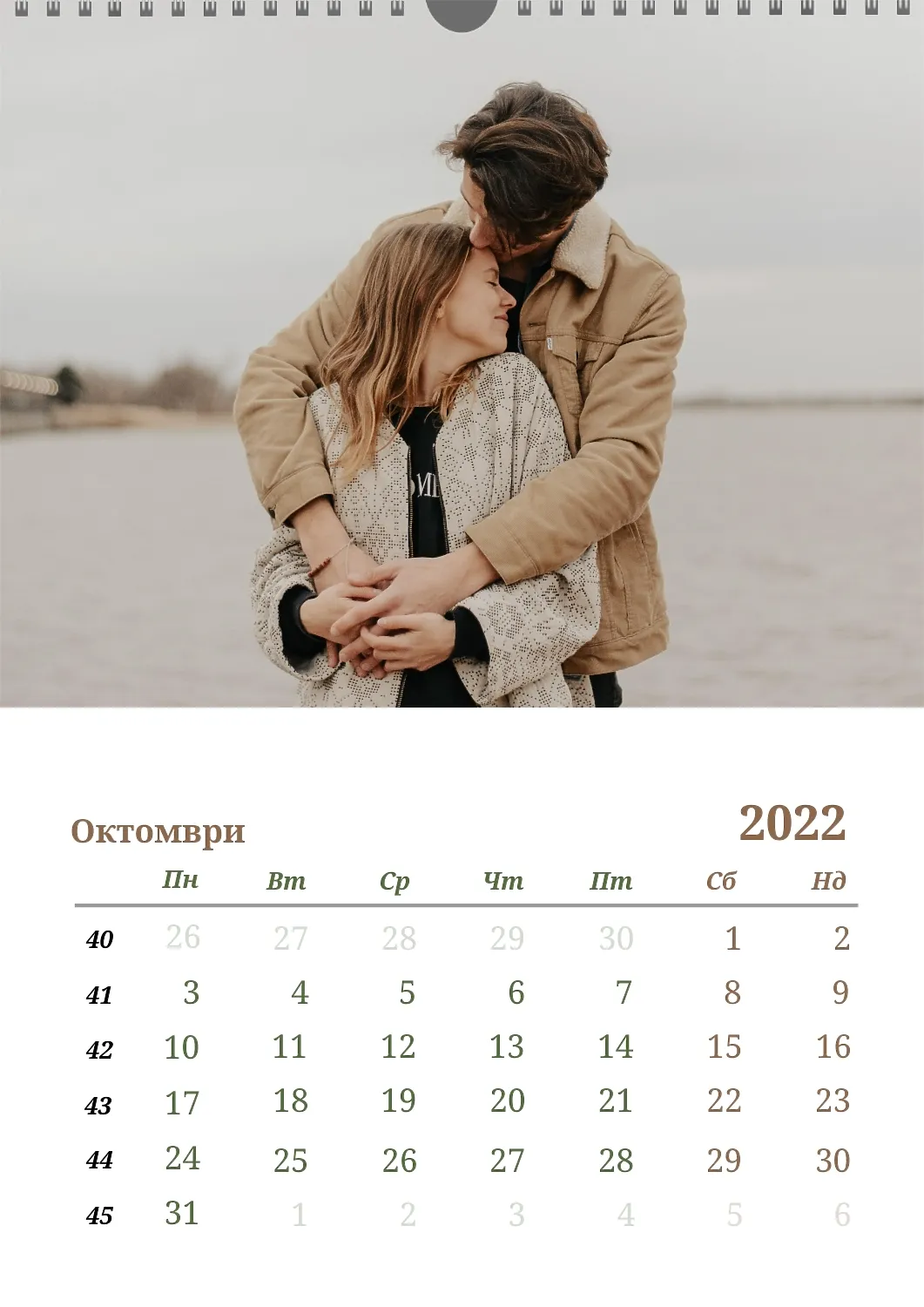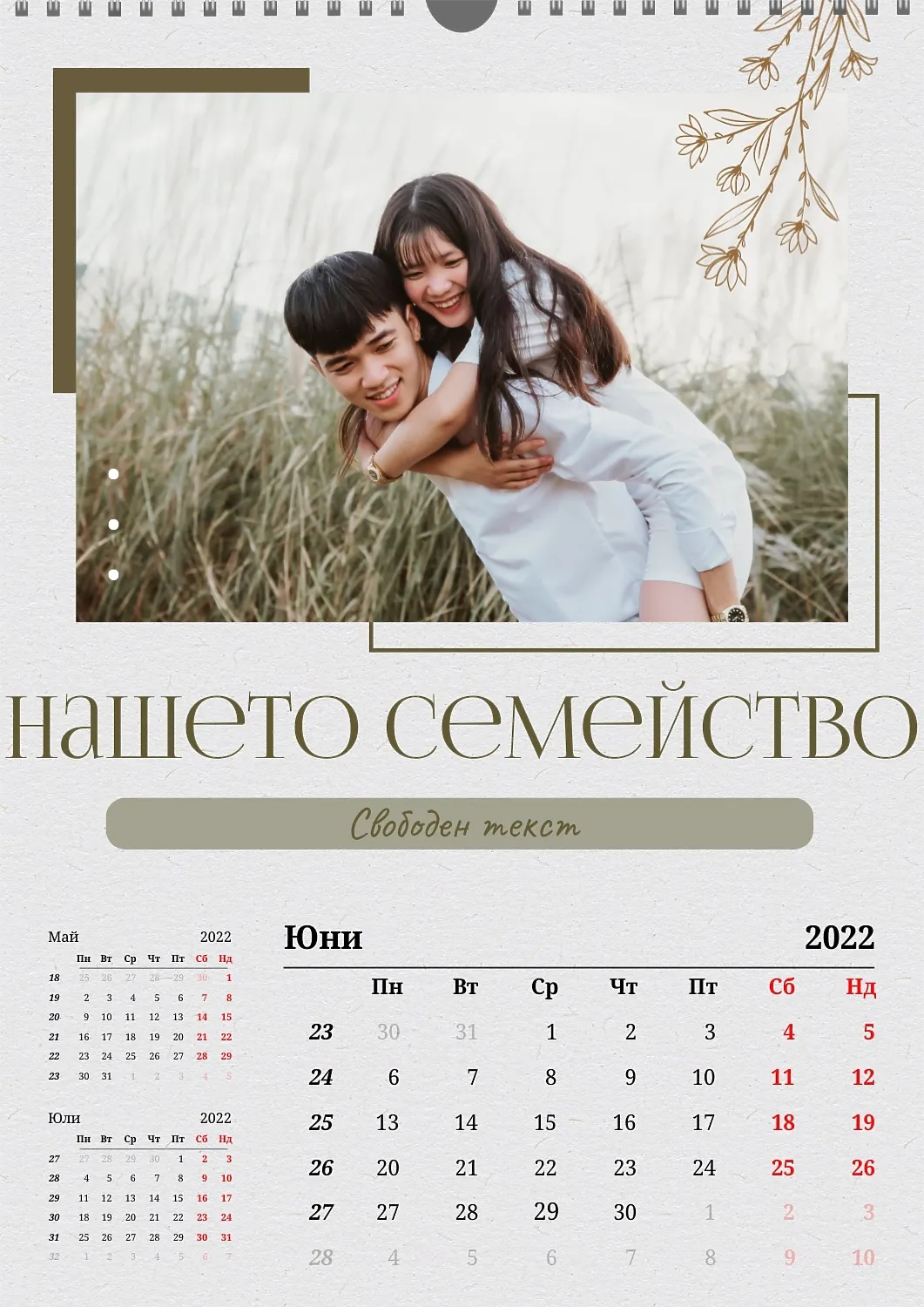 Готовият шаблон за календар за влюбена двойка е идеалният начин да създадете уникален и трогателен подарък. Той осигурява романтичен дизайн, който подчертава специалната връзка между партньорите. Такъв календар може да се превърне не само в приятен сувенир, но и в стилен елемент от интериора. Този шаблон е чудесен за фотографи, специализирани в 0, тъй като може да се използва за красиво проектиране на професионални снимки. Също така ще бъде полезно за дизайнери и блогъри, работещи в романтични теми, а също така е идеално за собствениците на сватбени агенции, които искат да предложат на клиентите необичаен подарък. Основното предимство на този календар е възможността за пълна персонализация в нашия онлайн конструктор. Можете да качите вашите снимки, да промените фона, да добавите запомнящи се дати, романтични надписи или дори забавни коментари към всеки месец. Благодарение на простия и интуитивен интерфейс редактирането ще отнеме минимум време, а резултатът ще зарадва с индивидуалност и високо качество. Създавайки такъв календар със собствените си ръце, вие влагате топлина и грижа в него, което го прави наистина специален.