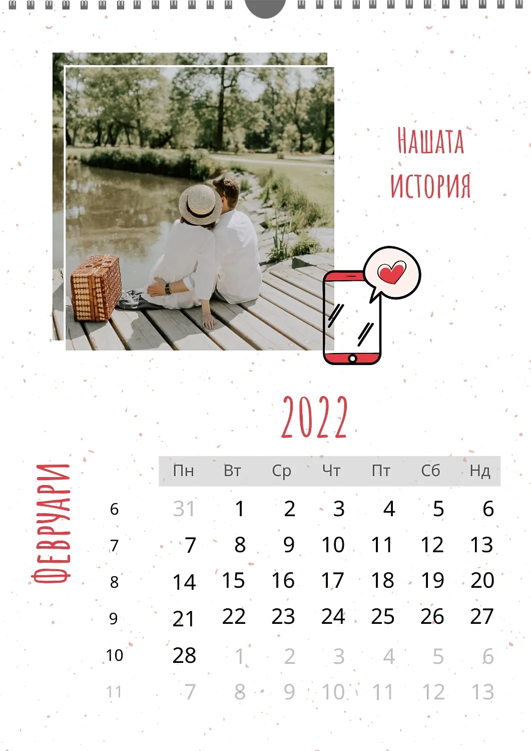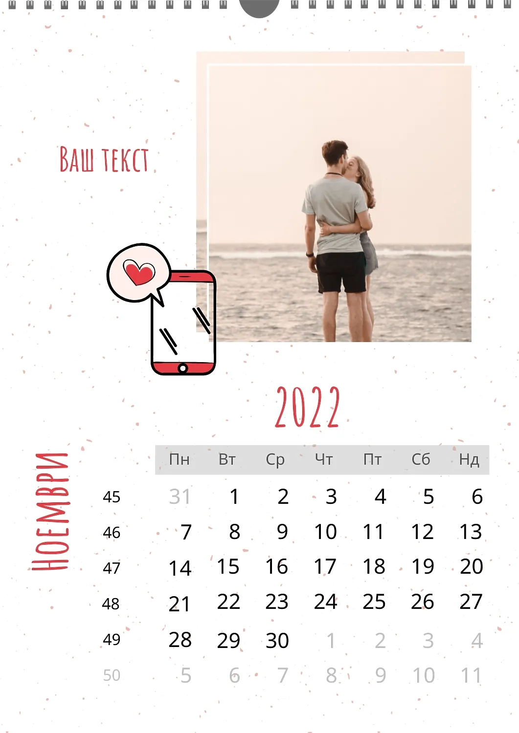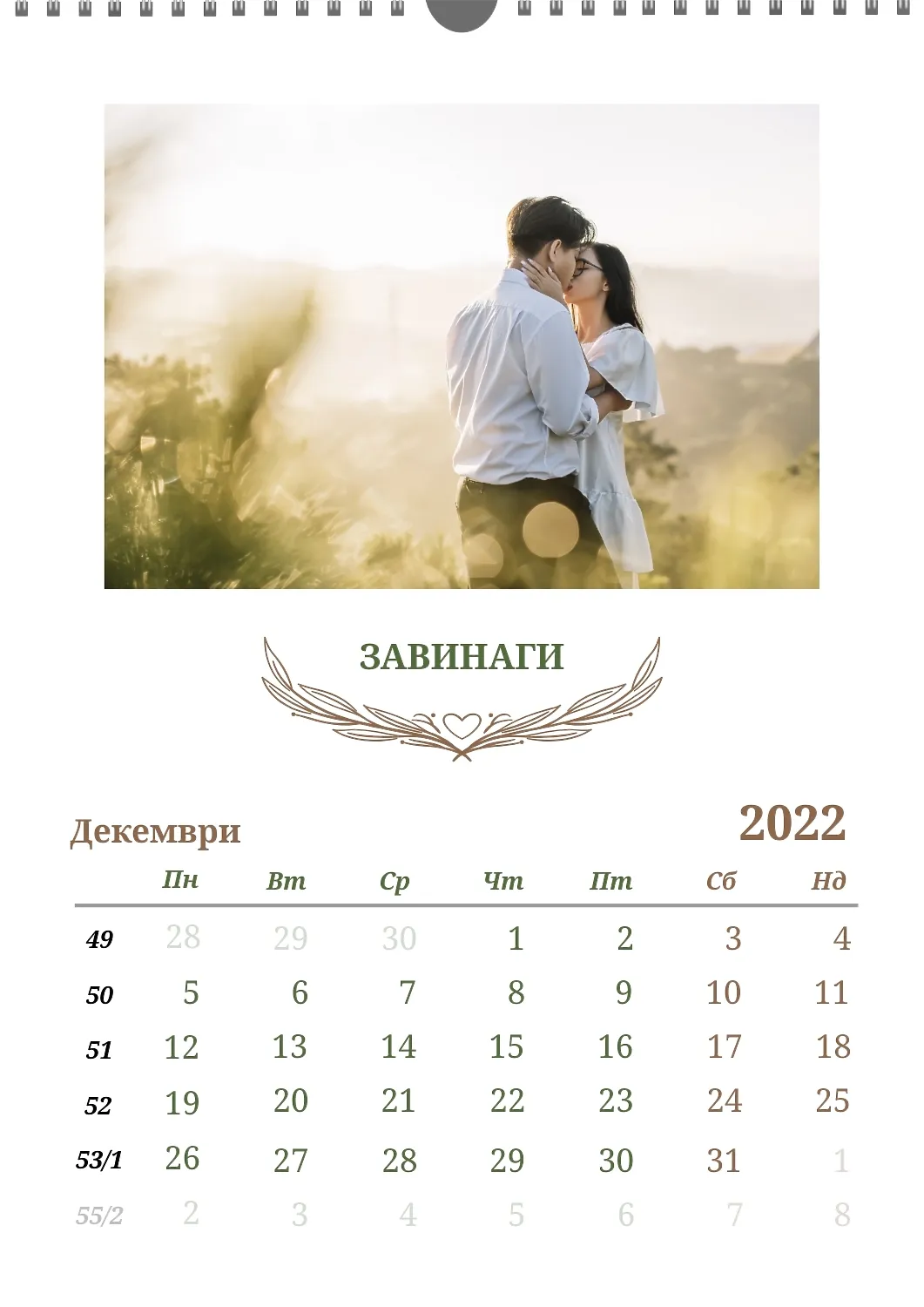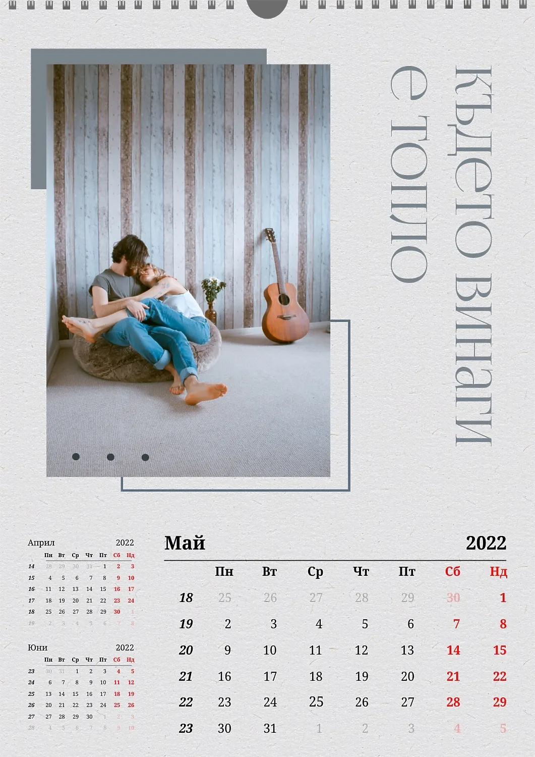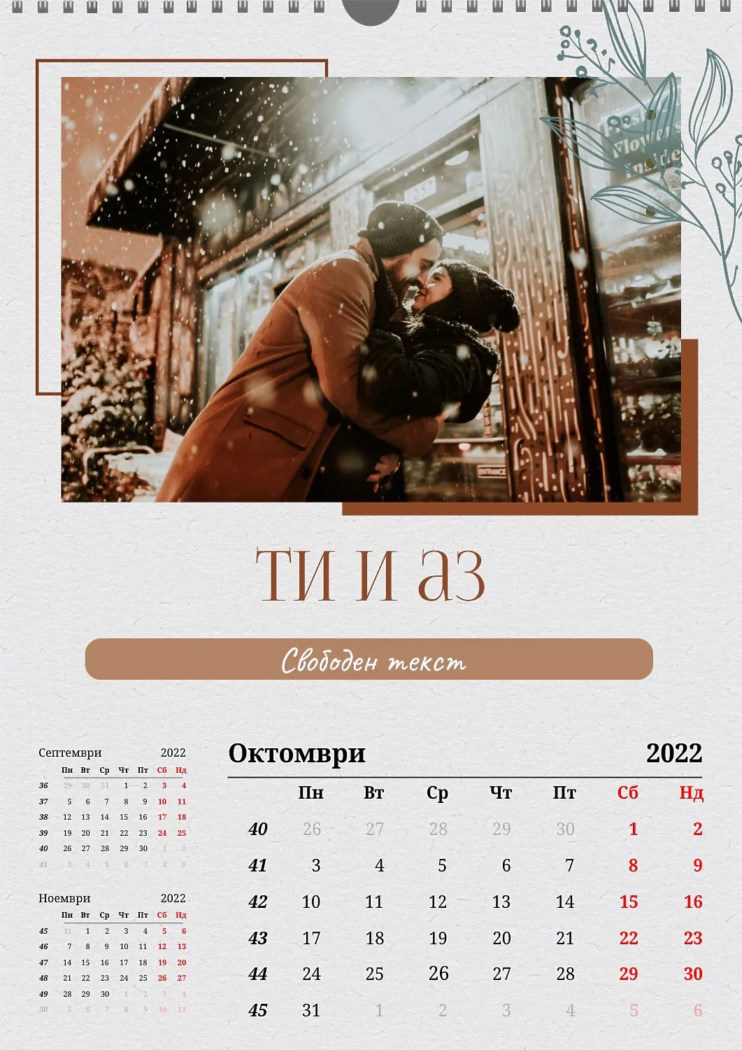 Готовият шаблон за календар за влюбена двойка е идеалният начин да създадете уникален и трогателен подарък. Той осигурява романтичен дизайн, който подчертава специалната връзка между партньорите. Такъв календар може да се превърне не само в приятен сувенир, но и в стилен елемент от интериора. Този шаблон е чудесен за фотографи, специализирани в 0, тъй като може да се използва за красиво проектиране на професионални снимки. Също така ще бъде полезно за дизайнери и блогъри, работещи в романтични теми, а също така е идеално за собствениците на сватбени агенции, които искат да предложат на клиентите необичаен подарък. Основното предимство на този календар е възможността за пълна персонализация в нашия онлайн конструктор. Можете да качите вашите снимки, да промените фона, да добавите запомнящи се дати, романтични надписи или дори забавни коментари към всеки месец. Благодарение на простия и интуитивен интерфейс редактирането ще отнеме минимум време, а резултатът ще зарадва с индивидуалност и високо качество. Създавайки такъв календар със собствените си ръце, вие влагате топлина и грижа в него, което го прави наистина специален.