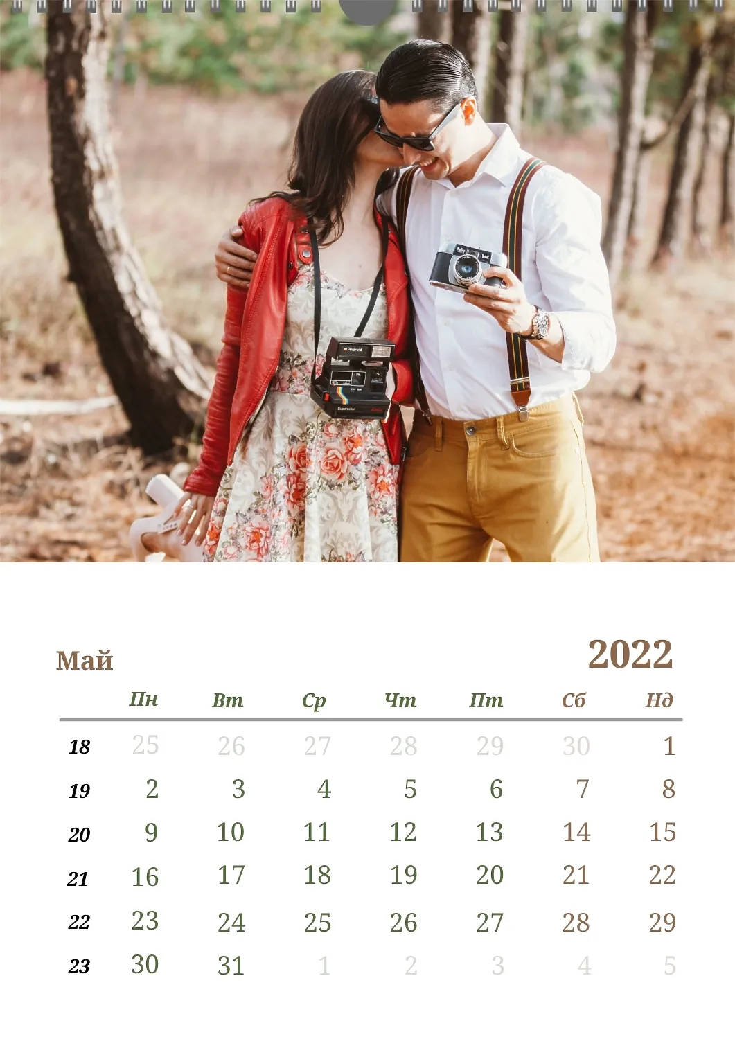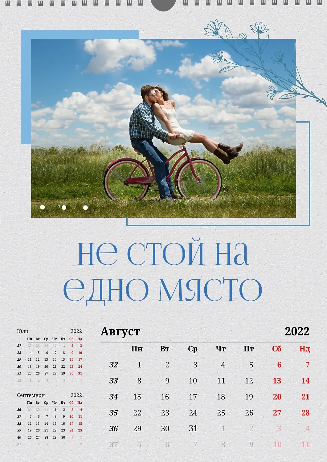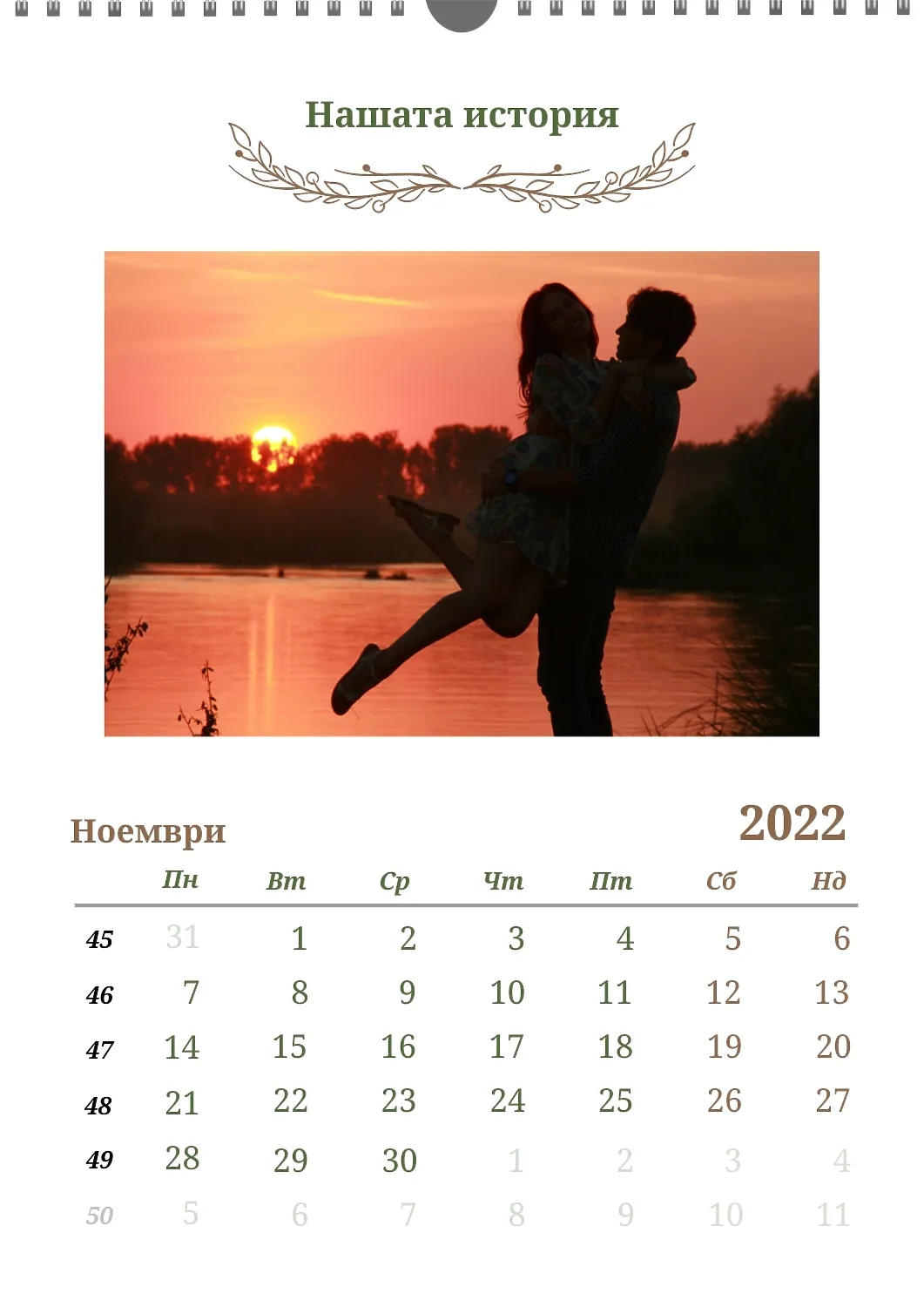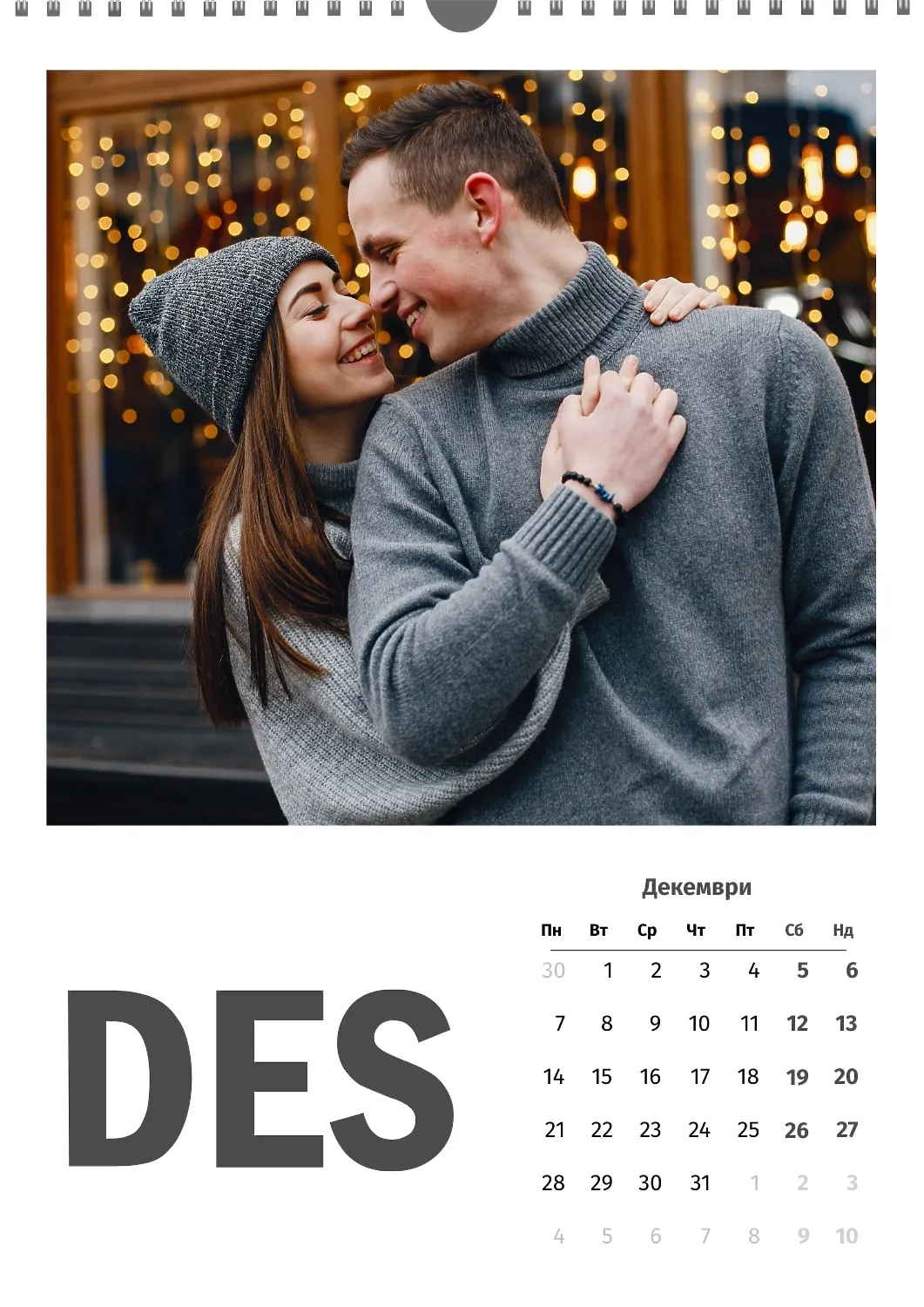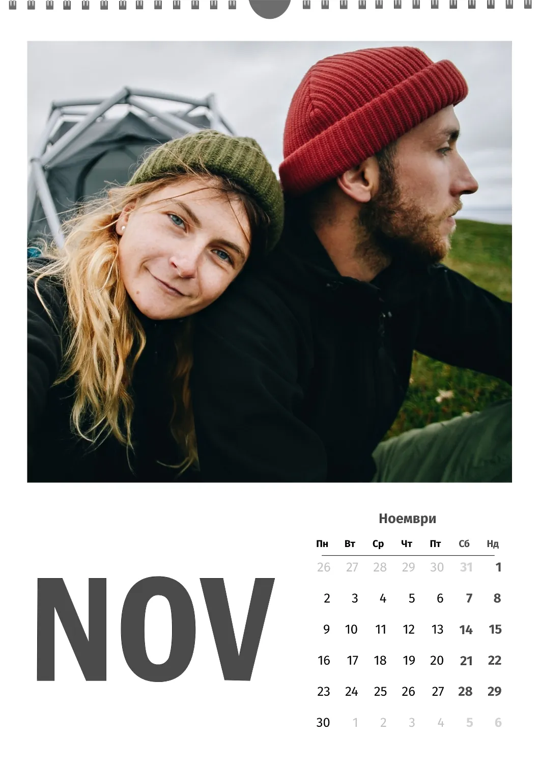 Готовият шаблон за календар за влюбена двойка е идеалният начин да създадете уникален и трогателен подарък. Той осигурява романтичен дизайн, който подчертава специалната връзка между партньорите. Такъв календар може да се превърне не само в приятен сувенир, но и в стилен елемент от интериора. Този шаблон е чудесен за фотографи, специализирани в 0, тъй като може да се използва за красиво проектиране на професионални снимки. Също така ще бъде полезно за дизайнери и блогъри, работещи в романтични теми, а също така е идеално за собствениците на сватбени агенции, които искат да предложат на клиентите необичаен подарък. Основното предимство на този календар е възможността за пълна персонализация в нашия онлайн конструктор. Можете да качите вашите снимки, да промените фона, да добавите запомнящи се дати, романтични надписи или дори забавни коментари към всеки месец. Благодарение на простия и интуитивен интерфейс редактирането ще отнеме минимум време, а резултатът ще зарадва с индивидуалност и високо качество. Създавайки такъв календар със собствените си ръце, вие влагате топлина и грижа в него, което го прави наистина специален.