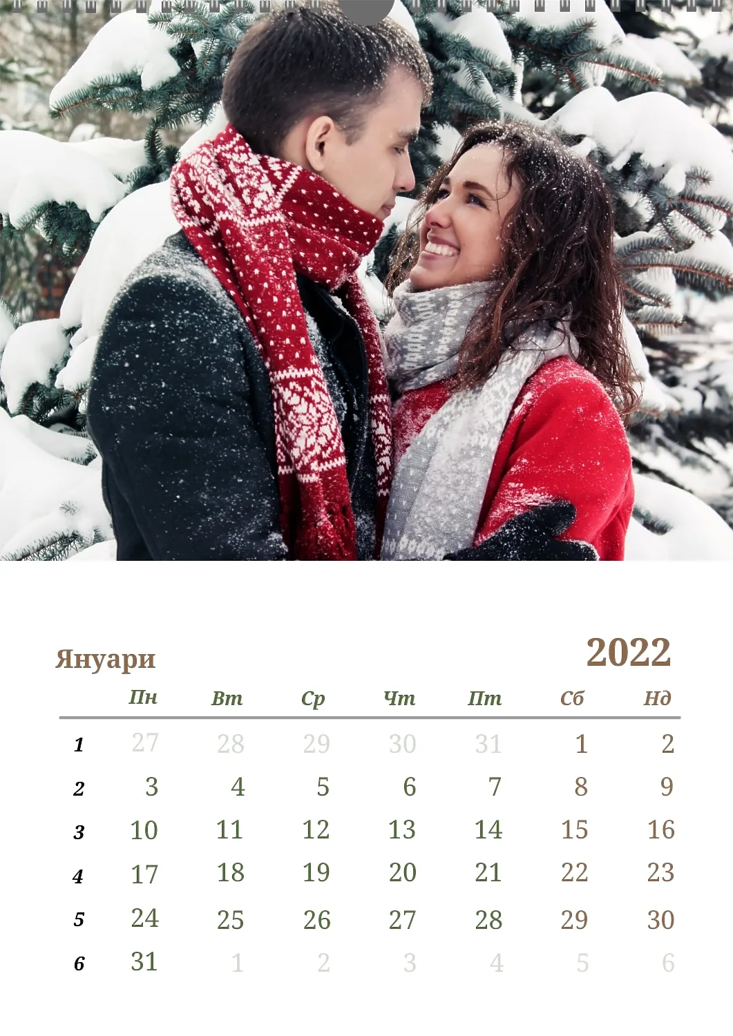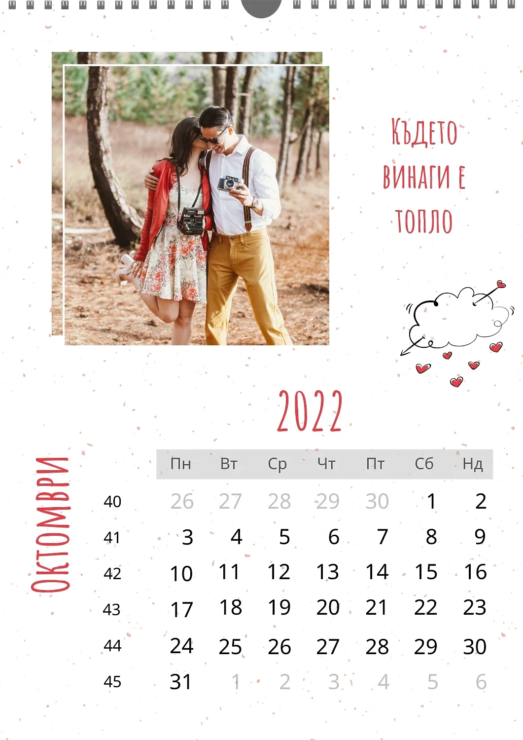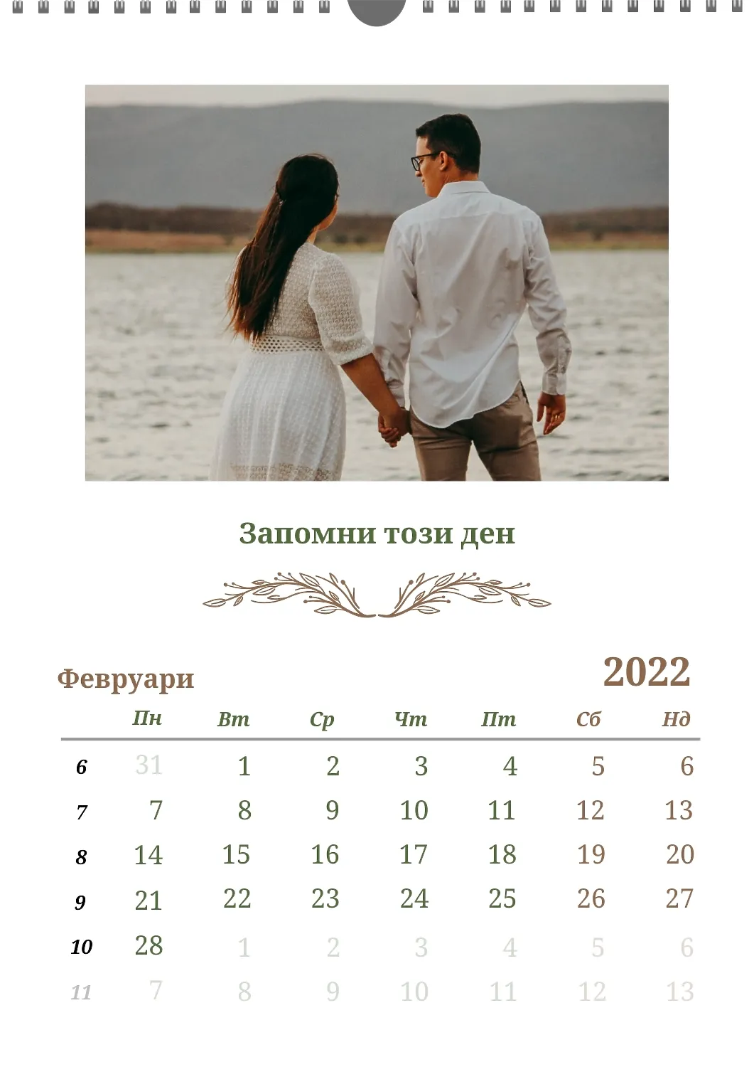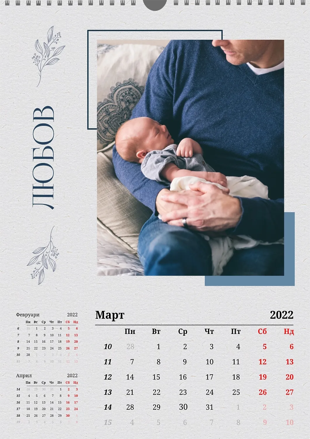 Готовият шаблон за календар за влюбена двойка е идеалният начин да създадете уникален и трогателен подарък. Той осигурява романтичен дизайн, който подчертава специалната връзка между партньорите. Такъв календар може да се превърне не само в приятен сувенир, но и в стилен елемент от интериора. Този шаблон е чудесен за фотографи, специализирани в 0, тъй като може да се използва за красиво проектиране на професионални снимки. Също така ще бъде полезно за дизайнери и блогъри, работещи в романтични теми, а също така е идеално за собствениците на сватбени агенции, които искат да предложат на клиентите необичаен подарък. Основното предимство на този календар е възможността за пълна персонализация в нашия онлайн конструктор. Можете да качите вашите снимки, да промените фона, да добавите запомнящи се дати, романтични надписи или дори забавни коментари към всеки месец. Благодарение на простия и интуитивен интерфейс редактирането ще отнеме минимум време, а резултатът ще зарадва с индивидуалност и високо качество. Създавайки такъв календар със собствените си ръце, вие влагате топлина и грижа в него, което го прави наистина специален.