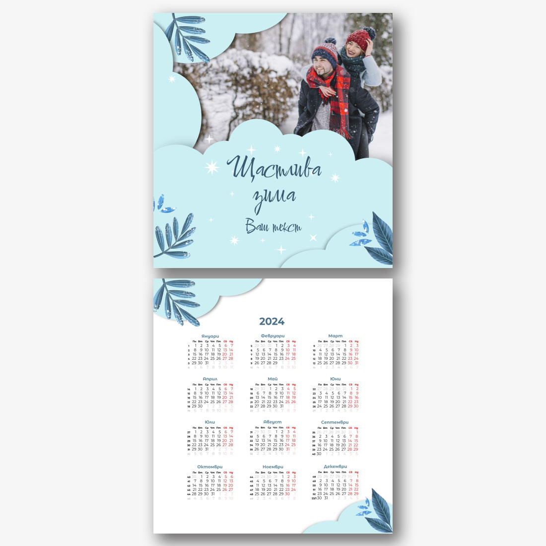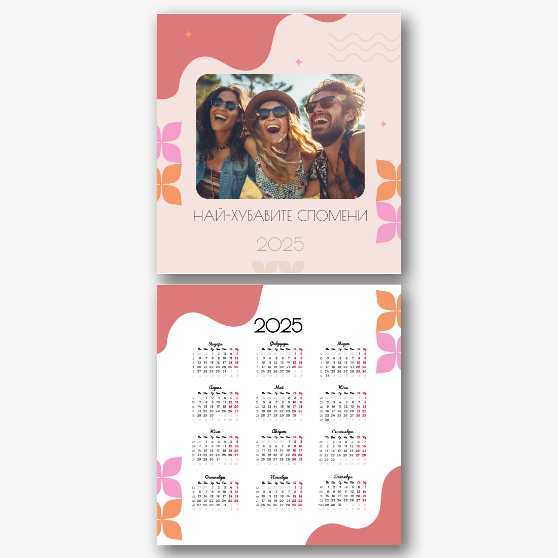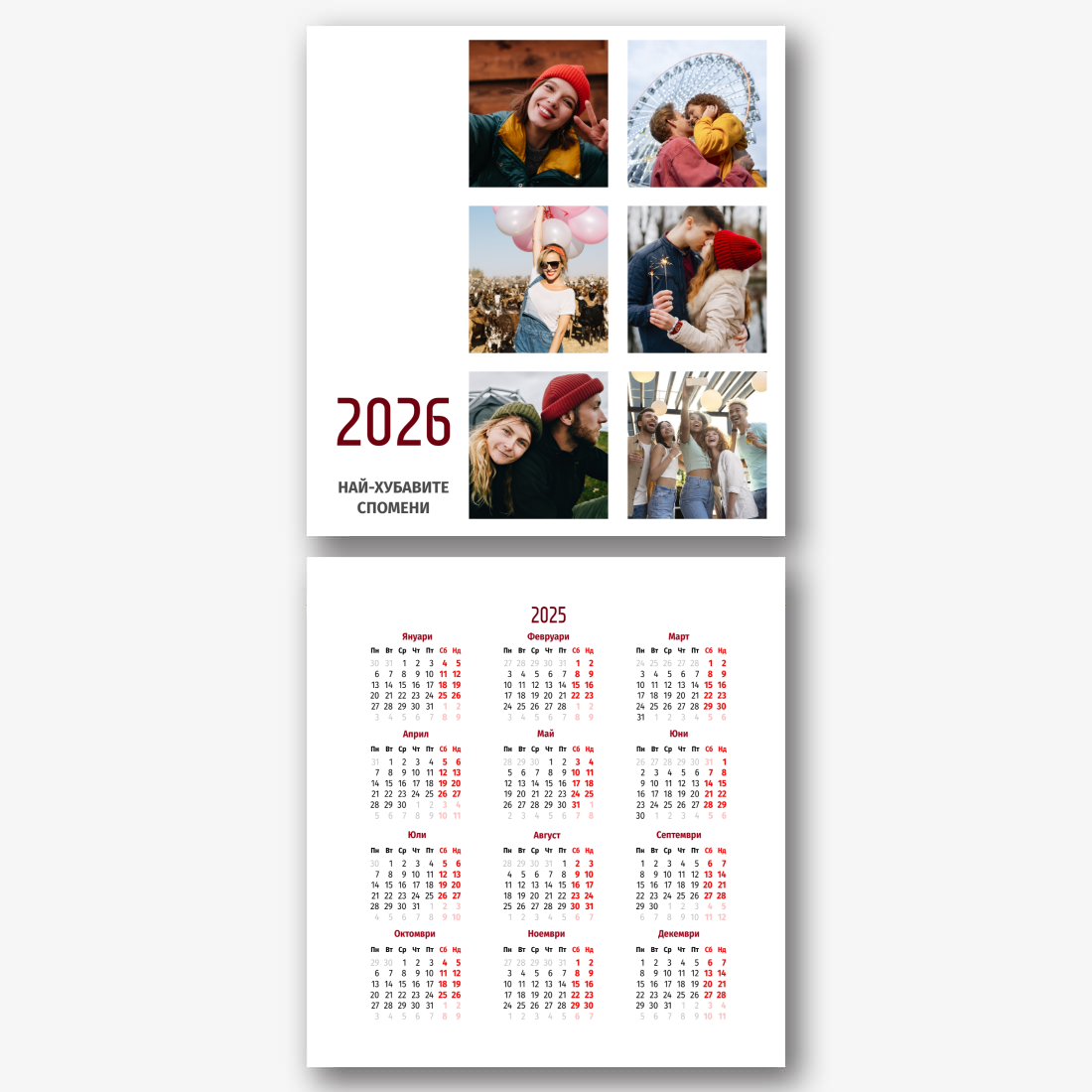 Готовият шаблон за календар за влюбена двойка е идеалният начин да създадете уникален и трогателен подарък. Той осигурява романтичен дизайн, който подчертава специалната връзка между партньорите. Такъв календар може да се превърне не само в приятен сувенир, но и в стилен елемент от интериора. Основното предимство на този календар е възможността за пълна персонализация в нашия онлайн конструктор. Можете да качите вашите снимки, да промените фона, да добавите запомнящи се дати, романтични надписи или дори забавни коментари към всеки месец. Благодарение на простия и интуитивен интерфейс редактирането ще отнеме минимум време, а резултатът ще зарадва с индивидуалност и високо качество. Създавайки такъв календар със собствените си ръце, вие влагате топлина и грижа в него, което го прави наистина специален.