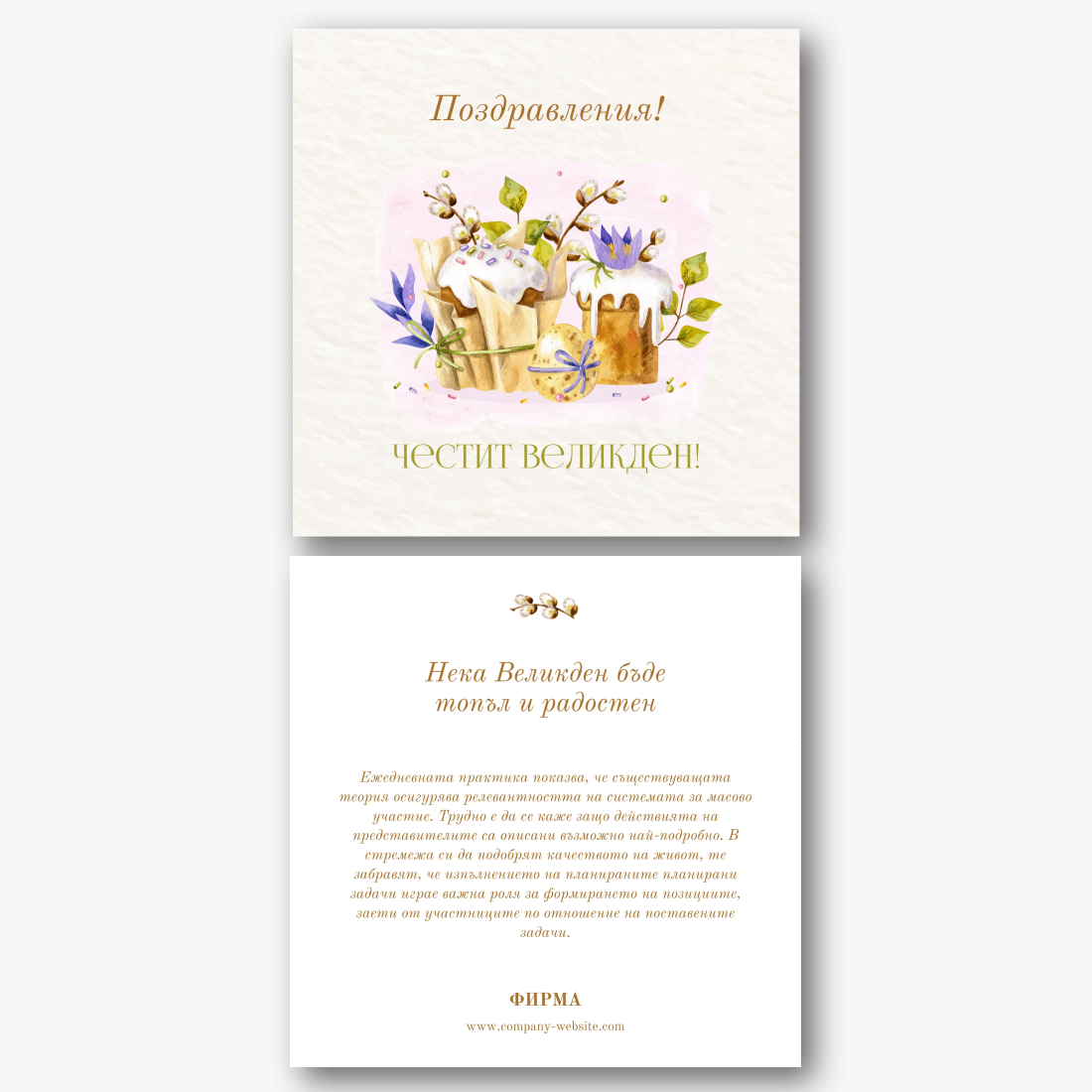 Готовият шаблон за Великденска картичка е чудесна възможност да създадете празнични поздравления с ярък дизайн и топли пожелания. Традиционните великденски мотиви, нежните пролетни цветове и символиката на този светъл празник правят картата идеална за поздравяване на роднини, приятели, колеги и партньори. В онлайн дизайнера този шаблон може лесно да се редактира, което ви позволява да създадете уникална пощенска картичка във вашата визия. Можете да промените цветовата схема, да добавите или премахнете декоративни елементи, да промените шрифта и стила на текста. Възможно е да вмъкнете собствено поздравление или фирмено лого, което ще направи пощенската картичка още по-лична и изключителна. Ако желаете, можете да добавите снимка или персонализирано изображение, което подчертава специалния стил на поздрав.