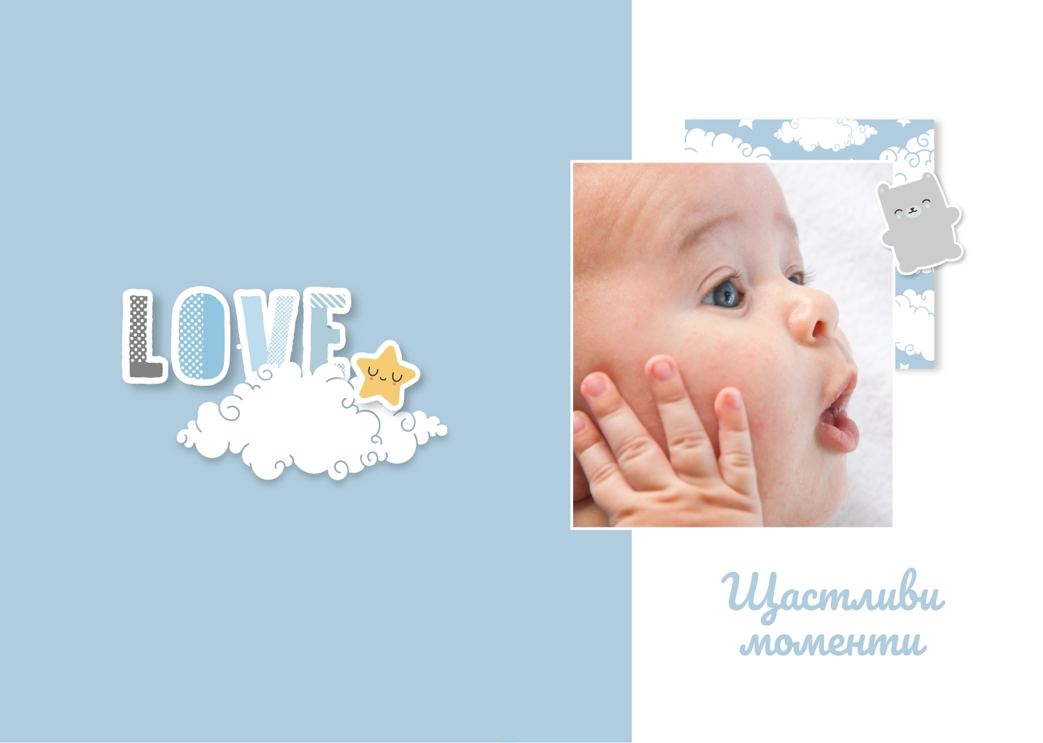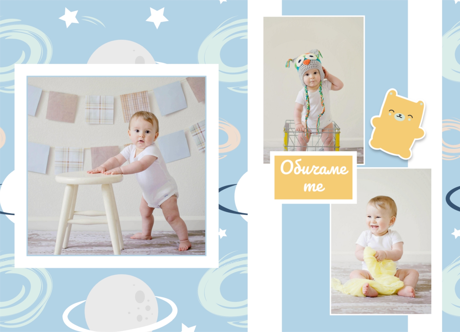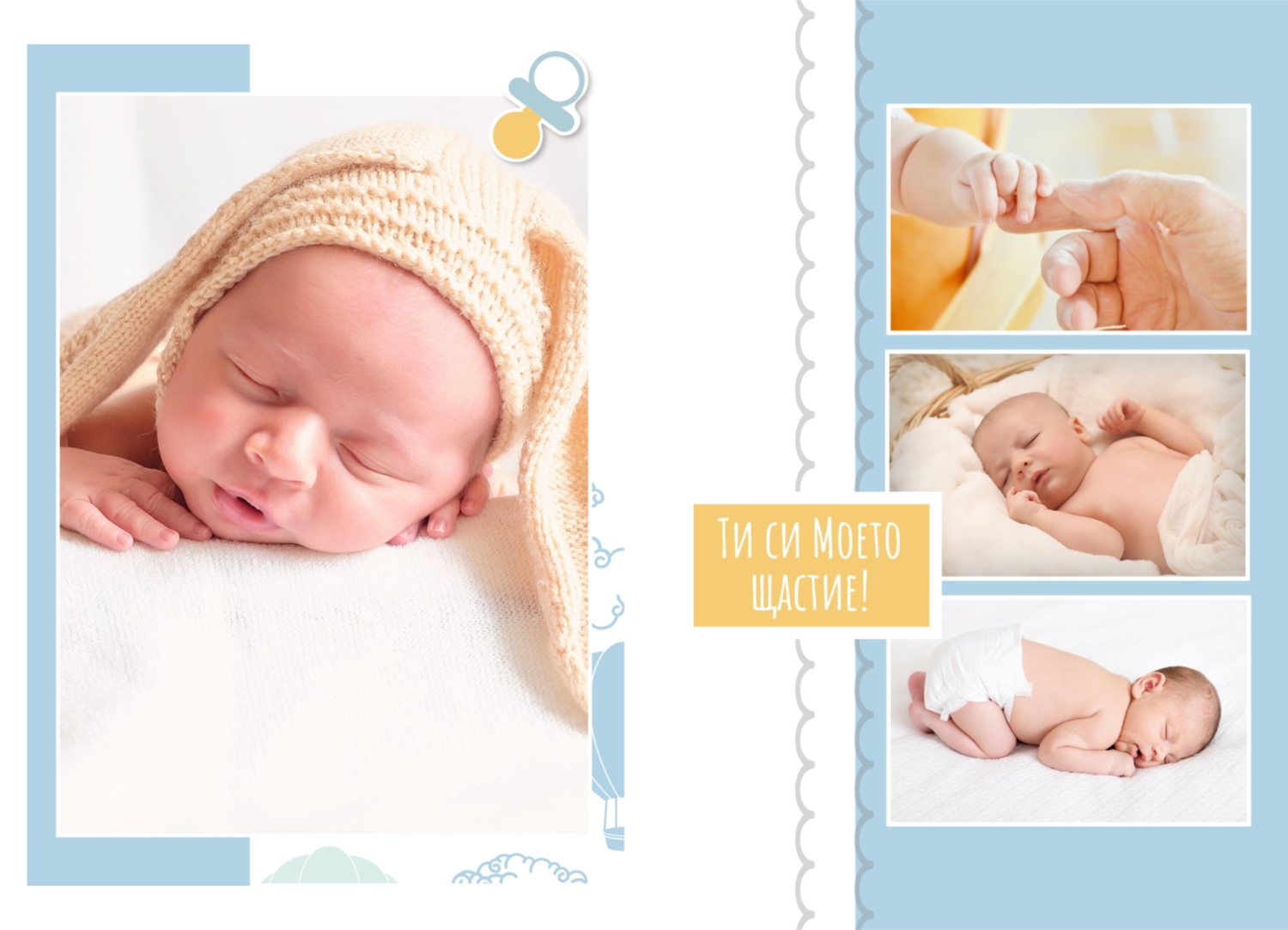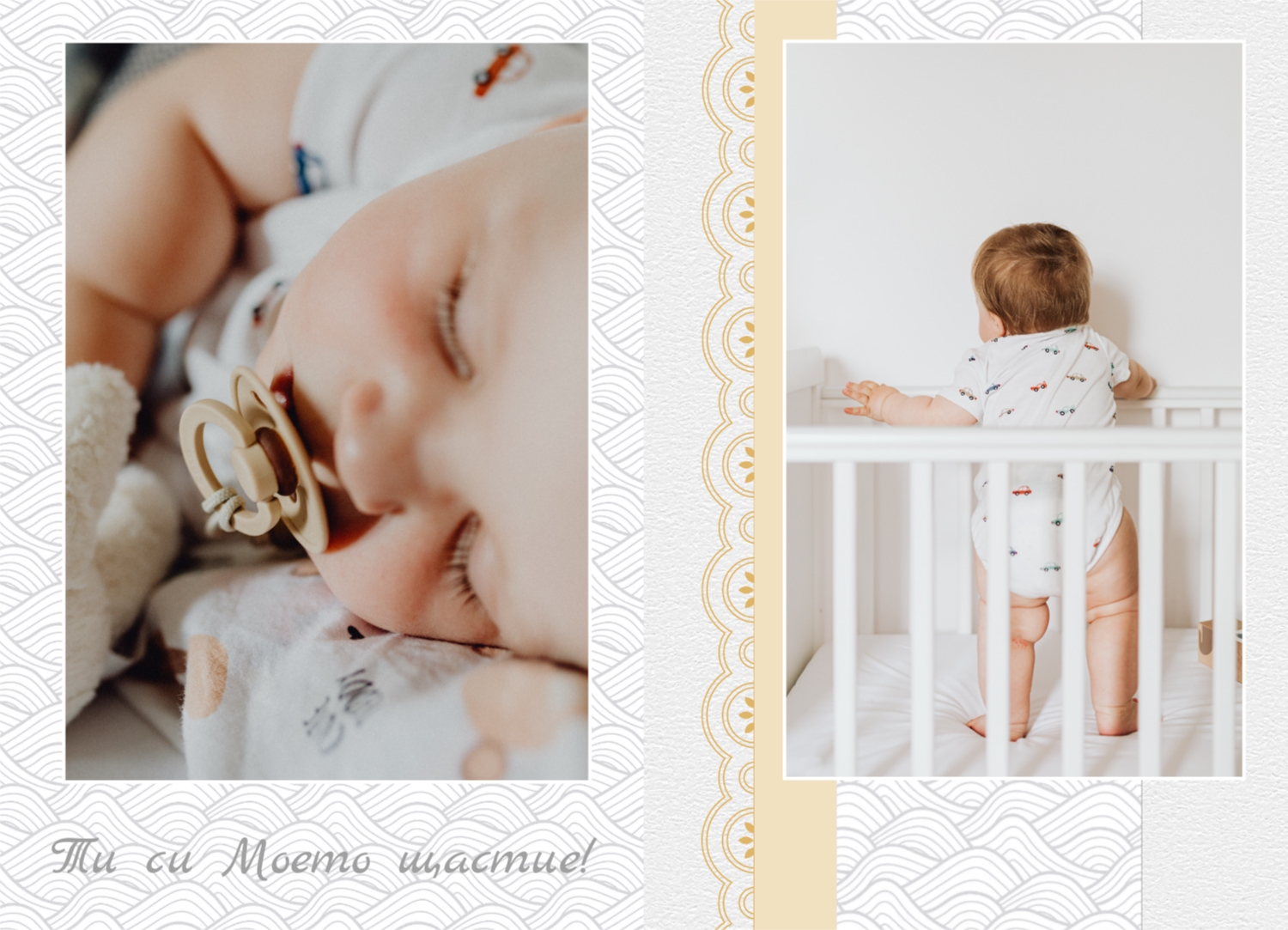 Готовият шаблон за вертикална фотокнига с твърди корици за новородени снимки е трогателно и стилно решение за създаване на първия албум на бебето. Дизайнът е направен в нежни пастелни цветове, със сладки илюстрации и гладки линии, които перфектно подчертават атмосферата на детството, уюта и грижите. Този шаблон е подходящ не само за родители, които искат да запазят запомнящите се моменти от първите дни от живота на детето, но и за професионални фотографи, специализирани в заснемането на новородени, както и за дизайнери, които създават персонализирани бебешки албуми. В онлайн конструктора този шаблон е лесен за редактиране, така че всяка фотокнига да стане наистина уникална. Можете да промените фона, да добавите нови декоративни елементи, рамки и надписи, като изберете шрифтове и цветове, които най-добре отговарят на стила на снимките. Всички полета за моментни снимки се преместват и мащабират лесно, а текстовите блокове могат да се редактират, като се записват важни дати, докосващи надписи или забавни коментари.