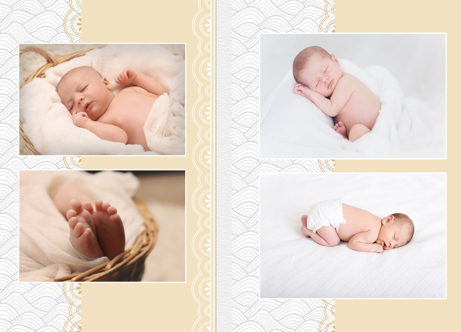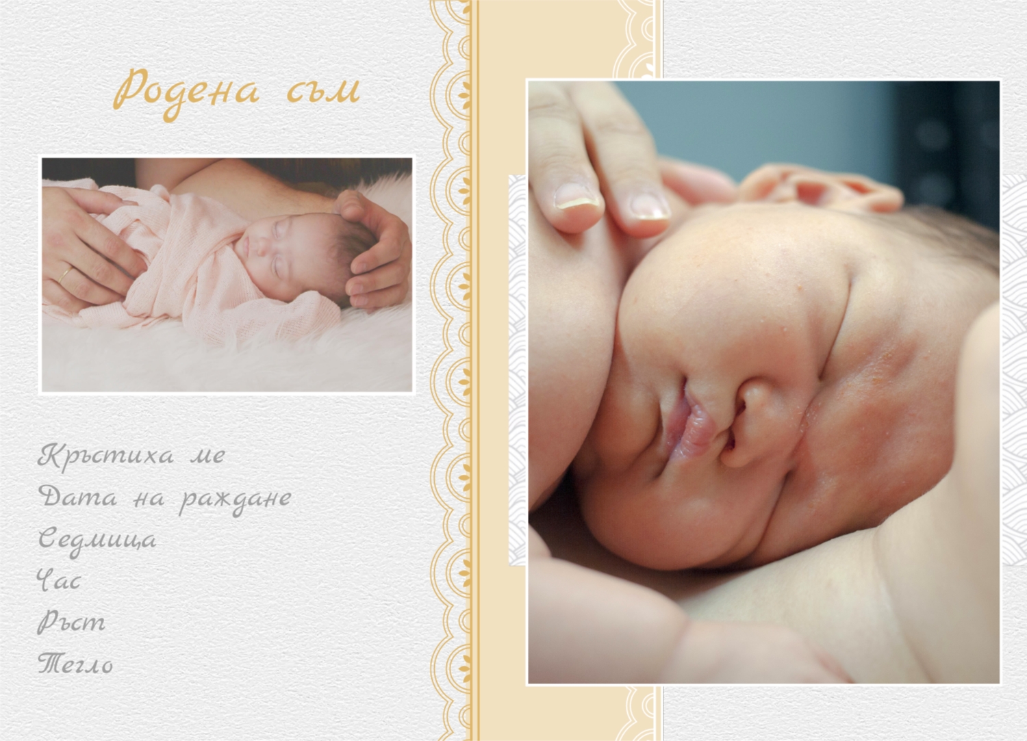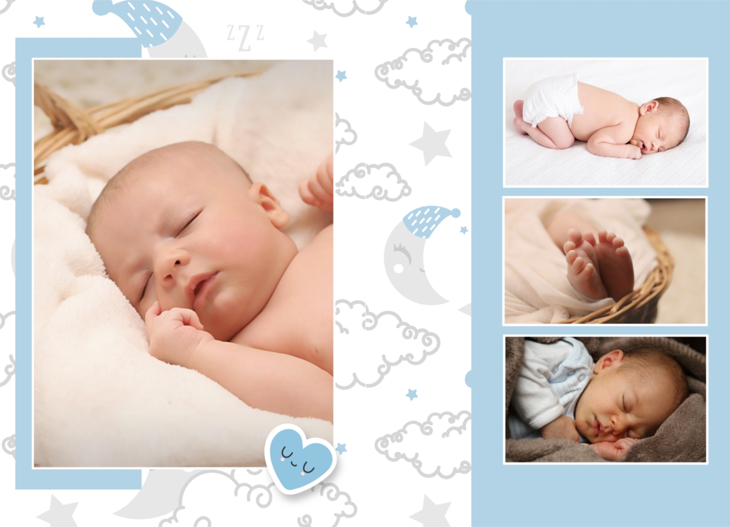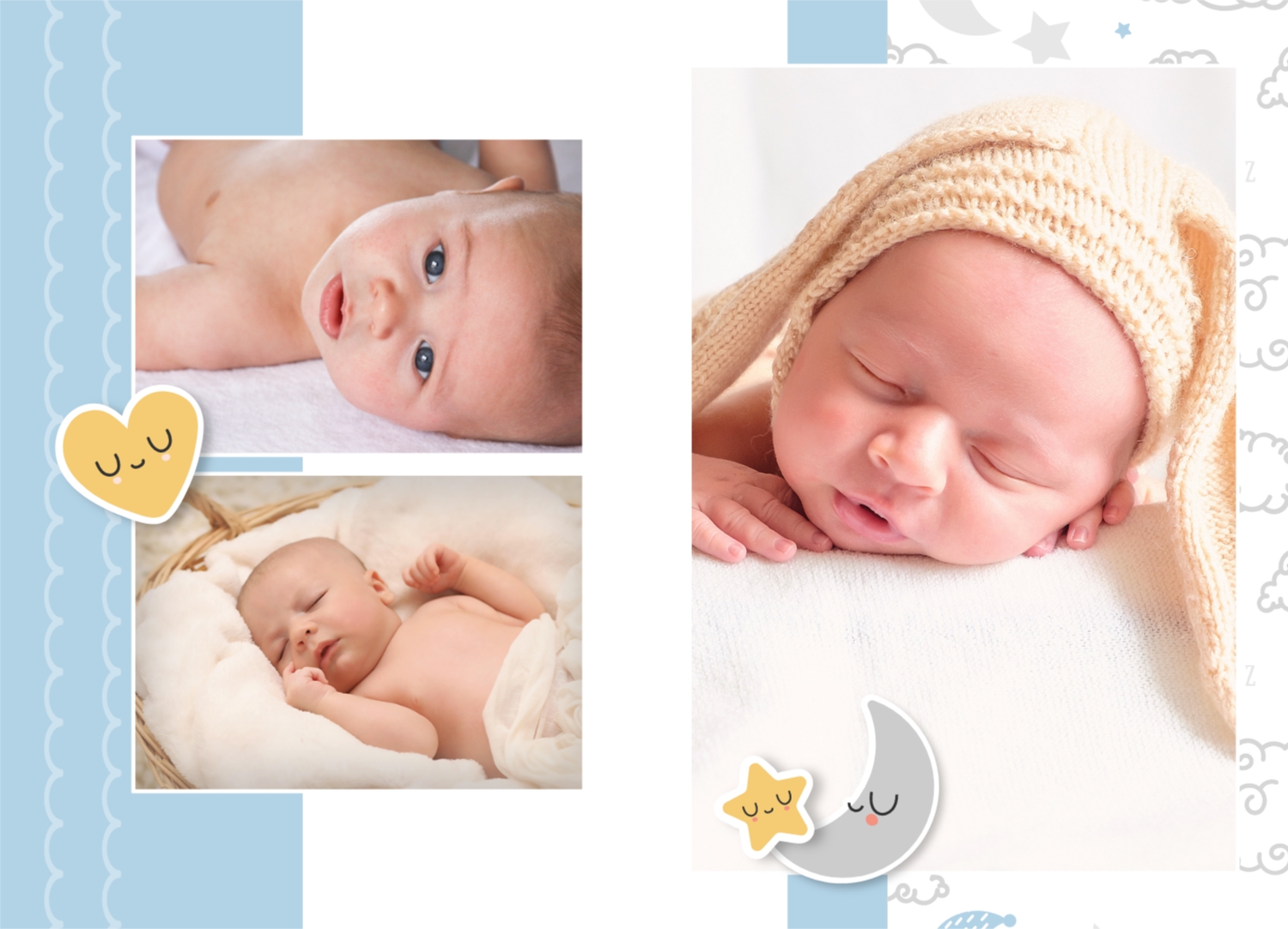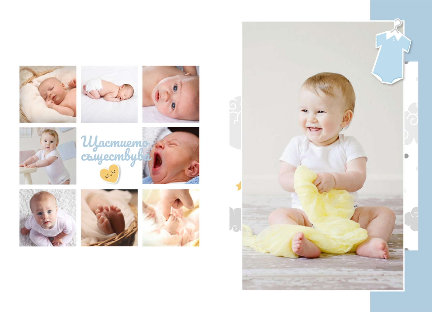 Готовият шаблон за вертикална фотокнига с твърди корици за новородени снимки е трогателно и стилно решение за създаване на първия албум на бебето. Дизайнът е направен в нежни пастелни цветове, със сладки илюстрации и гладки линии, които перфектно подчертават атмосферата на детството, уюта и грижите. Този шаблон е подходящ не само за родители, които искат да запазят запомнящите се моменти от първите дни от живота на детето, но и за професионални фотографи, специализирани в заснемането на новородени, както и за дизайнери, които създават персонализирани бебешки албуми. В онлайн конструктора този шаблон е лесен за редактиране, така че всяка фотокнига да стане наистина уникална. Можете да промените фона, да добавите нови декоративни елементи, рамки и надписи, като изберете шрифтове и цветове, които най-добре отговарят на стила на снимките. Всички полета за моментни снимки се преместват и мащабират лесно, а текстовите блокове могат да се редактират, като се записват важни дати, докосващи надписи или забавни коментари.