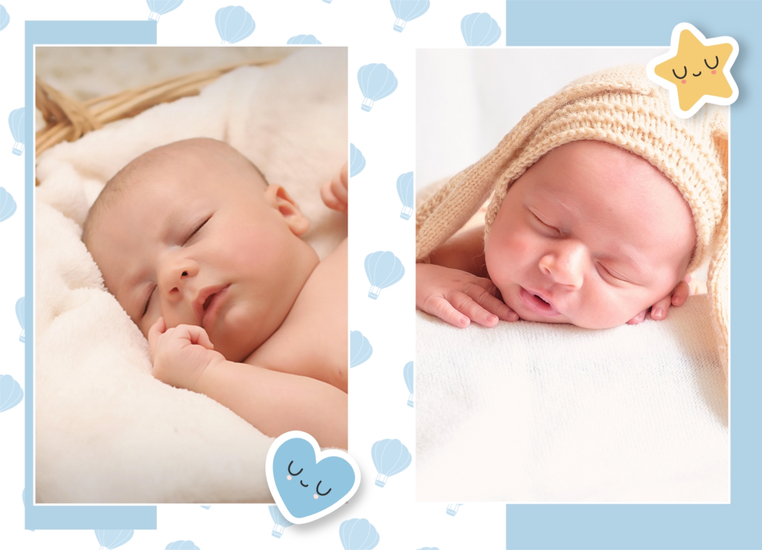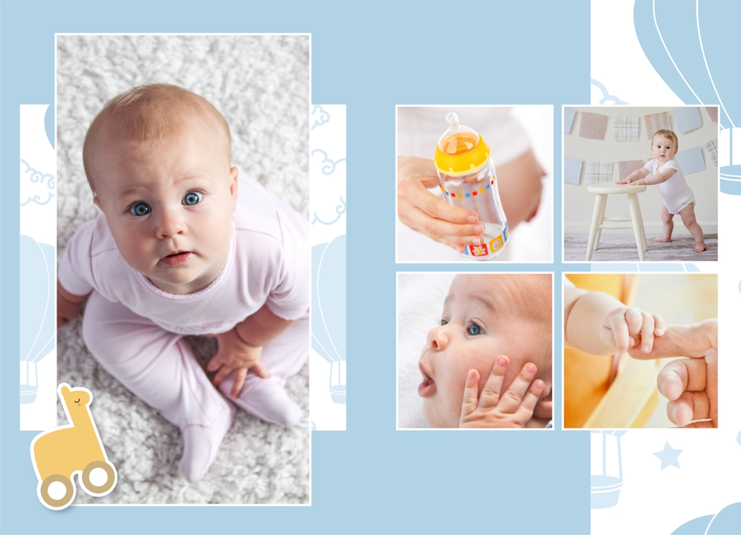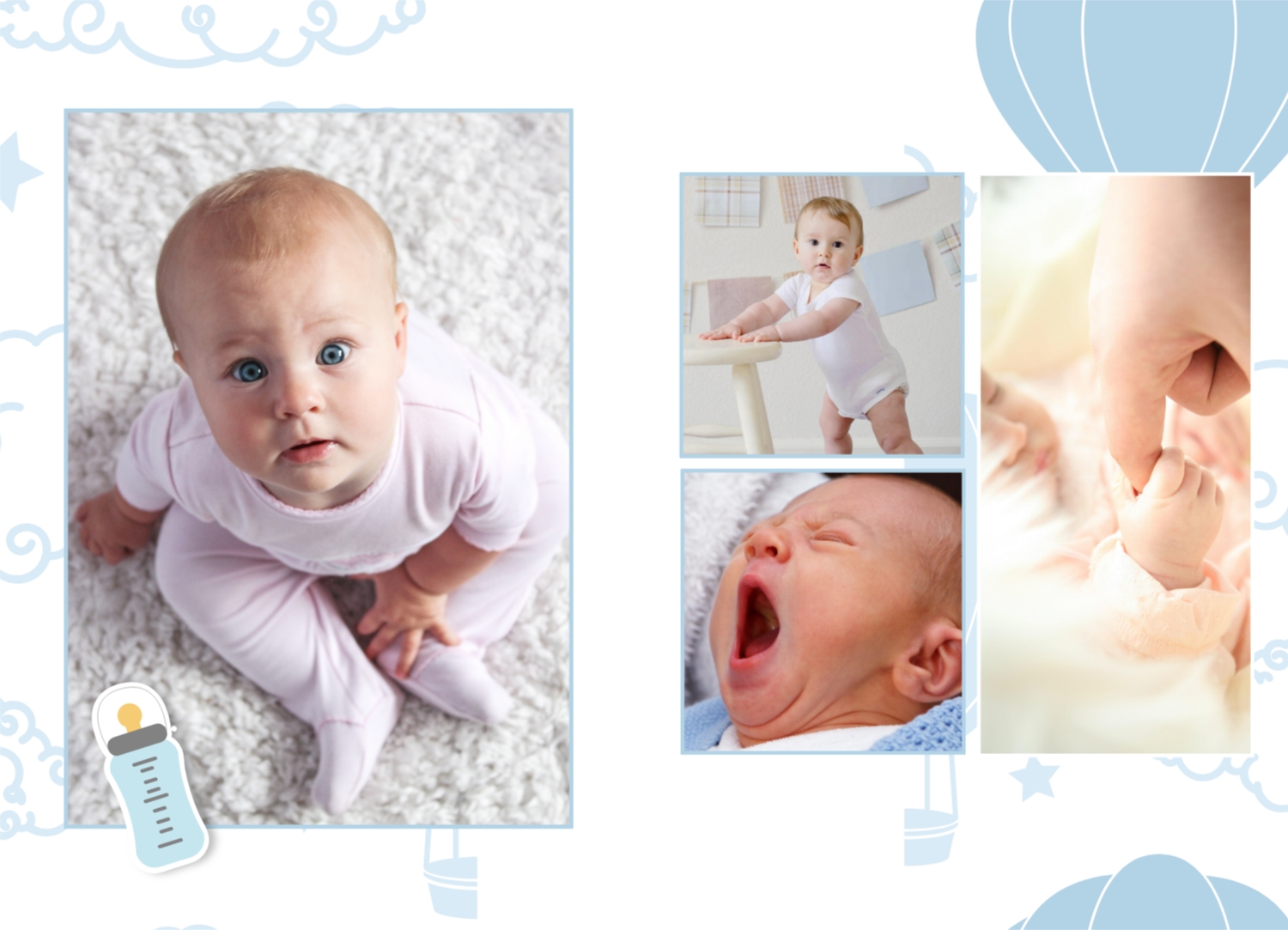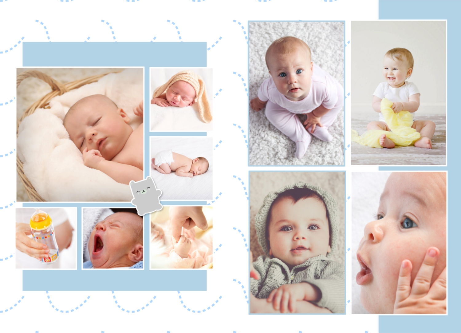 Готовият шаблон за вертикална фотокнига с твърди корици за новородени снимки е трогателно и стилно решение за създаване на първия албум на бебето. Дизайнът е направен в нежни пастелни цветове, със сладки илюстрации и гладки линии, които перфектно подчертават атмосферата на детството, уюта и грижите. Този шаблон е подходящ не само за родители, които искат да запазят запомнящите се моменти от първите дни от живота на детето, но и за професионални фотографи, специализирани в заснемането на новородени, както и за дизайнери, които създават персонализирани бебешки албуми. В онлайн конструктора този шаблон е лесен за редактиране, така че всяка фотокнига да стане наистина уникална. Можете да промените фона, да добавите нови декоративни елементи, рамки и надписи, като изберете шрифтове и цветове, които най-добре отговарят на стила на снимките. Всички полета за моментни снимки се преместват и мащабират лесно, а текстовите блокове могат да се редактират, като се записват важни дати, докосващи надписи или забавни коментари.