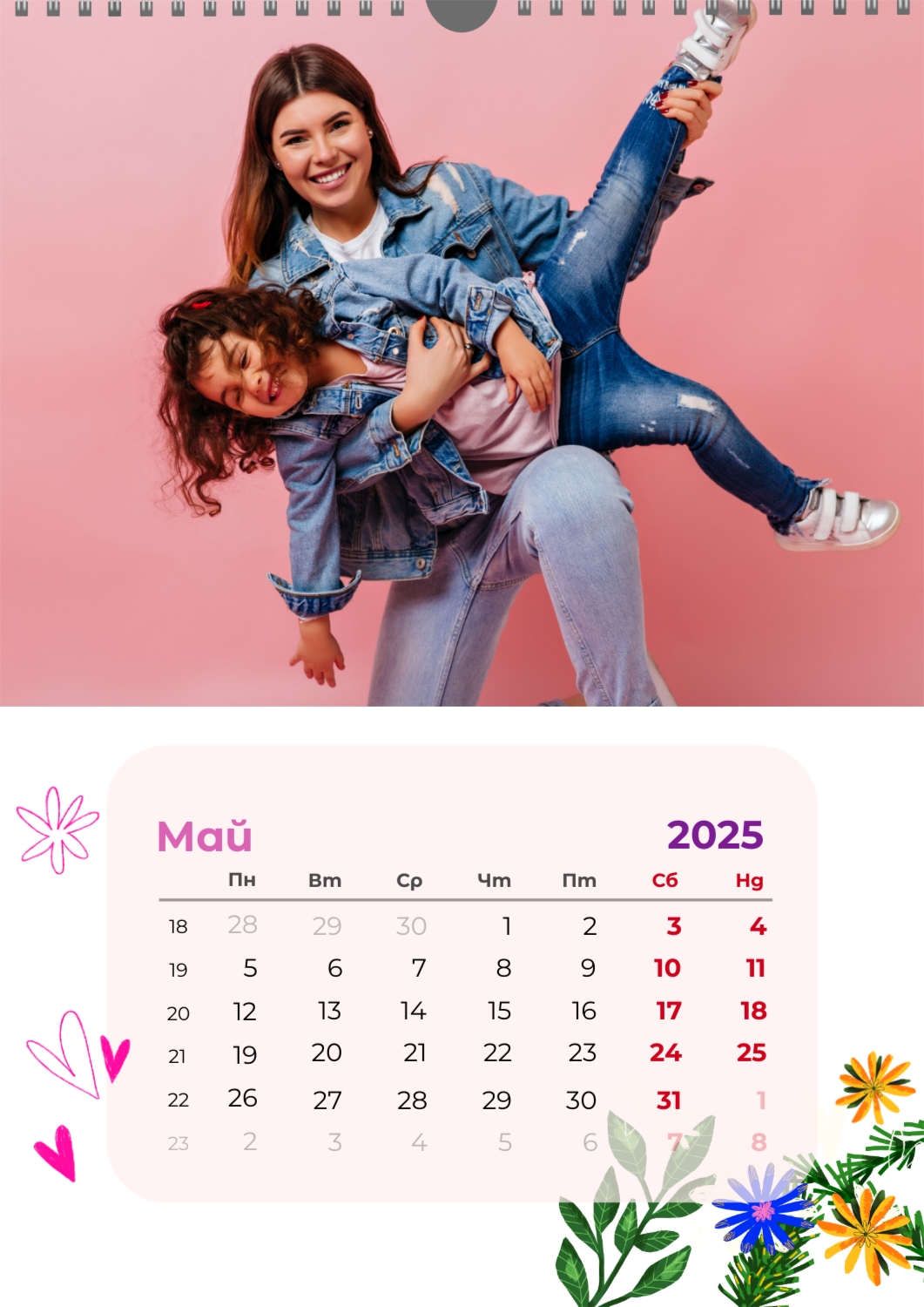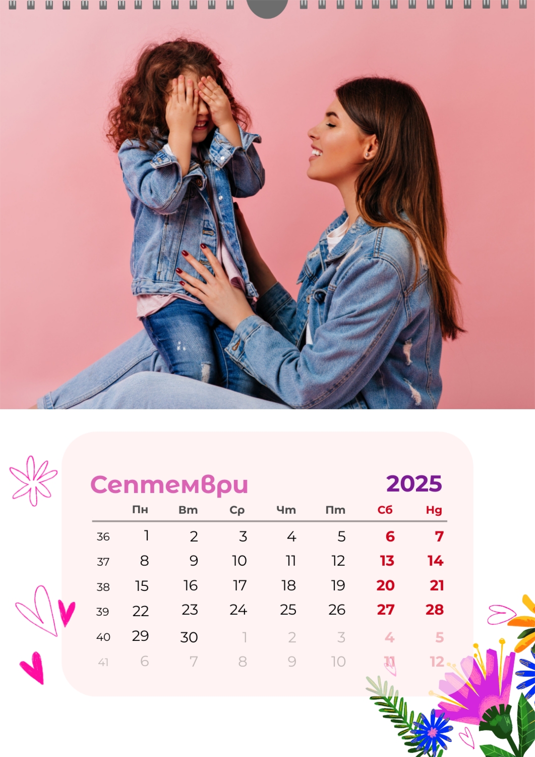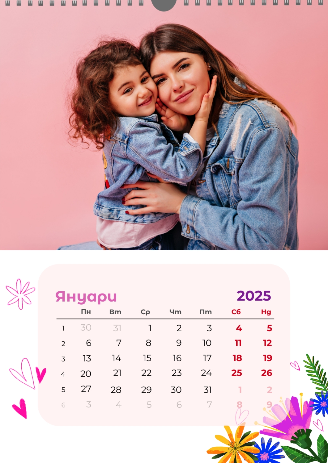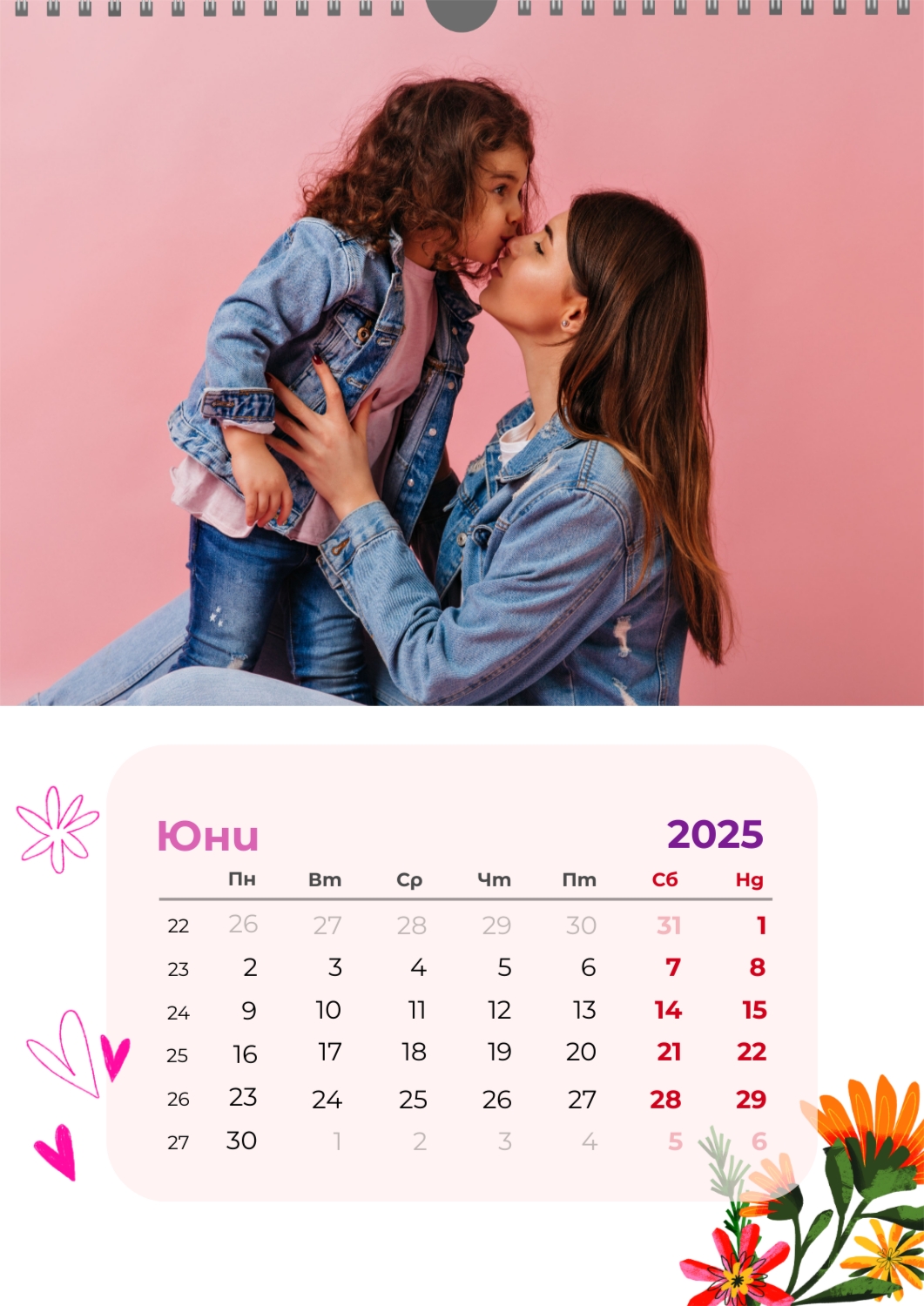 Готовият шаблон на календара" майчина любов " е трогателен и деликатен дизайн, изпълнен с топлина, грижа и комфорт. Той е декориран в меки пастелни цветове с елементи, символизиращи майчината обич: сърца, детски рисунки, флорални мотиви. Такъв календар е идеален за семейни фотосесии, подаръци за Деня на майката, а също така ще бъде отлично решение за специалисти, работещи в областта на детското развитие, семейната психология, педагогиката и предучилищното образование. Може да се използва в детски градини, центрове за ранно развитие, частни Фотостудия, както и в благотворителни организации, които помагат на семействата. В онлайн конструктора този шаблон може лесно да бъде адаптиран към всеки формат и съдържание. Всички елементи се редактират: можете да качите свои собствени снимки, да промените надписите, да изберете шрифт и неговия цвят, да коригирате местоположението на месеците, да добавите важни дати и събития. Благодарение на гъвкавите настройки е лесно да превърнете календара в персонализиран подарък или професионален инструмент — като Марков календар с лого и контакти в центъра. Дори и без опит в дизайна, можете лесно да създадете уникален календар със собствените си ръце — интерфейсът на дизайнера е интуитивен, всички промени се показват наведнъж, а шаблонът запазва хармония и стил дори при мащабна обработка. Календарът" майчина любов " се превръща не само в интериорна декорация, но и в истински носител на емоции и спомени, създадени с душа.