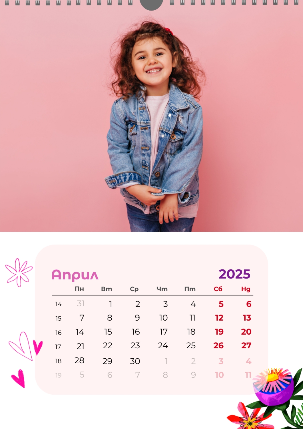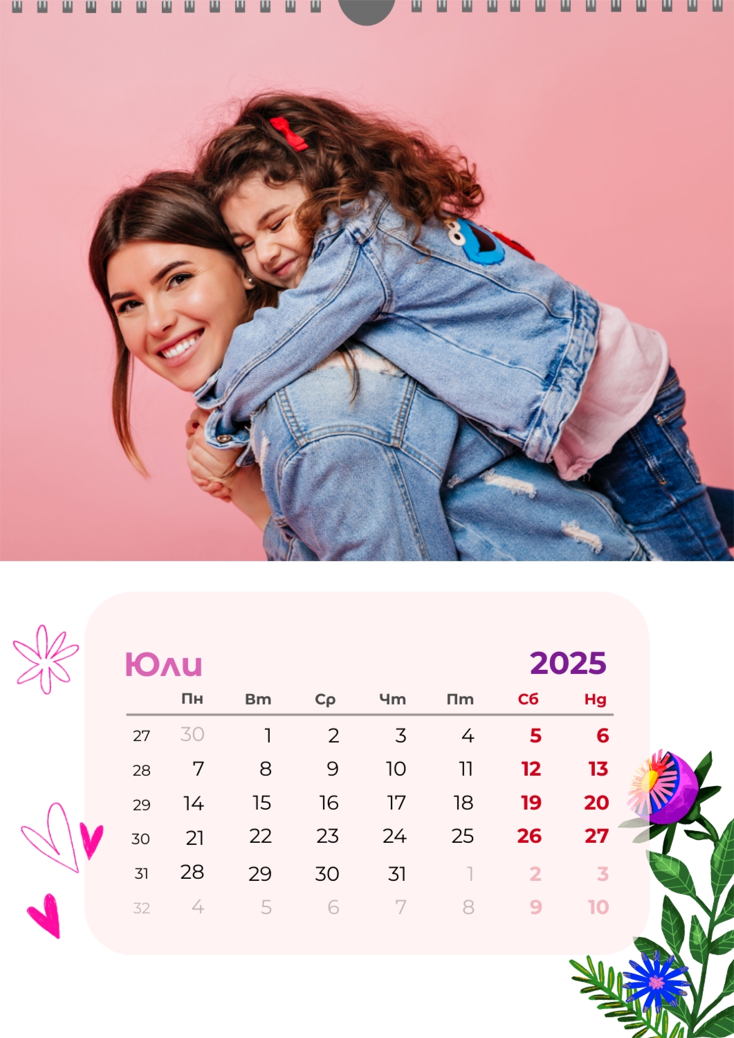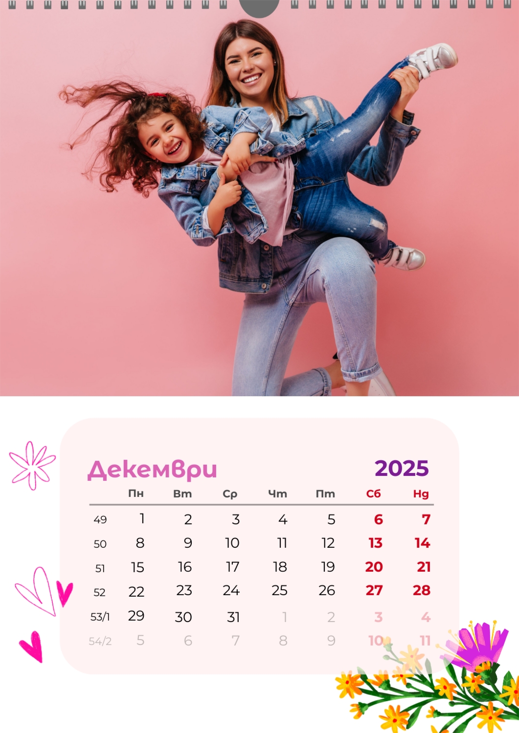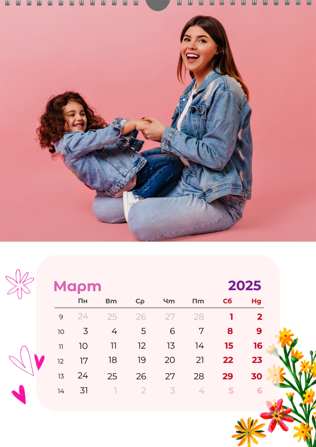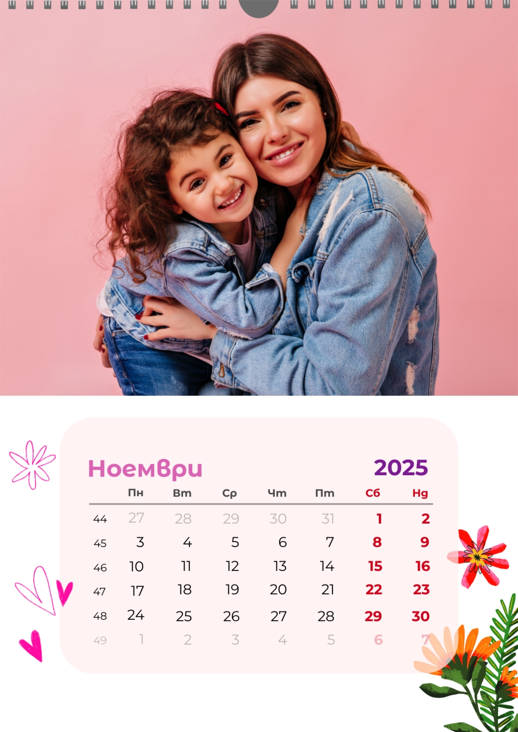 Готовият шаблон на календара" майчина любов " е трогателен и деликатен дизайн, изпълнен с топлина, грижа и комфорт. Той е декориран в меки пастелни цветове с елементи, символизиращи майчината обич: сърца, детски рисунки, флорални мотиви. Такъв календар е идеален за семейни фотосесии, подаръци за Деня на майката, а също така ще бъде отлично решение за специалисти, работещи в областта на детското развитие, семейната психология, педагогиката и предучилищното образование. Може да се използва в детски градини, центрове за ранно развитие, частни Фотостудия, както и в благотворителни организации, които помагат на семействата. В онлайн конструктора този шаблон може лесно да бъде адаптиран към всеки формат и съдържание. Всички елементи се редактират: можете да качите свои собствени снимки, да промените надписите, да изберете шрифт и неговия цвят, да коригирате местоположението на месеците, да добавите важни дати и събития. Благодарение на гъвкавите настройки е лесно да превърнете календара в персонализиран подарък или професионален инструмент — като Марков календар с лого и контакти в центъра. Дори и без опит в дизайна, можете лесно да създадете уникален календар със собствените си ръце — интерфейсът на дизайнера е интуитивен, всички промени се показват наведнъж, а шаблонът запазва хармония и стил дори при мащабна обработка. Календарът" майчина любов " се превръща не само в интериорна декорация, но и в истински носител на емоции и спомени, създадени с душа.