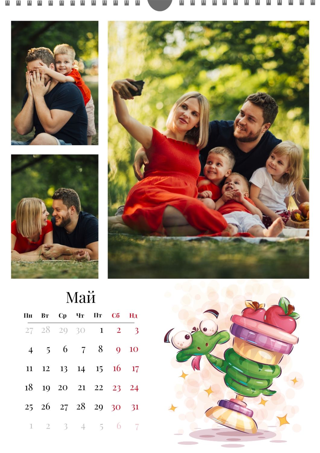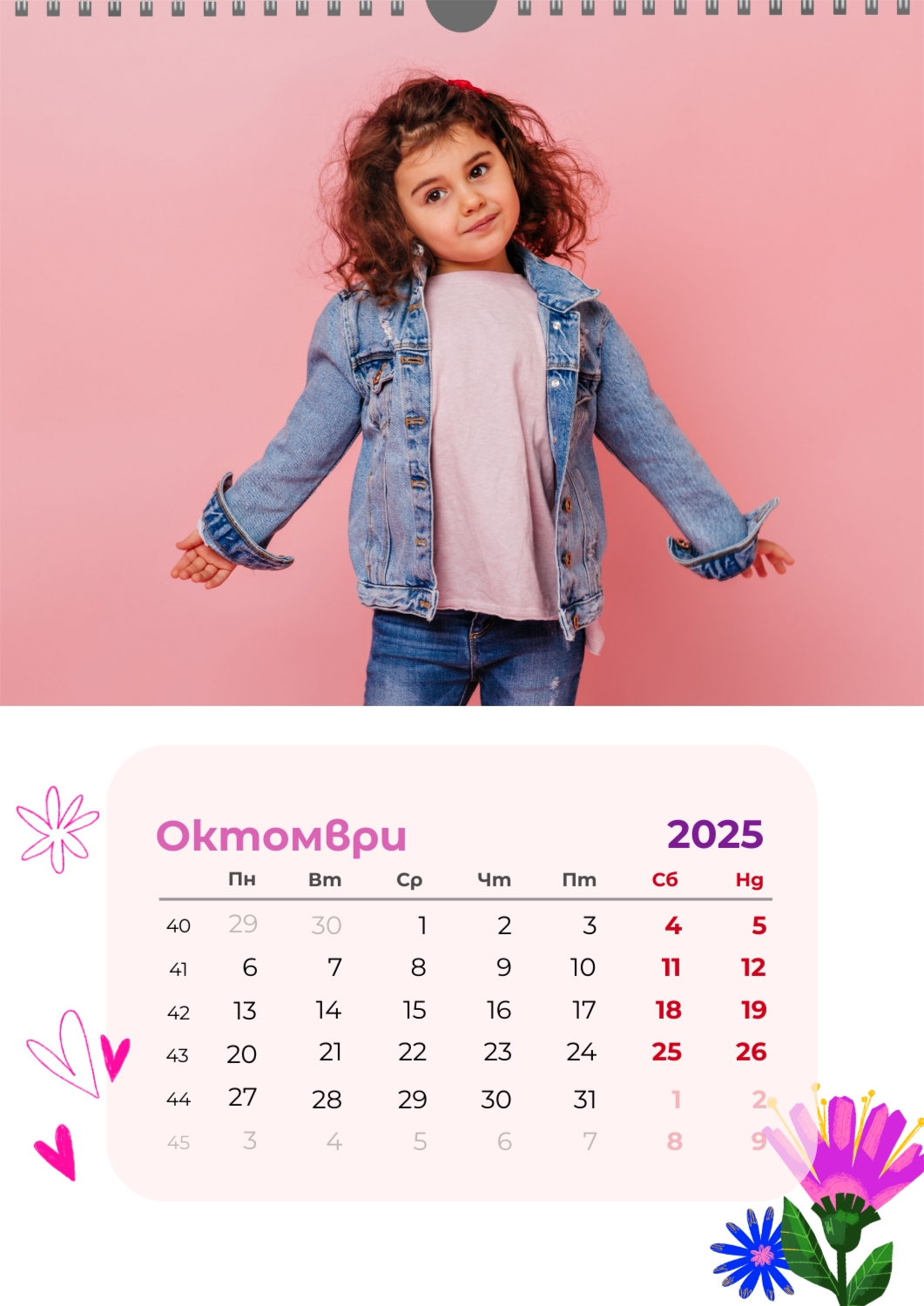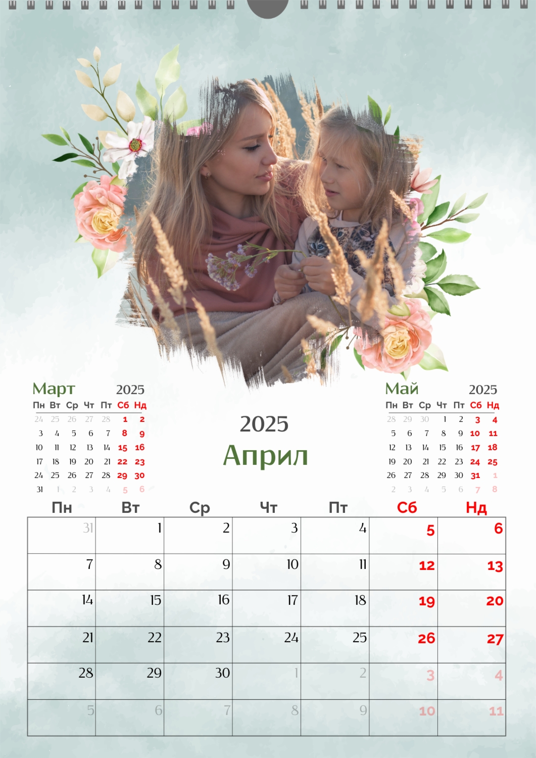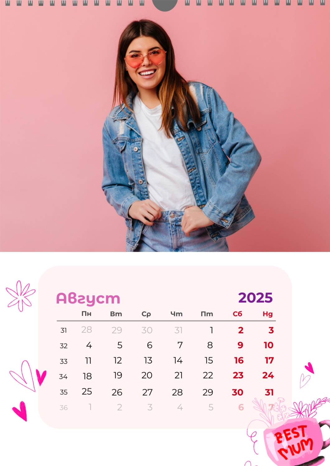 Готовият шаблон на календара" майчина любов " е трогателен и деликатен дизайн, изпълнен с топлина, грижа и комфорт. Той е декориран в меки пастелни цветове с елементи, символизиращи майчината обич: сърца, детски рисунки, флорални мотиви. Такъв календар е идеален за семейни фотосесии, подаръци за Деня на майката, а също така ще бъде отлично решение за специалисти, работещи в областта на детското развитие, семейната психология, педагогиката и предучилищното образование. Може да се използва в детски градини, центрове за ранно развитие, частни Фотостудия, както и в благотворителни организации, които помагат на семействата. В онлайн конструктора този шаблон може лесно да бъде адаптиран към всеки формат и съдържание. Всички елементи се редактират: можете да качите свои собствени снимки, да промените надписите, да изберете шрифт и неговия цвят, да коригирате местоположението на месеците, да добавите важни дати и събития. Благодарение на гъвкавите настройки е лесно да превърнете календара в персонализиран подарък или професионален инструмент — като Марков календар с лого и контакти в центъра. Дори и без опит в дизайна, можете лесно да създадете уникален календар със собствените си ръце — интерфейсът на дизайнера е интуитивен, всички промени се показват наведнъж, а шаблонът запазва хармония и стил дори при мащабна обработка. Календарът" майчина любов " се превръща не само в интериорна декорация, но и в истински носител на емоции и спомени, създадени с душа.