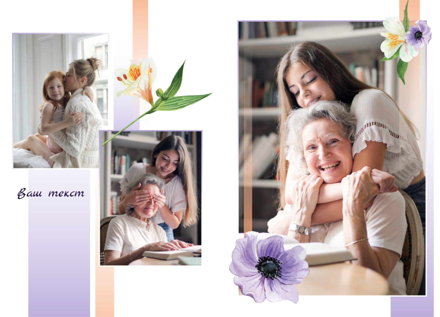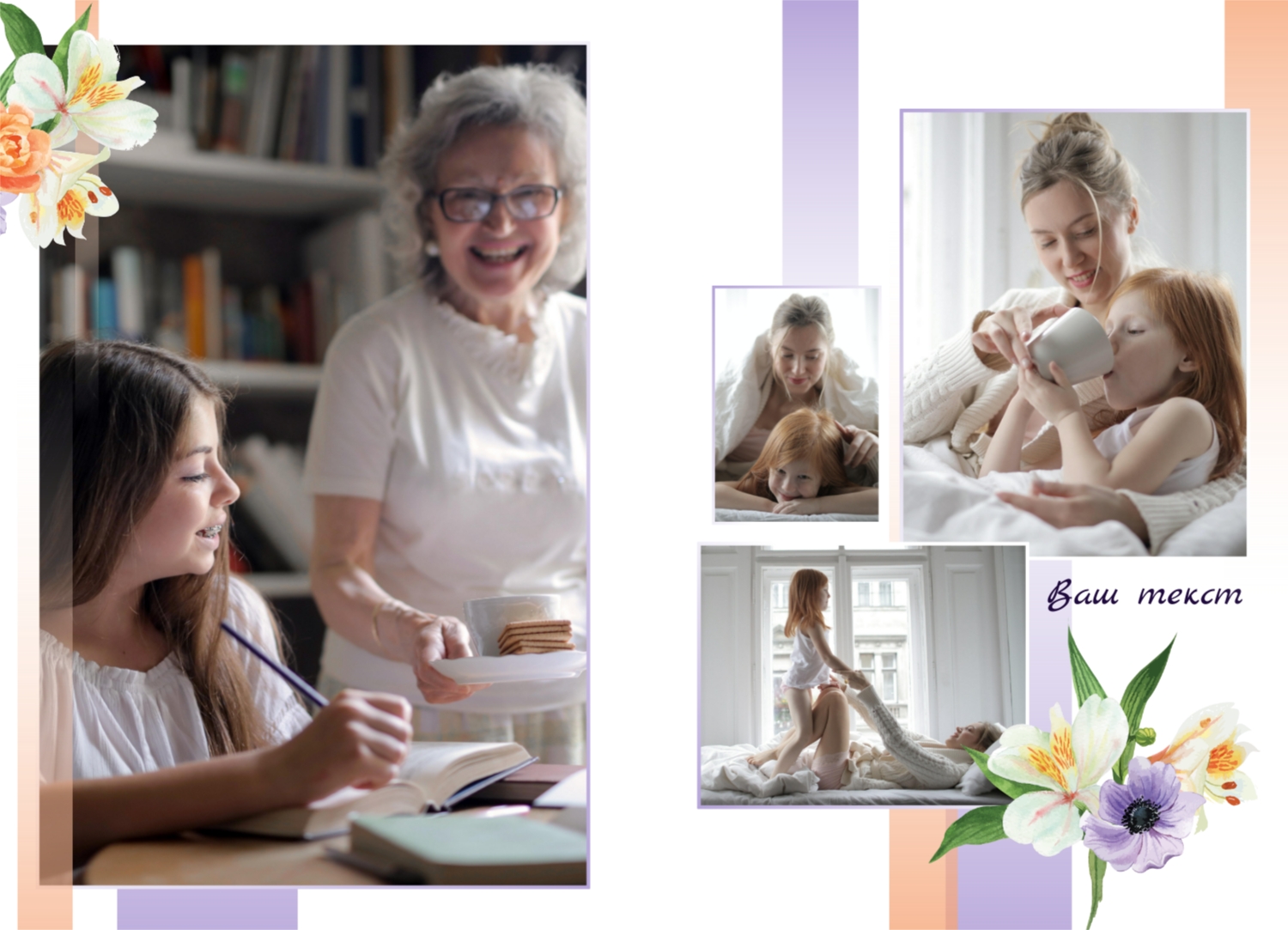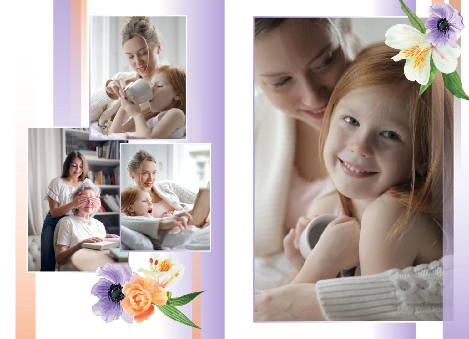Готовият шаблон за сладка вертикална фотокнига с твърди корици за мама е трогателно и сърдечно произведение на изкуството, създадено с любов и внимание към детайлите. Този шаблон е идеален не само за създаване на фотокнига като подарък за Деня на майката или за рожден ден, но и за специалисти в областта на семейната фотография, дизайнери, ръчно изработени майстори, учители за ранно развитие и всички, които работят с темата за семейството, децата и топлината на дома. В онлайн дизайнера шаблонът лесно се адаптира към индивидуалния стил. Можете да промените фона на всяка страница, да добавяте или изтривате снимки, да редактирате надписи и заглавия, да избирате шрифтове, да играете с цветове и композиция. Благодарение на гъвкавите възможности за редактиране, фотокнигата се превръща в истинско персонализирано послание — било то история за първата година от живота на бебето, хроника на семеен уикенд или приятни спомени от съвместни празници.