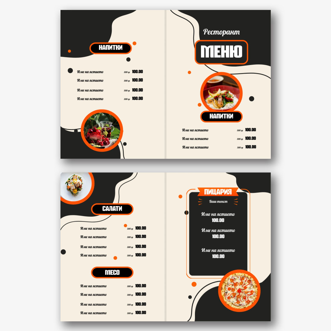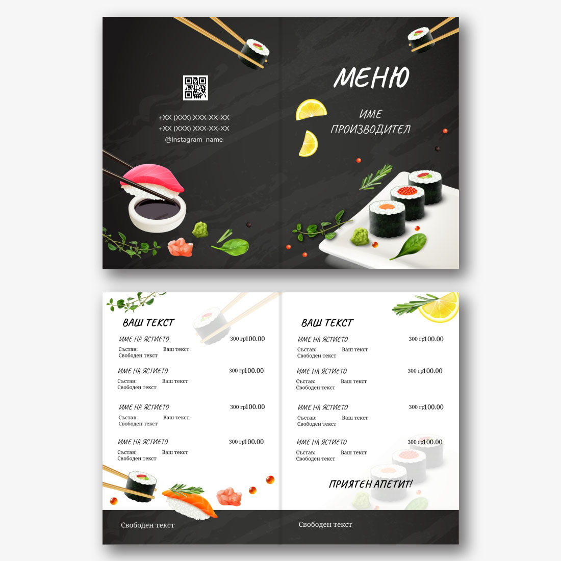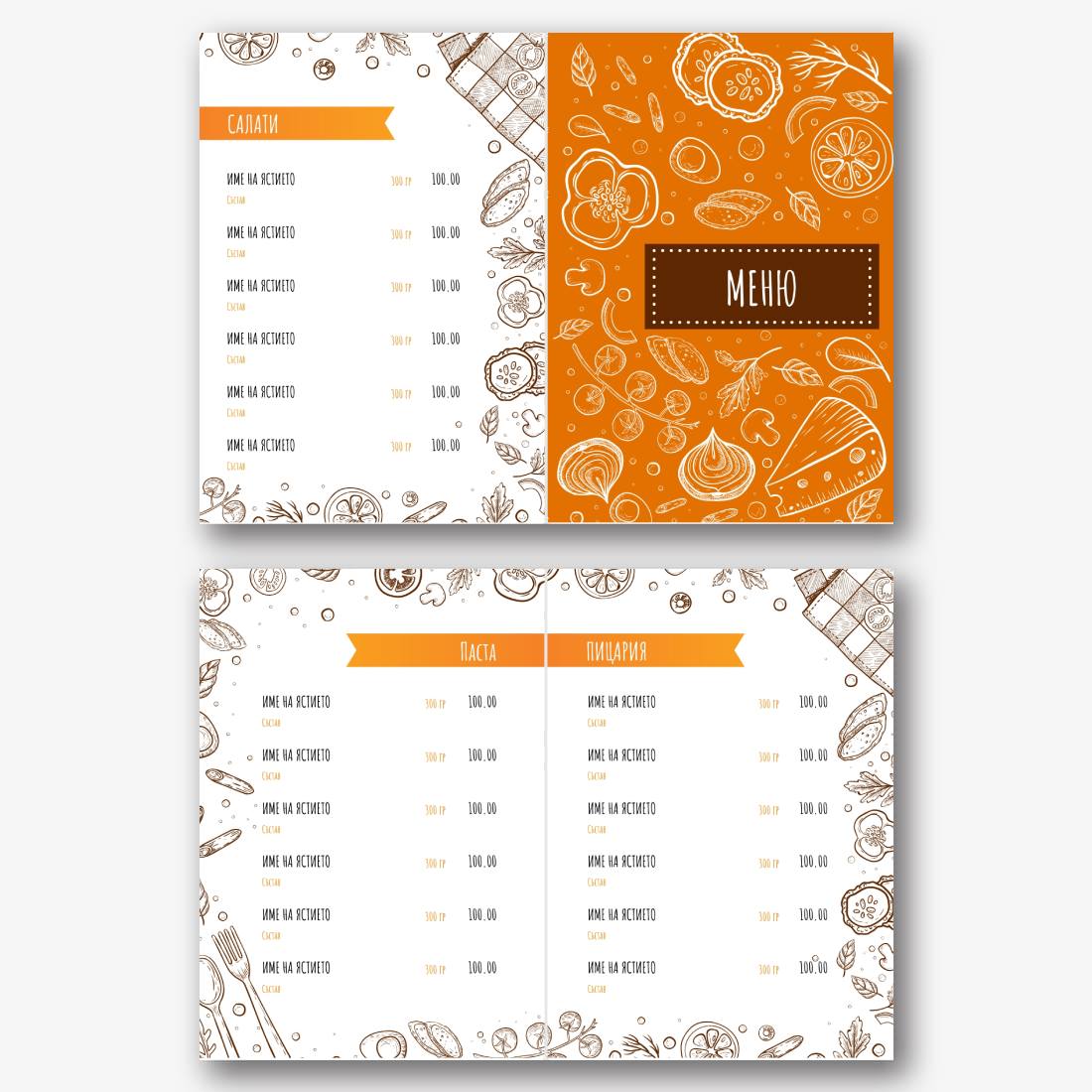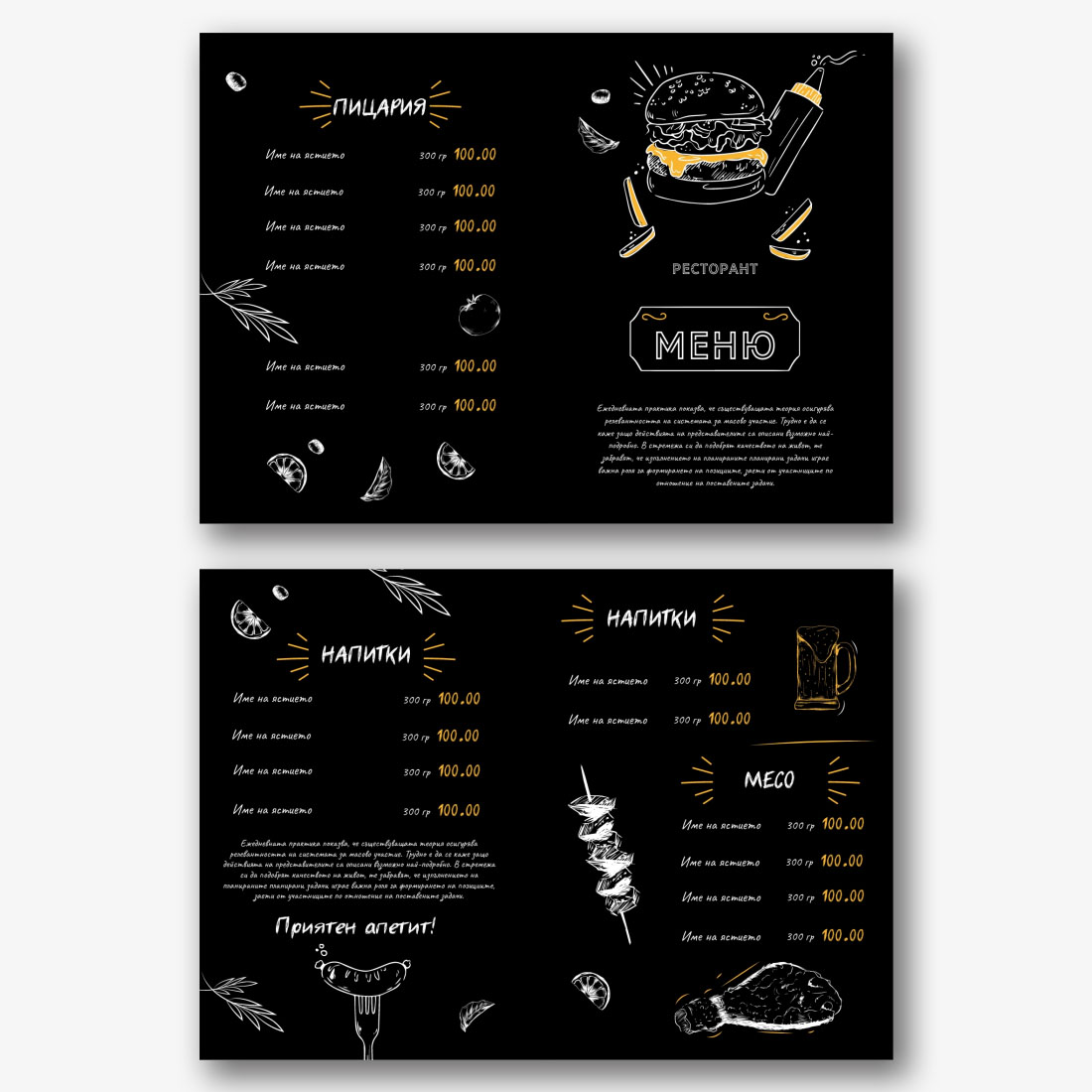 Готовият шаблон за основно меню-брошура за ресторант е удобна и стилна основа за създаване на собствен дизайн на марката. Дизайнът на шаблона е обмислен до най-малкия детайл: кокетна структура, хармонична комбинация от шрифтове и цветове, визуални акценти, които подчертават секциите от менюто на брошурата. Основното предимство на шаблона е възможността за гъвкаво редактиране в онлайн конструктора. Можете самостоятелно да замените имената на ястията, описанията, цените, шрифтовете, както и да качите логото на заведението или да промените цветовата схема, за да съответства на корпоративната идентичност. Всеки елемент лесно се премества, мащабира и редактира директно в браузъра, без да е необходимо да инсталирате допълнителен софтуер. Ако вашето заведение често актуализира асортимента си или има сезонни промоции, можете бързо да направите промени и да запазите няколко опции от менюто за различни периоди. Създаването на меню със собствените си ръце в онлайн конструктор е начин да подчертаете уникалността на институцията, да се откроите от конкурентите и да направите впечатление на гостите още преди да сервирате първото ястие.