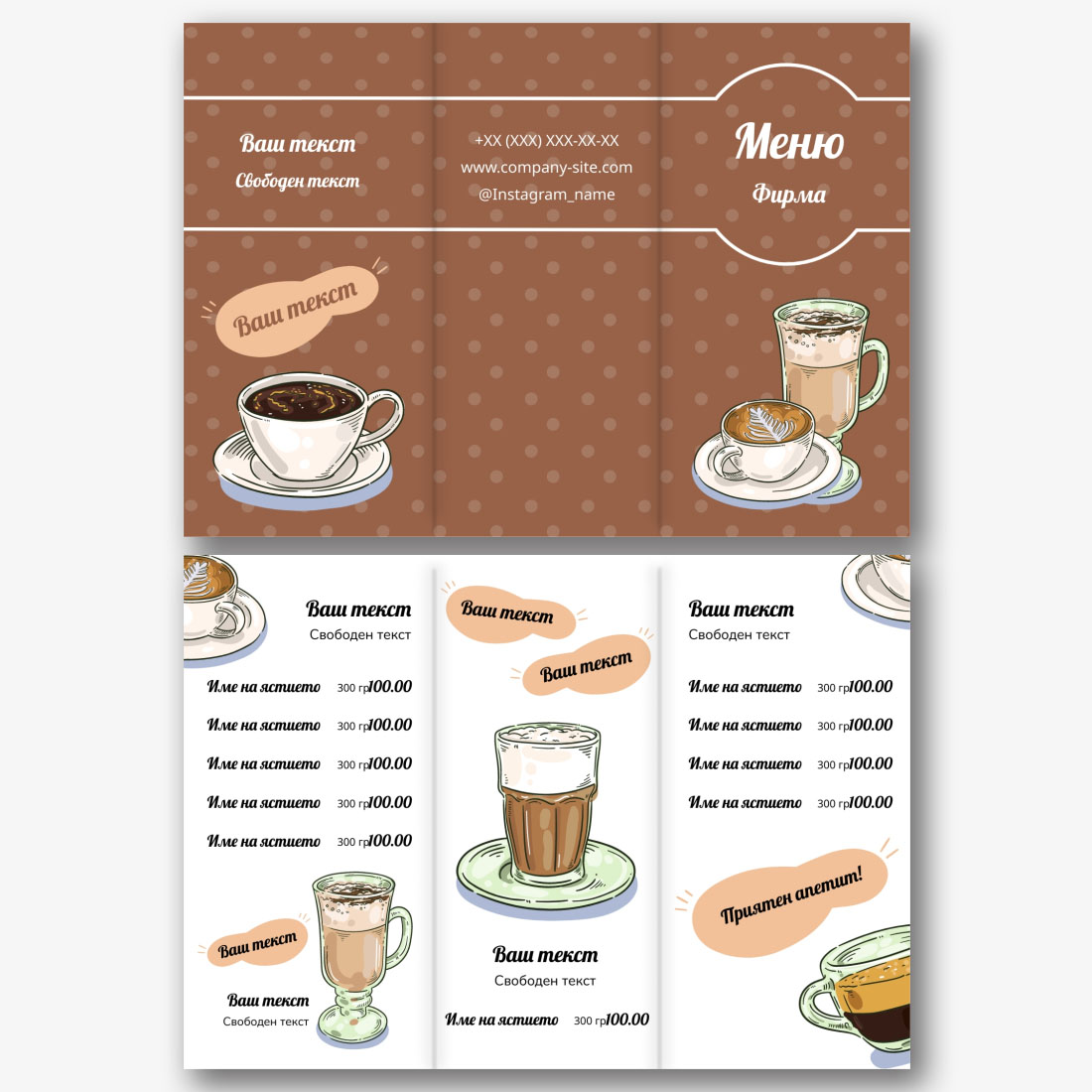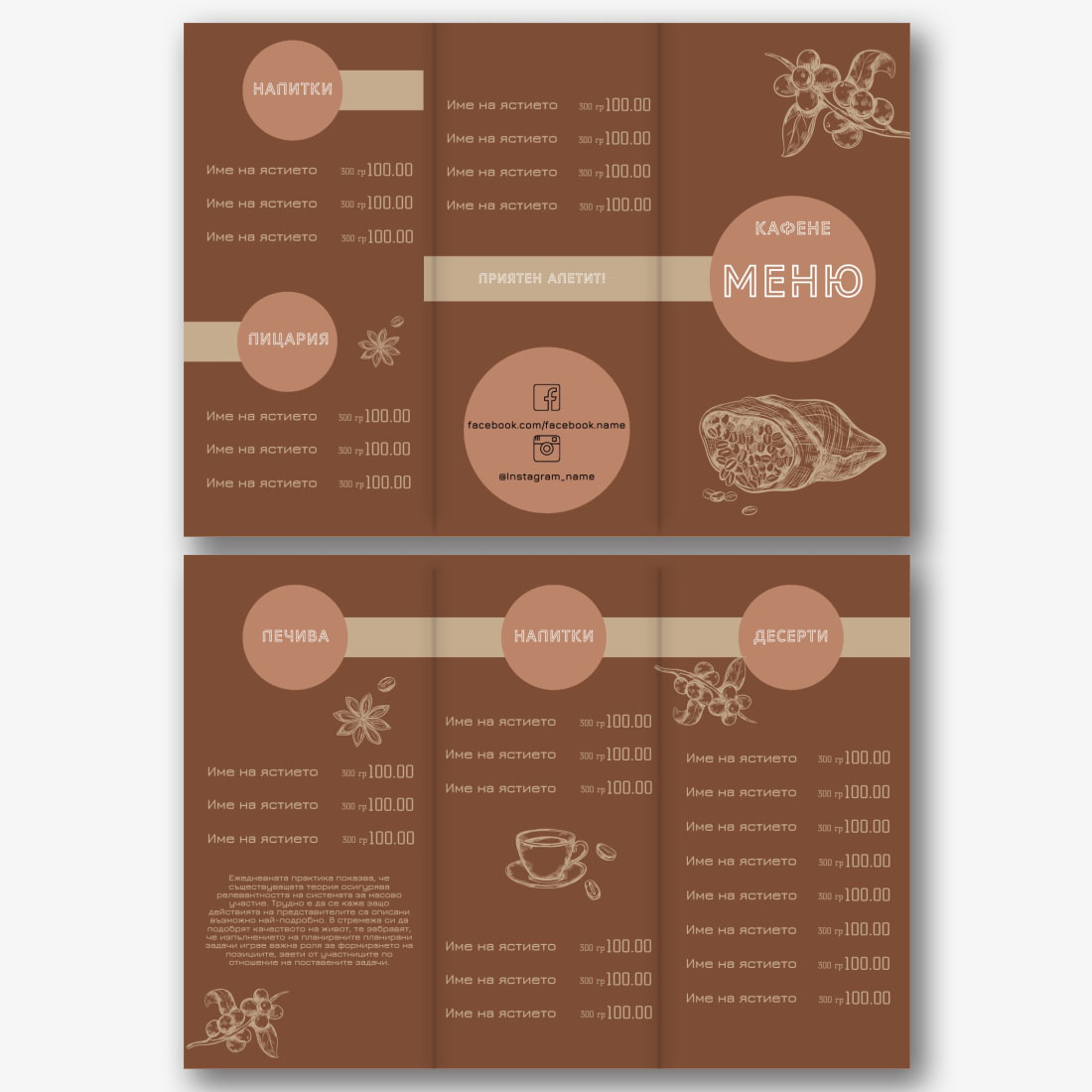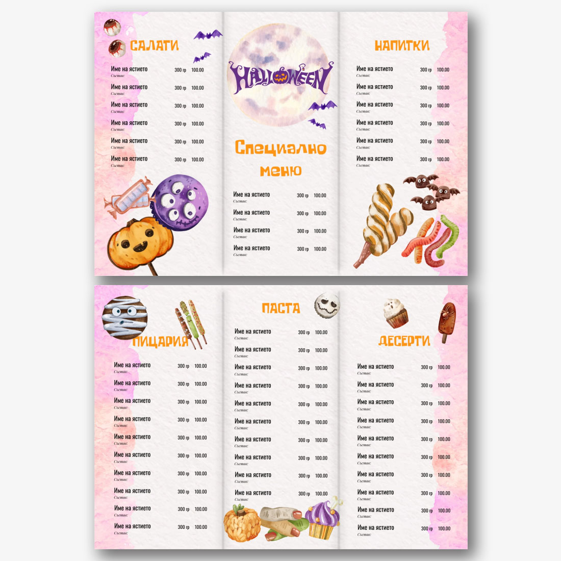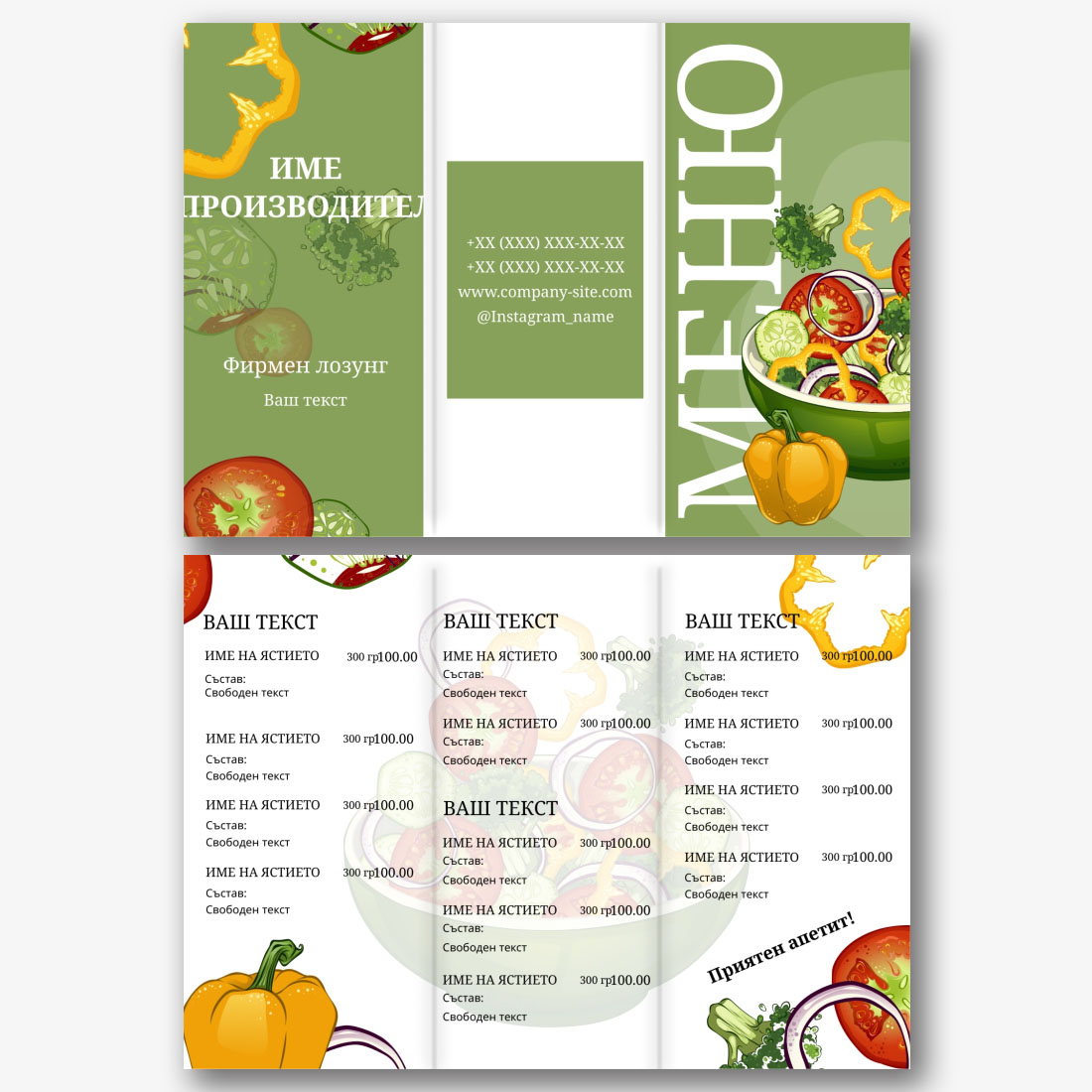 Готовият шаблон за меню на брошура за ресторант за суши и ролки е създаден специално за тези, които искат да подчертаят атмосферата на ориенталската кухня и в същото време да получат модерно, стилно оформление без допълнителни усилия. В онлайн дизайнера този шаблон може да бъде напълно адаптиран към нуждите на конкретна институция. Лесно променяте имената и описанията на ястията, редактирате цените, добавяте нови артикули или премахвате тези, които вече не са актуални. Шрифтовете, цветовете и фоновете могат да бъдат персонализирани, за да съответстват на фирмената идентичност на ресторанта. Ако желаете, можете да добавите лого, данни за контакт, 0-код за онлайн поръчка или снимки на ястия, за да направите менюто още по-привлекателно и информативно.