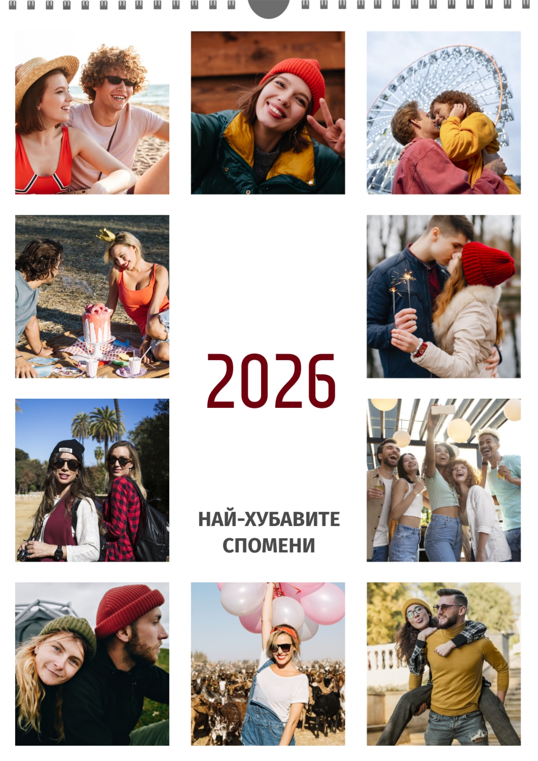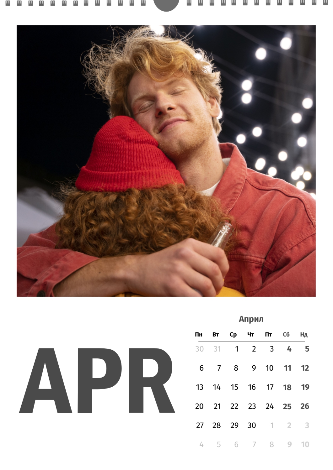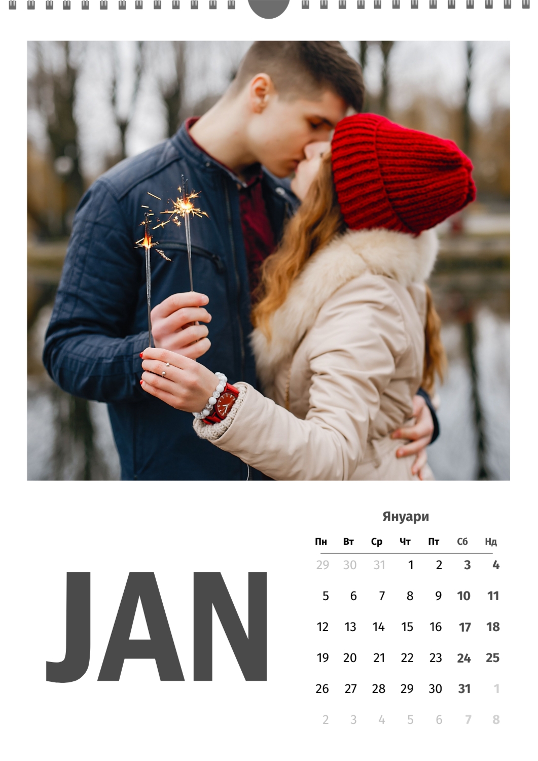 Готовият шаблон за календар за влюбени е идеалният начин да запазите най — добрите си моменти и да ги направите част от всеки ден. Този шаблон е създаден, като се вземат предвид романтичните теми: нежни цветове, стилни декоративни елементи и хармонична композиция създават атмосфера на топлина и комфорт. Шаблонът е идеален за двойки, които искат да подчертаят чувствата си, както и за използване в професионална област, свързана с празници, сватби или творчество. Например, той може да бъде адаптиран за сватбени фотографи, организатори на събития или дизайнери, създаващи романтични подаръци. Основното предимство на този календар е възможността за пълна персонализация в нашия онлайн конструктор. Можете да качите вашите снимки, да промените текстови елементи или да добавите важни дати, за да направите календара възможно най-уникален. Нашият дизайнер ви позволява лесно да персонализирате шрифтове, цветове и дори декоративни елементи, което ви дава пълна свобода да изразявате себе си. Този шаблон дава възможност да се създаде не само календар, но и истински запомнящ се подарък, който ще радва всеки ден. Просто изберете готовата основа, добавете идеите си и се насладете на резултата!