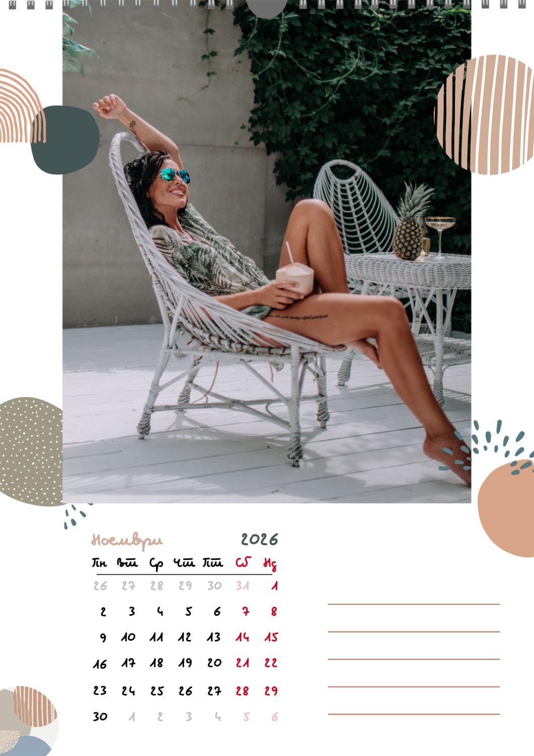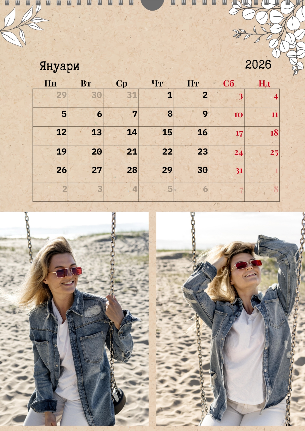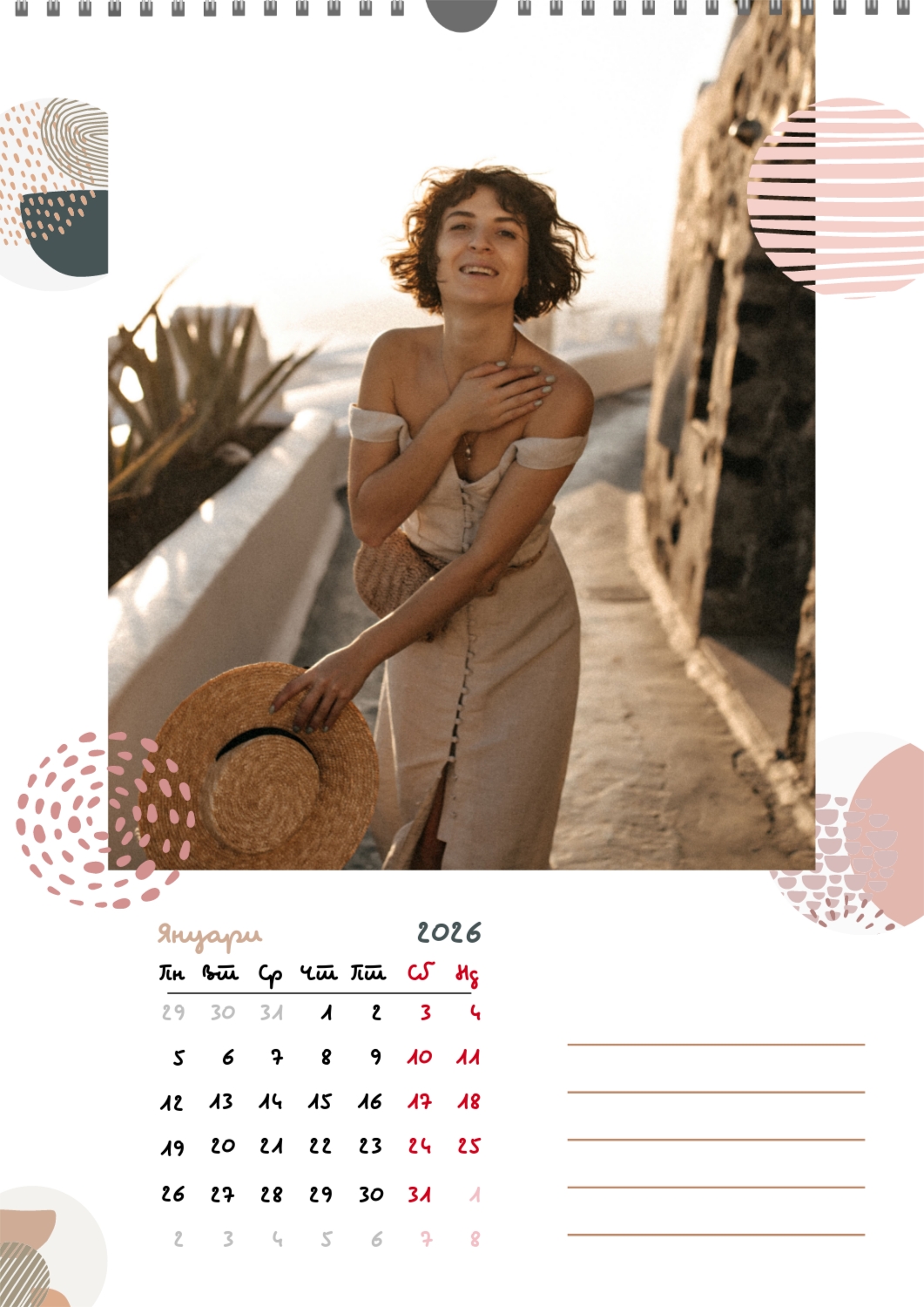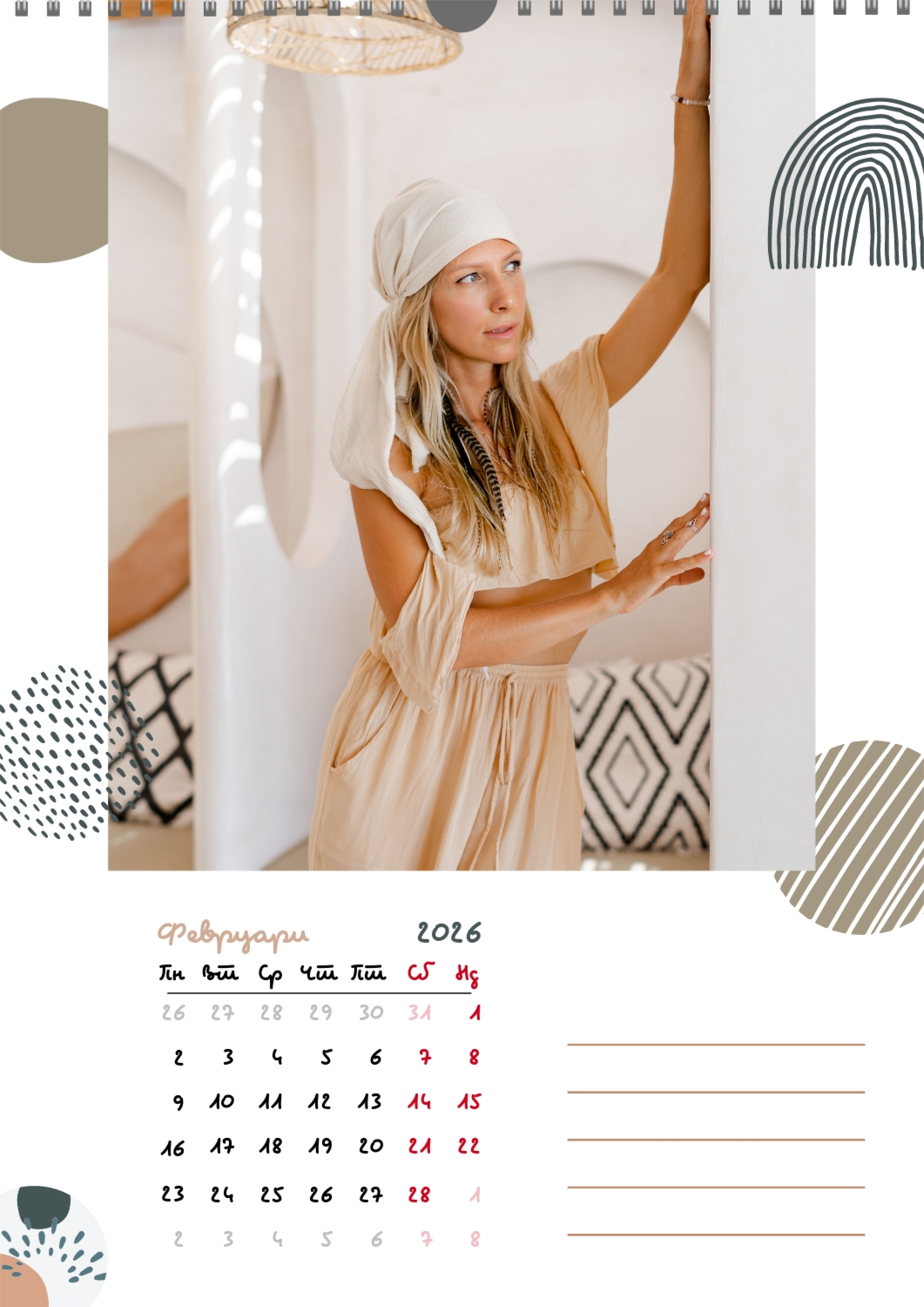 Готовият шаблон за стенен календар" Здравей 2026 " е създаден за тези, които обичат модерния и приятелски стил в декорацията. Дизайнът му съчетава топли нюанси, приятни типографски акценти и лека празнична атмосфера, която помага да посрещнете Новата година с вдъхновение. Такъв календар е подходящ за различни области: от малки творчески студия и семейни работилници до офиси на компании, детски институции, кафенета, салони за красота и дори работни пространства за фрийлансъри. Подходящо е навсякъде, където ценят комфорта, индивидуалността и позитивното настроение. В онлайн дизайнера шаблонът лесно се адаптира към вашите задачи и стил. Можете да замените фона с по-спокоен или обратно ярък, да промените местоположението на месеците, да изберете различен стил на шрифта, да добавите илюстрации, декоративни елементи или снимки. Всеки месец можете да проектирате по свой начин: например да използвате снимки на екипа, любими семейни снимки или изображения на проекти и произведения. Също така е лесно да се въведат важни дати – корпоративни събития, лични празници, срокове или рождени дни на близки. Редактирането е възможно най-просто и интуитивно, без да се изискват специални дизайнерски умения. Всички елементи могат да бъдат преместени, увеличени, пребоядисани и резултатът веднага се показва на екрана. Вие сами оформяте настроението на календара: нежно и домашно, бизнес и сдържано или светло и вдъхновяващо. Използвайки шаблона" Здравей 2026 " в нашия онлайн конструктор, вие създавате не просто календар, а личен декориран акцент на пространството, който ще радва и вдъхновява през цялата година.