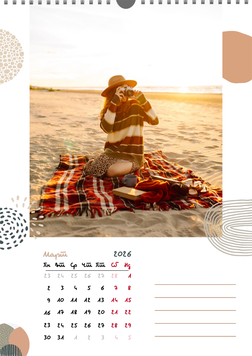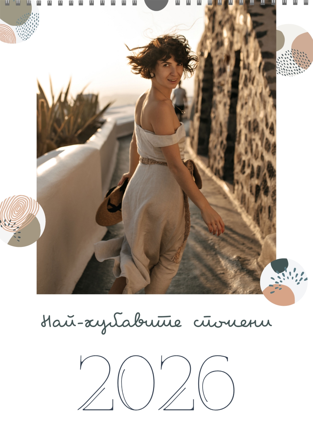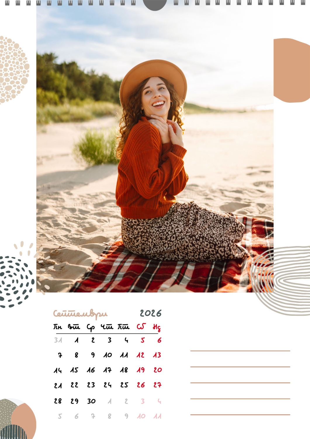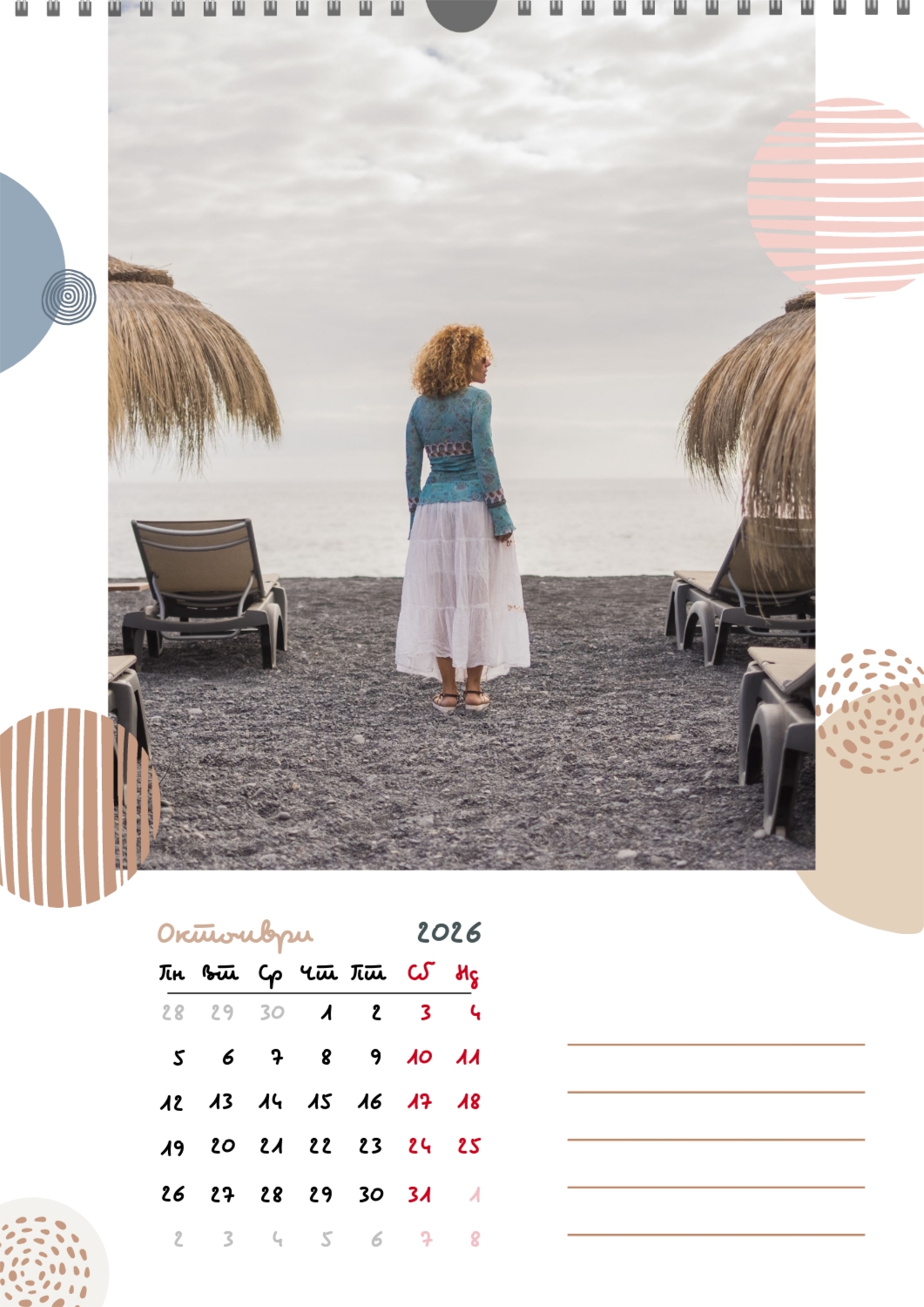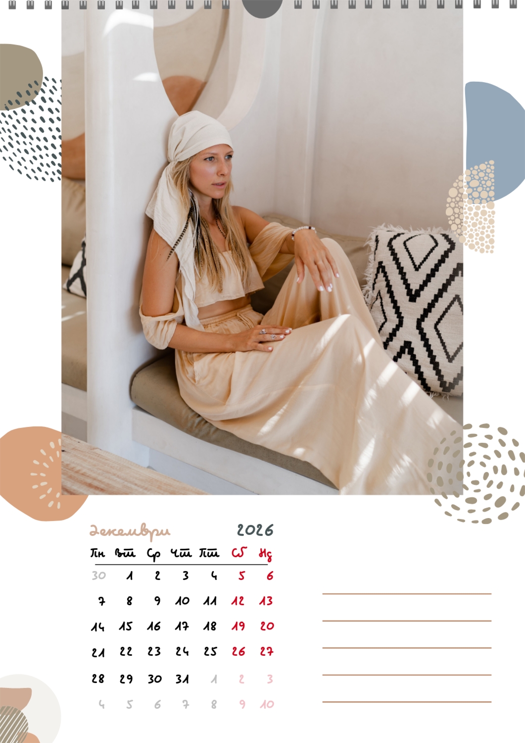 Готовият шаблон за стенен календар" Здравей 2026 " е създаден за тези, които обичат модерния и приятелски стил в декорацията. Дизайнът му съчетава топли нюанси, приятни типографски акценти и лека празнична атмосфера, която помага да посрещнете Новата година с вдъхновение. Такъв календар е подходящ за различни области: от малки творчески студия и семейни работилници до офиси на компании, детски институции, кафенета, салони за красота и дори работни пространства за фрийлансъри. Подходящо е навсякъде, където ценят комфорта, индивидуалността и позитивното настроение. В онлайн дизайнера шаблонът лесно се адаптира към вашите задачи и стил. Можете да замените фона с по-спокоен или обратно ярък, да промените местоположението на месеците, да изберете различен стил на шрифта, да добавите илюстрации, декоративни елементи или снимки. Всеки месец можете да проектирате по свой начин: например да използвате снимки на екипа, любими семейни снимки или изображения на проекти и произведения. Също така е лесно да се въведат важни дати – корпоративни събития, лични празници, срокове или рождени дни на близки. Редактирането е възможно най-просто и интуитивно, без да се изискват специални дизайнерски умения. Всички елементи могат да бъдат преместени, увеличени, пребоядисани и резултатът веднага се показва на екрана. Вие сами оформяте настроението на календара: нежно и домашно, бизнес и сдържано или светло и вдъхновяващо. Използвайки шаблона" Здравей 2026 " в нашия онлайн конструктор, вие създавате не просто календар, а личен декориран акцент на пространството, който ще радва и вдъхновява през цялата година.