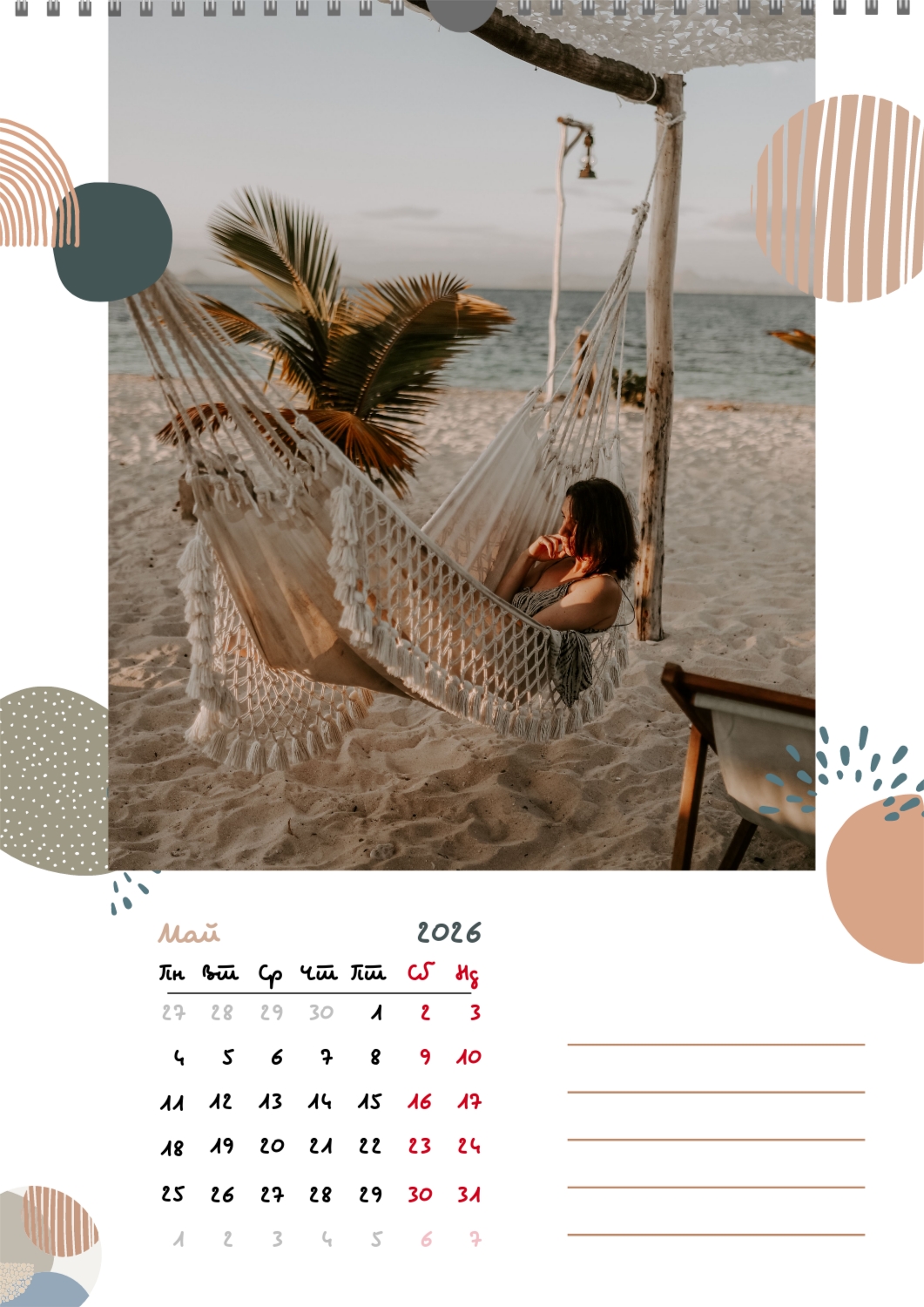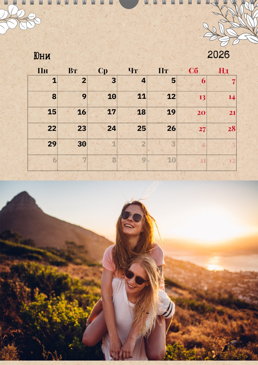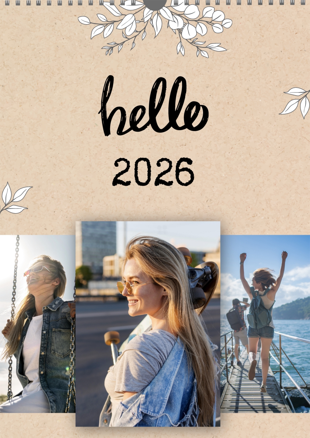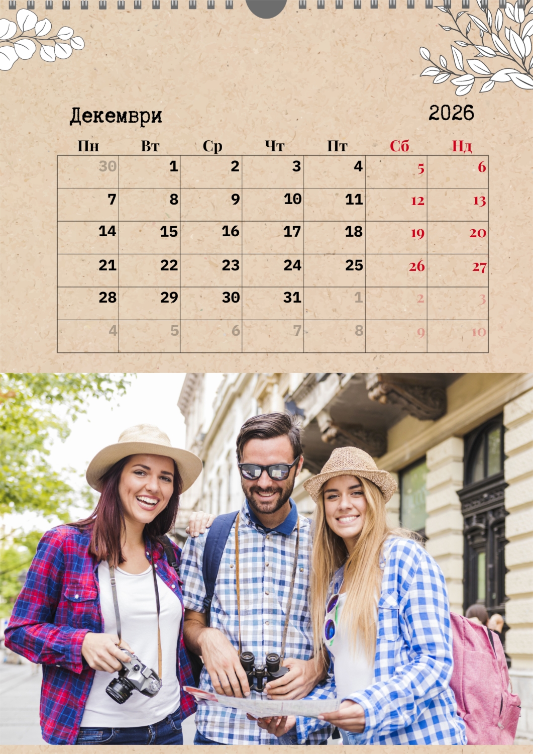 Готовият шаблон за стенен календар" Здравей 2026 " е създаден за тези, които обичат модерния и приятелски стил в декорацията. Дизайнът му съчетава топли нюанси, приятни типографски акценти и лека празнична атмосфера, която помага да посрещнете Новата година с вдъхновение. Такъв календар е подходящ за различни области: от малки творчески студия и семейни работилници до офиси на компании, детски институции, кафенета, салони за красота и дори работни пространства за фрийлансъри. Подходящо е навсякъде, където ценят комфорта, индивидуалността и позитивното настроение. В онлайн дизайнера шаблонът лесно се адаптира към вашите задачи и стил. Можете да замените фона с по-спокоен или обратно ярък, да промените местоположението на месеците, да изберете различен стил на шрифта, да добавите илюстрации, декоративни елементи или снимки. Всеки месец можете да проектирате по свой начин: например да използвате снимки на екипа, любими семейни снимки или изображения на проекти и произведения. Също така е лесно да се въведат важни дати – корпоративни събития, лични празници, срокове или рождени дни на близки. Редактирането е възможно най-просто и интуитивно, без да се изискват специални дизайнерски умения. Всички елементи могат да бъдат преместени, увеличени, пребоядисани и резултатът веднага се показва на екрана. Вие сами оформяте настроението на календара: нежно и домашно, бизнес и сдържано или светло и вдъхновяващо. Използвайки шаблона" Здравей 2026 " в нашия онлайн конструктор, вие създавате не просто календар, а личен декориран акцент на пространството, който ще радва и вдъхновява през цялата година.