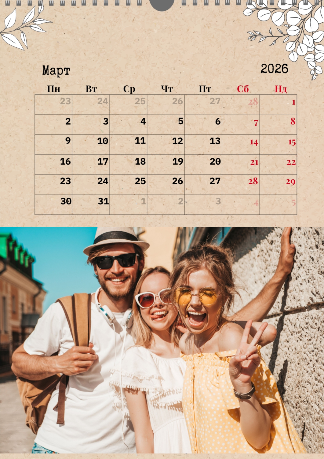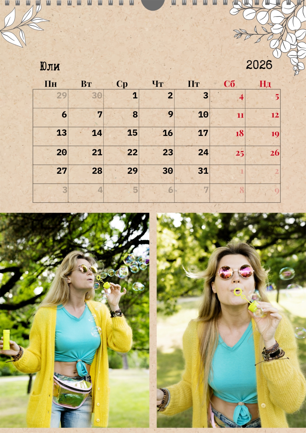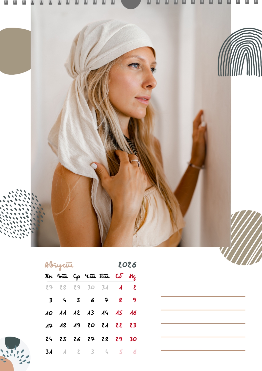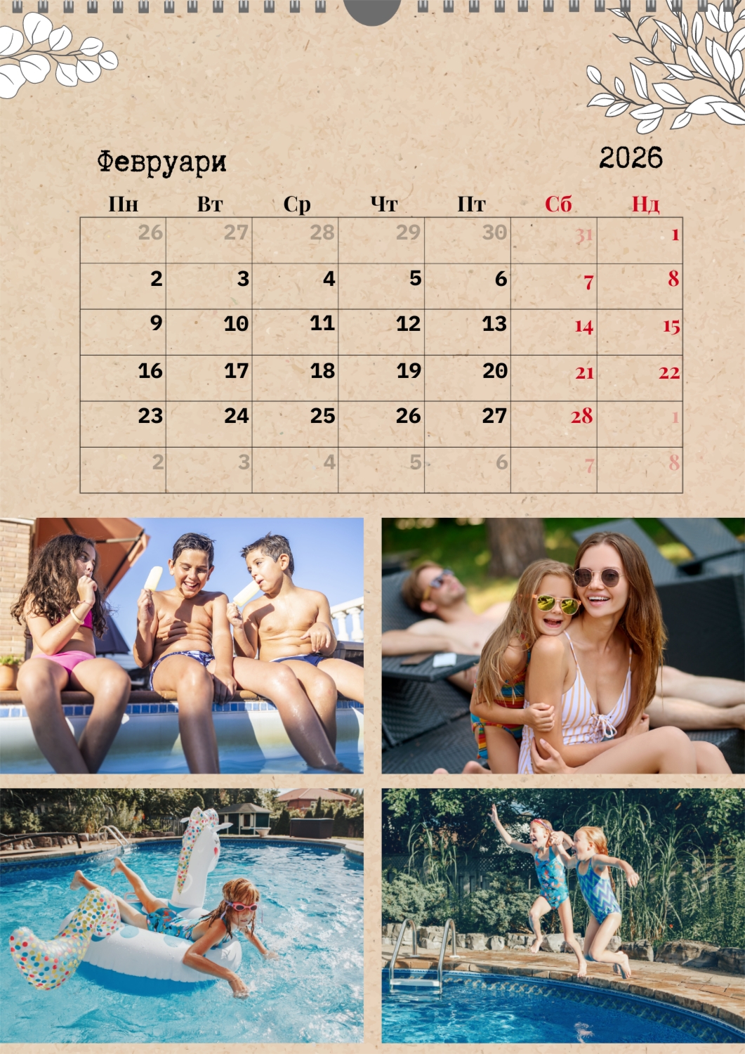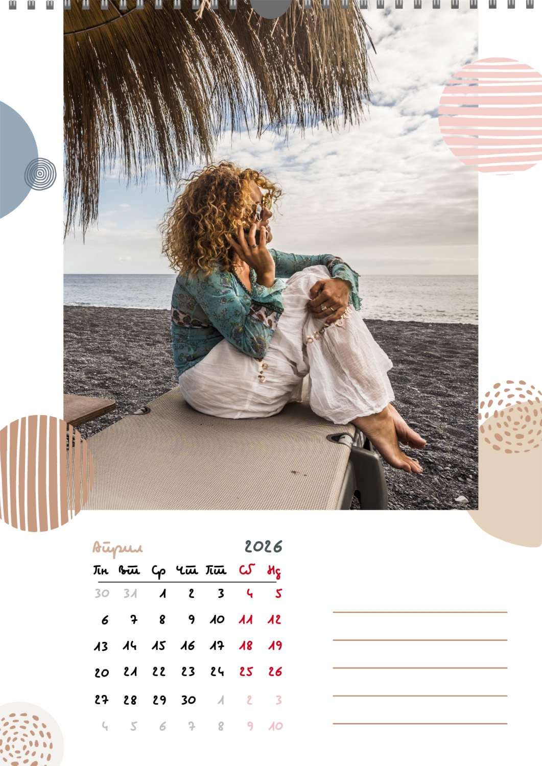 Готовият шаблон за стенен календар" Здравей 2026 " е създаден за тези, които обичат модерния и приятелски стил в декорацията. Дизайнът му съчетава топли нюанси, приятни типографски акценти и лека празнична атмосфера, която помага да посрещнете Новата година с вдъхновение. Такъв календар е подходящ за различни области: от малки творчески студия и семейни работилници до офиси на компании, детски институции, кафенета, салони за красота и дори работни пространства за фрийлансъри. Подходящо е навсякъде, където ценят комфорта, индивидуалността и позитивното настроение. В онлайн дизайнера шаблонът лесно се адаптира към вашите задачи и стил. Можете да замените фона с по-спокоен или обратно ярък, да промените местоположението на месеците, да изберете различен стил на шрифта, да добавите илюстрации, декоративни елементи или снимки. Всеки месец можете да проектирате по свой начин: например да използвате снимки на екипа, любими семейни снимки или изображения на проекти и произведения. Също така е лесно да се въведат важни дати – корпоративни събития, лични празници, срокове или рождени дни на близки. Редактирането е възможно най-просто и интуитивно, без да се изискват специални дизайнерски умения. Всички елементи могат да бъдат преместени, увеличени, пребоядисани и резултатът веднага се показва на екрана. Вие сами оформяте настроението на календара: нежно и домашно, бизнес и сдържано или светло и вдъхновяващо. Използвайки шаблона" Здравей 2026 " в нашия онлайн конструктор, вие създавате не просто календар, а личен декориран акцент на пространството, който ще радва и вдъхновява през цялата година.