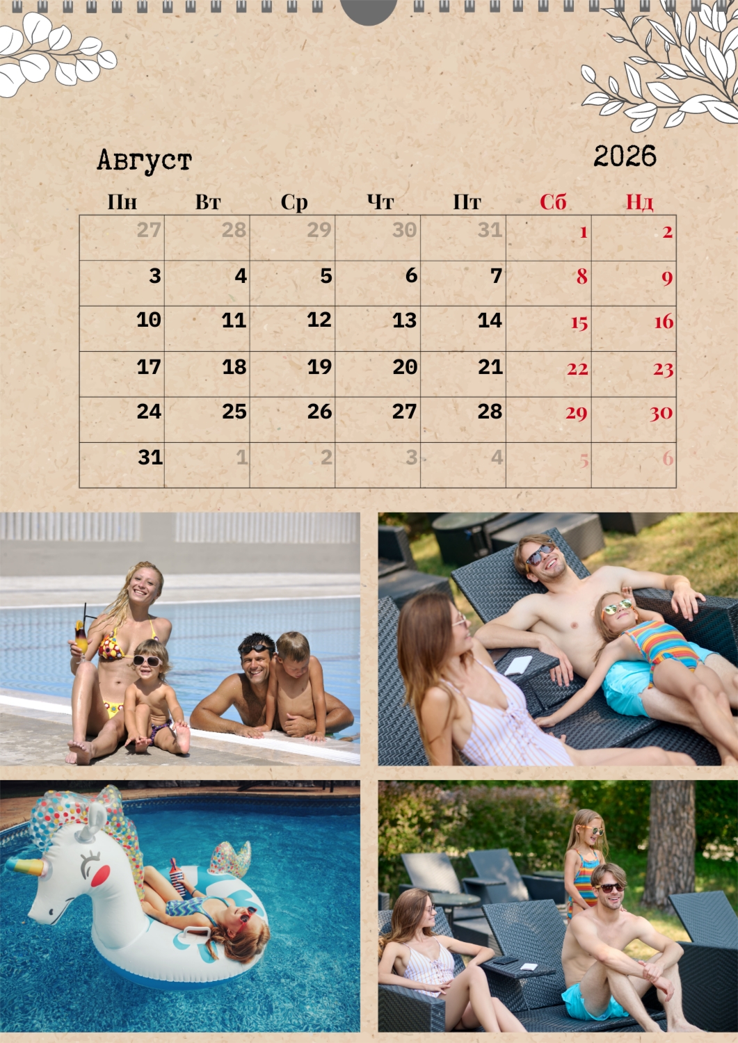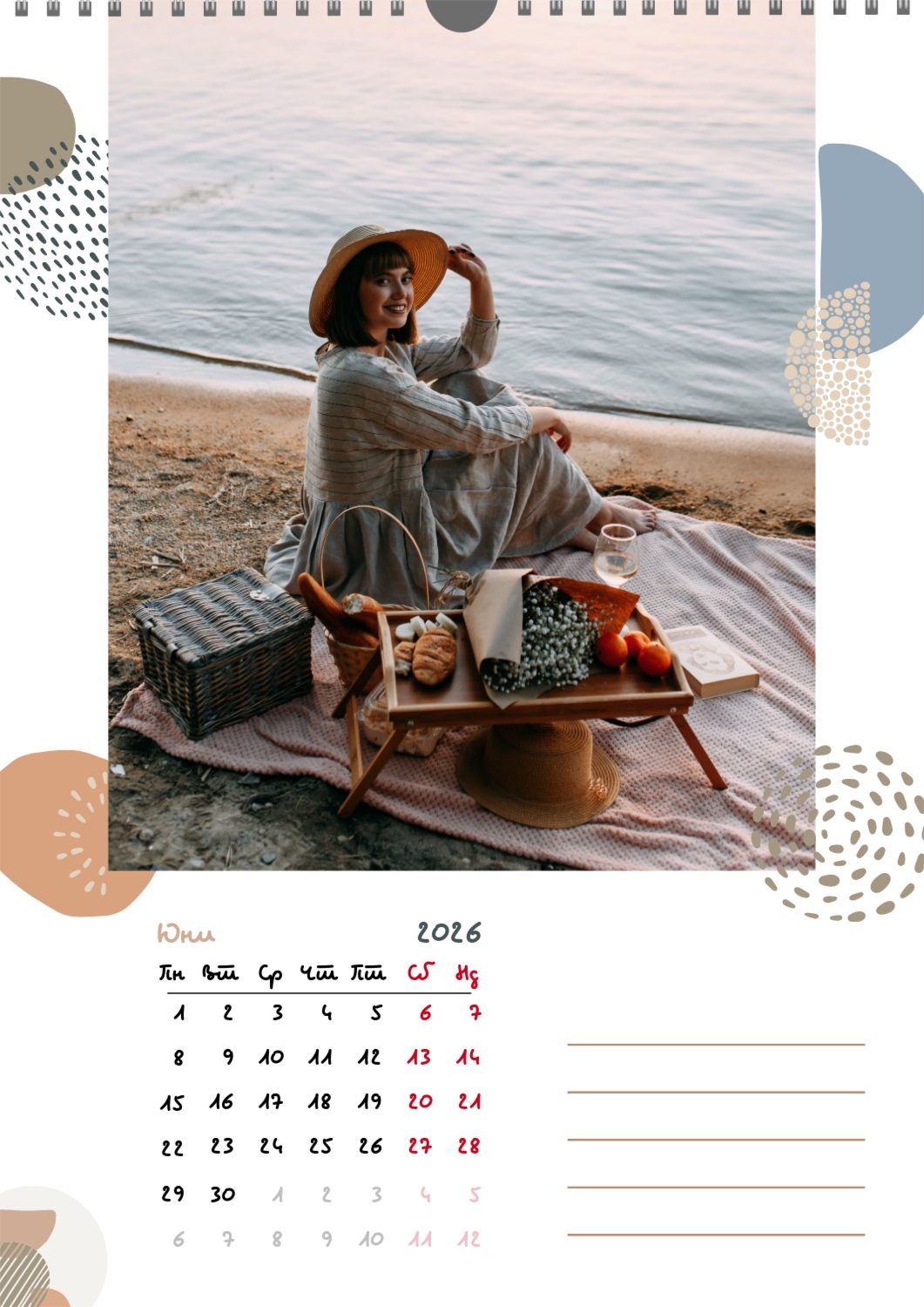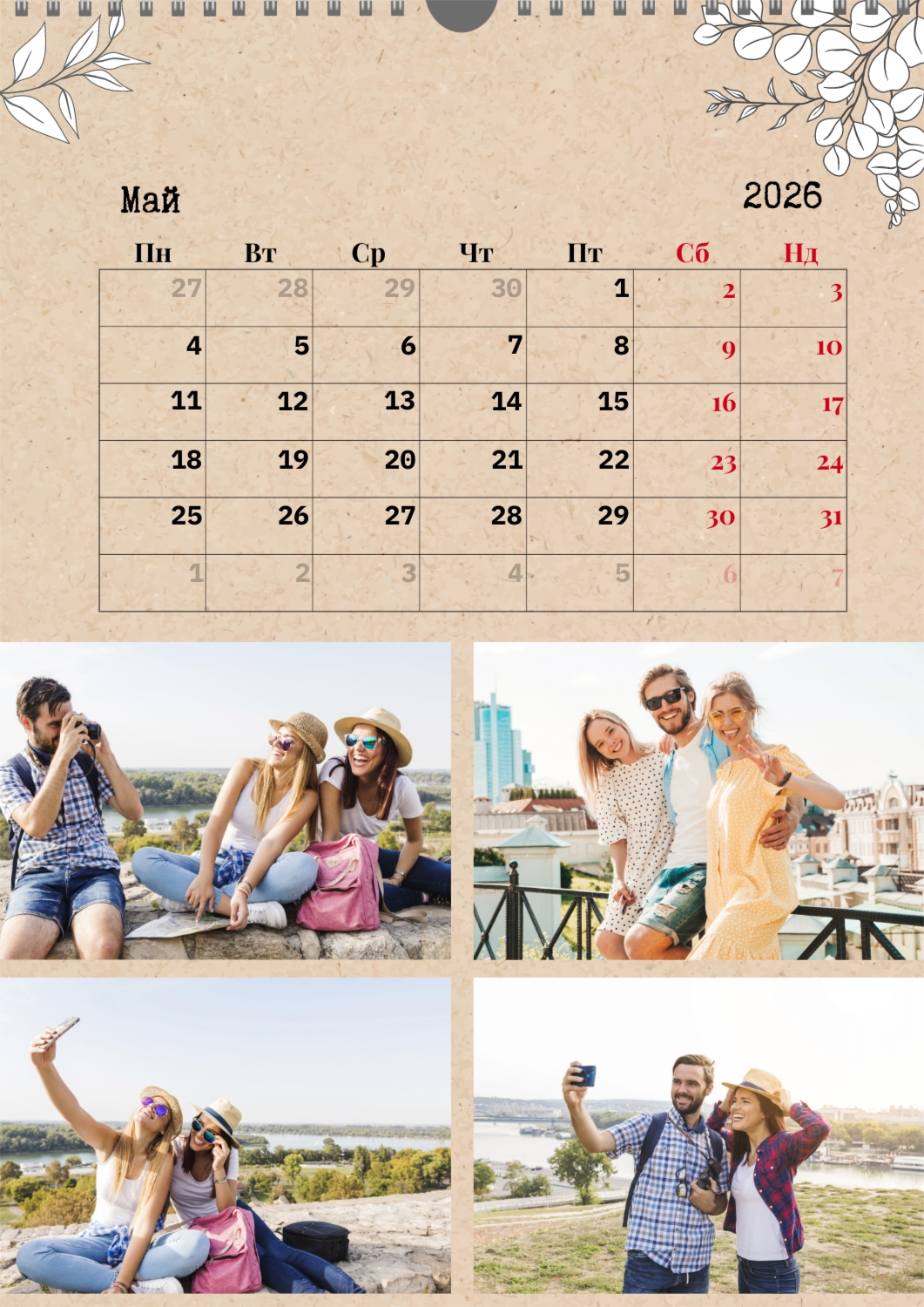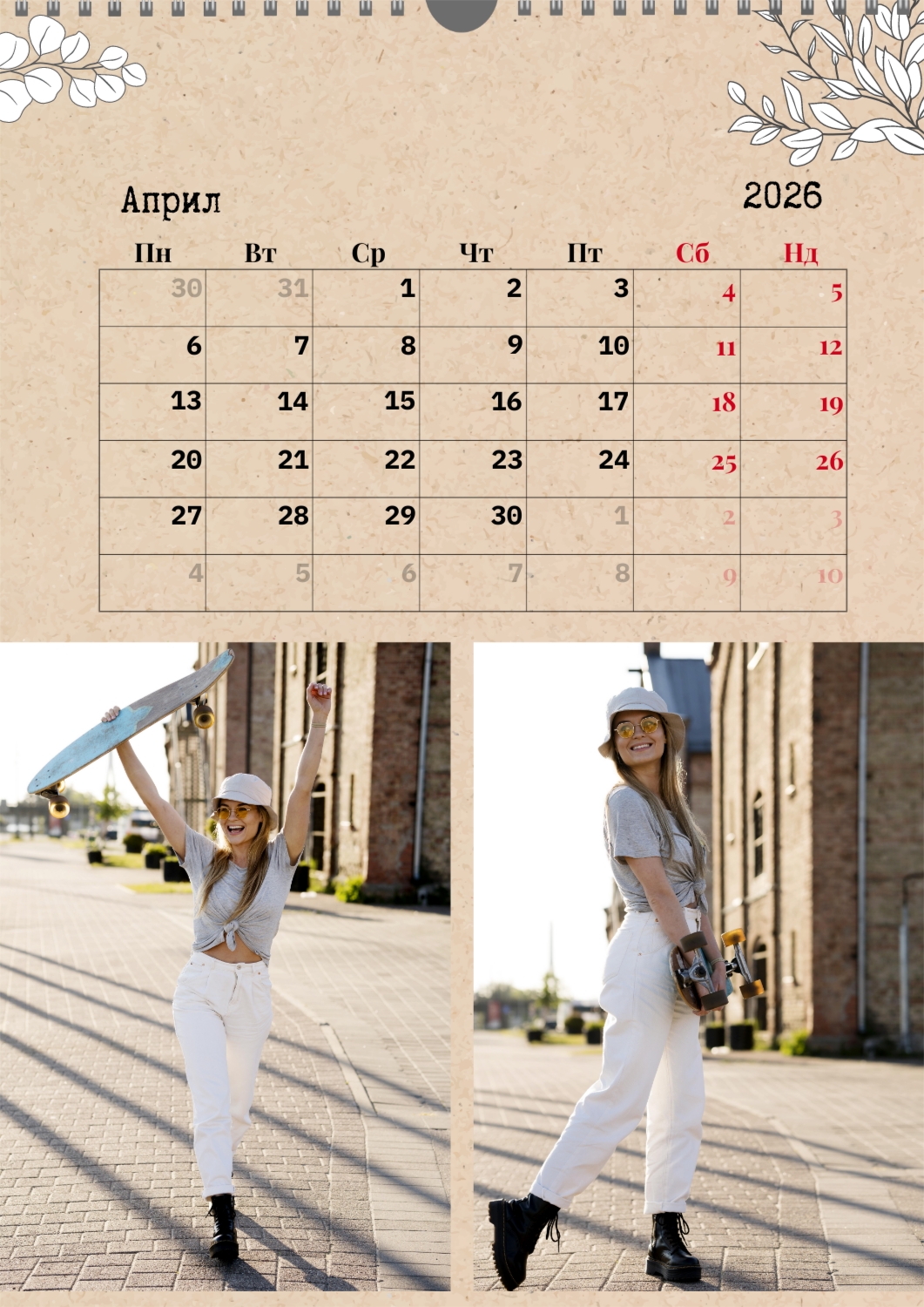 Готовият шаблон за стенен календар" Здравей 2026 " е създаден за тези, които обичат модерния и приятелски стил в декорацията. Дизайнът му съчетава топли нюанси, приятни типографски акценти и лека празнична атмосфера, която помага да посрещнете Новата година с вдъхновение. Такъв календар е подходящ за различни области: от малки творчески студия и семейни работилници до офиси на компании, детски институции, кафенета, салони за красота и дори работни пространства за фрийлансъри. Подходящо е навсякъде, където ценят комфорта, индивидуалността и позитивното настроение. В онлайн дизайнера шаблонът лесно се адаптира към вашите задачи и стил. Можете да замените фона с по-спокоен или обратно ярък, да промените местоположението на месеците, да изберете различен стил на шрифта, да добавите илюстрации, декоративни елементи или снимки. Всеки месец можете да проектирате по свой начин: например да използвате снимки на екипа, любими семейни снимки или изображения на проекти и произведения. Също така е лесно да се въведат важни дати – корпоративни събития, лични празници, срокове или рождени дни на близки. Редактирането е възможно най-просто и интуитивно, без да се изискват специални дизайнерски умения. Всички елементи могат да бъдат преместени, увеличени, пребоядисани и резултатът веднага се показва на екрана. Вие сами оформяте настроението на календара: нежно и домашно, бизнес и сдържано или светло и вдъхновяващо. Използвайки шаблона" Здравей 2026 " в нашия онлайн конструктор, вие създавате не просто календар, а личен декориран акцент на пространството, който ще радва и вдъхновява през цялата година.