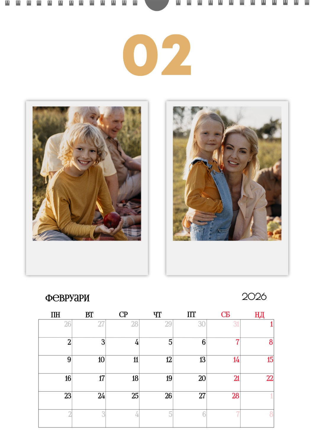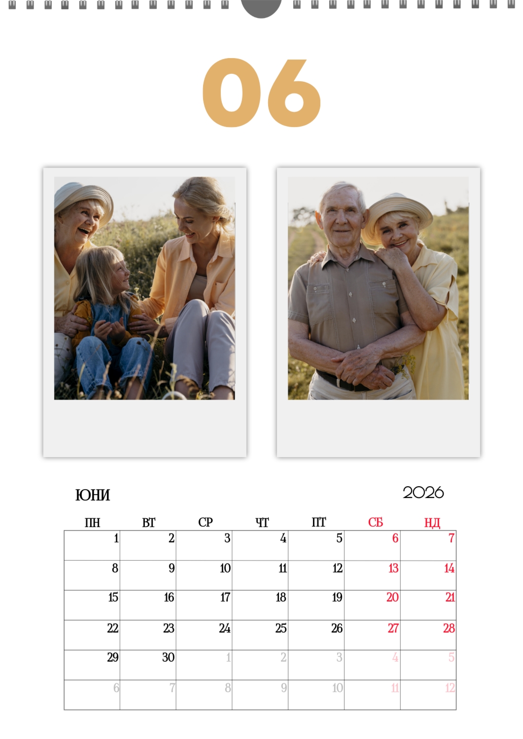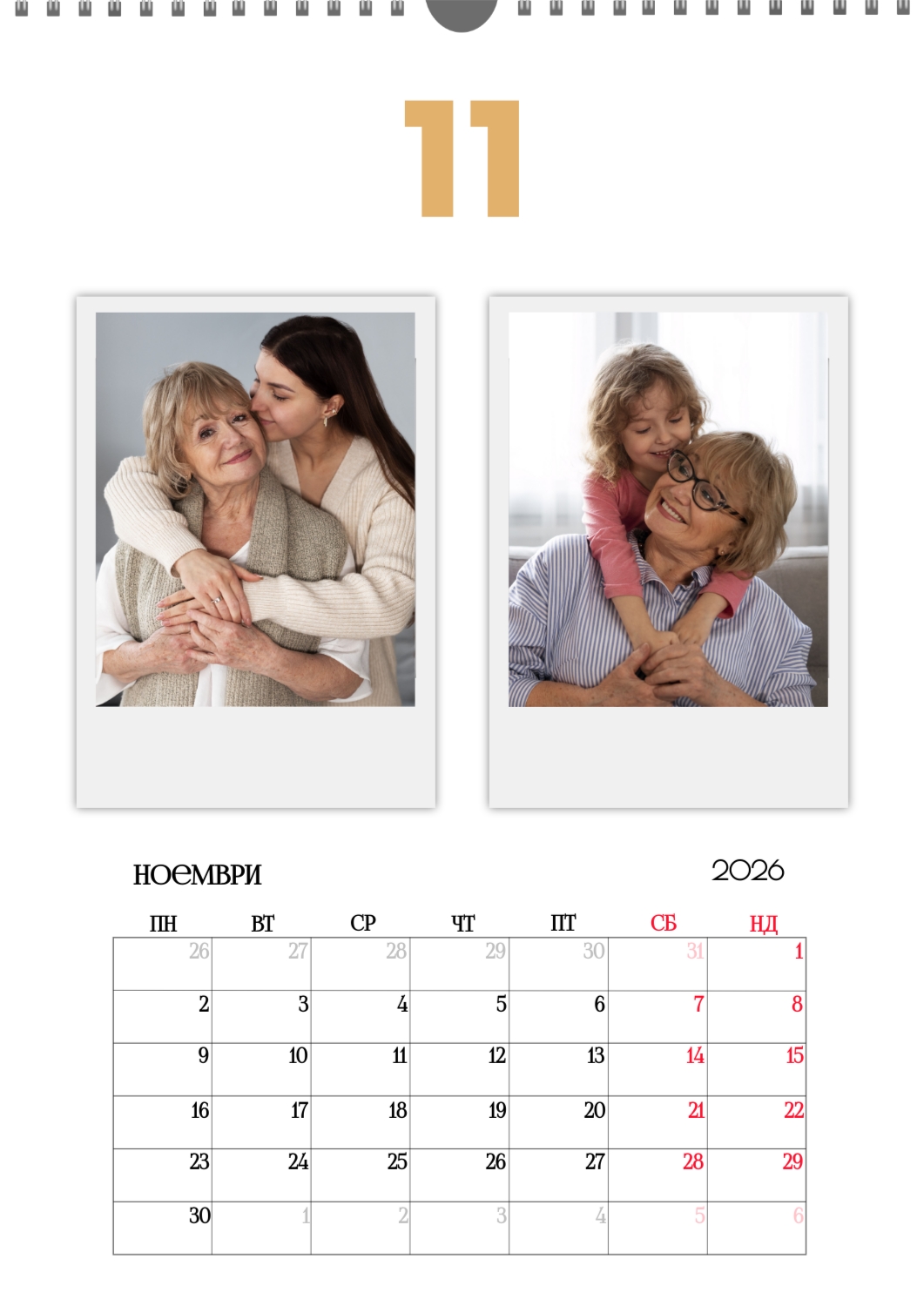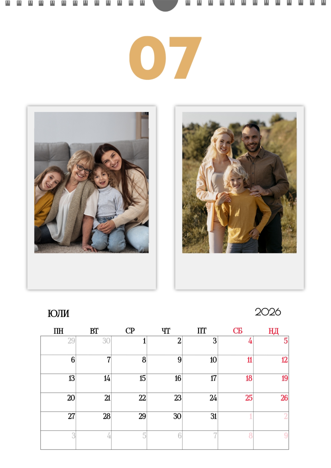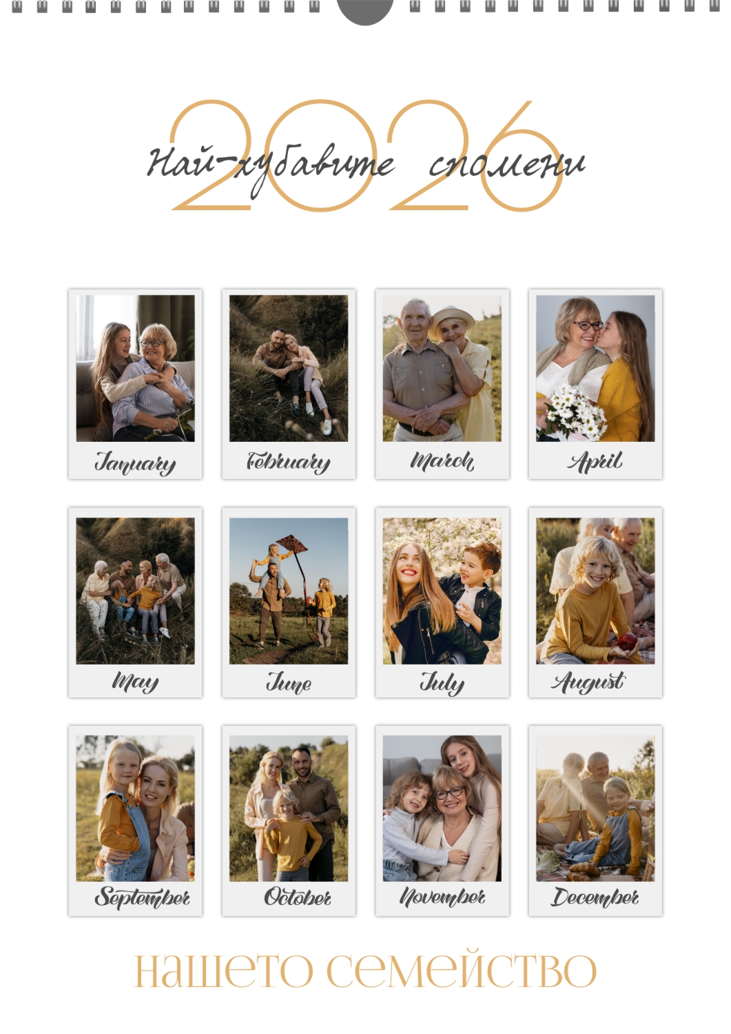 Готовият шаблон за стенен календар" нашето семейство " е създаден за тези, които ценят топлите спомени, атмосферата у дома и искат да проектират всеки месец от годината с душа. Тя се основава на меки, хармонични цветове и спретнати декоративни елементи, които подчертават снимката, без да отвличат вниманието от основното. Такъв календар е идеален за двойки, родители с деца, баби и дядовци, както и за всички, които искат да запазят запомнящите се моменти в разбираема и красива форма. Той е еднакво подходящ както като личен аксесоар за стена у дома, така и като топъл подарък за близки, колеги или клиенти. В онлайн дизайнера този шаблон лесно се трансформира в индивидуални задачи. Можете да замените снимките с любимите си снимки, да изберете различен стил на шрифта, да промените цветовете на надписите и акцентите, да добавите имена, важни дати, запомнящи се събития и семейни празници. Всеки елемент в шаблона може да бъде преместен, мащабиран или изтрит и, ако желаете, да добавите нови декоративни детайли, например малки икони, рамки или тематични изображения. Календарът" нашето семейство " е подходящ не само за домашна употреба. Често се използва от фотографи за създаване на готови продукти за клиенти, детски студия за подаръци на родители, семейни центрове за творчество, както и ръчно изработени майстори, които проектират уютни комплекти и сувенири. Благодарение на удобството на онлайн конструктора, работата с шаблона е напълно неусложнена-дори ако за първи път създавате персонализиран дизайн, процесът ще бъде интуитивен и приятен.