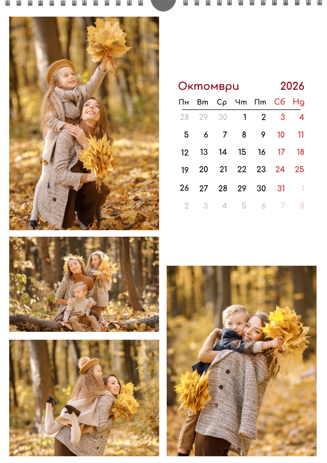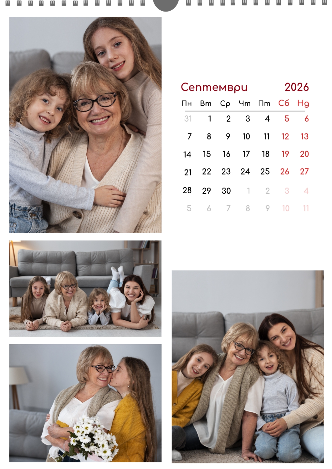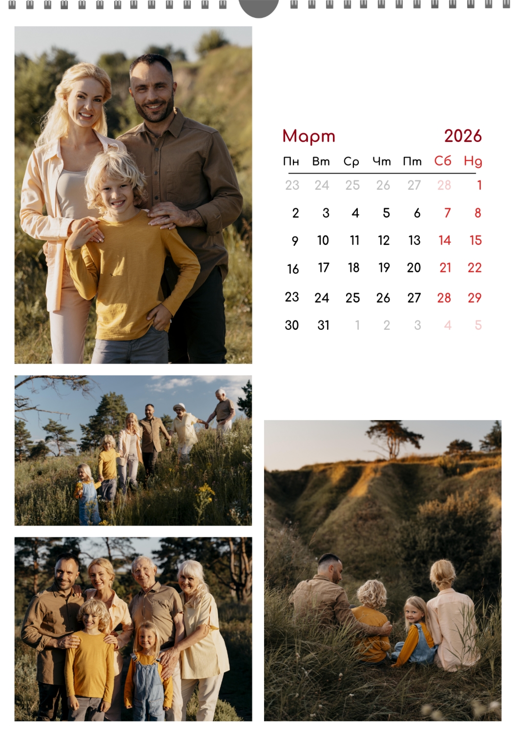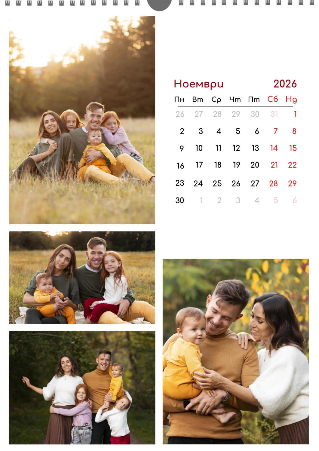 Готовият шаблон за стенен календар" нашето семейство " е създаден за тези, които ценят топлите спомени, атмосферата у дома и искат да проектират всеки месец от годината с душа. Тя се основава на меки, хармонични цветове и спретнати декоративни елементи, които подчертават снимката, без да отвличат вниманието от основното. Такъв календар е идеален за двойки, родители с деца, баби и дядовци, както и за всички, които искат да запазят запомнящите се моменти в разбираема и красива форма. Той е еднакво подходящ както като личен аксесоар за стена у дома, така и като топъл подарък за близки, колеги или клиенти. В онлайн дизайнера този шаблон лесно се трансформира в индивидуални задачи. Можете да замените снимките с любимите си снимки, да изберете различен стил на шрифта, да промените цветовете на надписите и акцентите, да добавите имена, важни дати, запомнящи се събития и семейни празници. Всеки елемент в шаблона може да бъде преместен, мащабиран или изтрит и, ако желаете, да добавите нови декоративни детайли, например малки икони, рамки или тематични изображения. Календарът" нашето семейство " е подходящ не само за домашна употреба. Често се използва от фотографи за създаване на готови продукти за клиенти, детски студия за подаръци на родители, семейни центрове за творчество, както и ръчно изработени майстори, които проектират уютни комплекти и сувенири. Благодарение на удобството на онлайн конструктора, работата с шаблона е напълно неусложнена-дори ако за първи път създавате персонализиран дизайн, процесът ще бъде интуитивен и приятен.