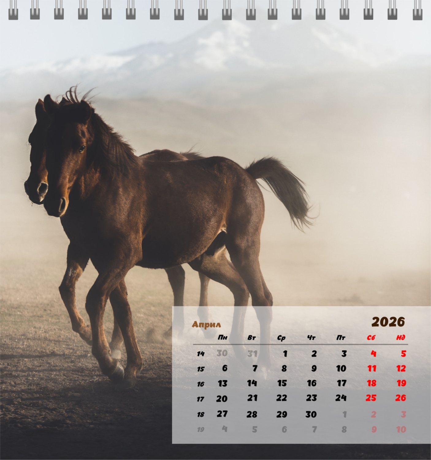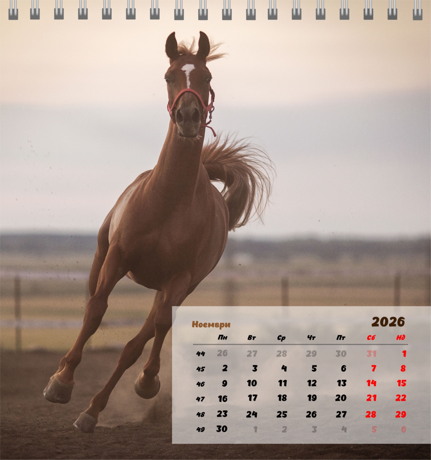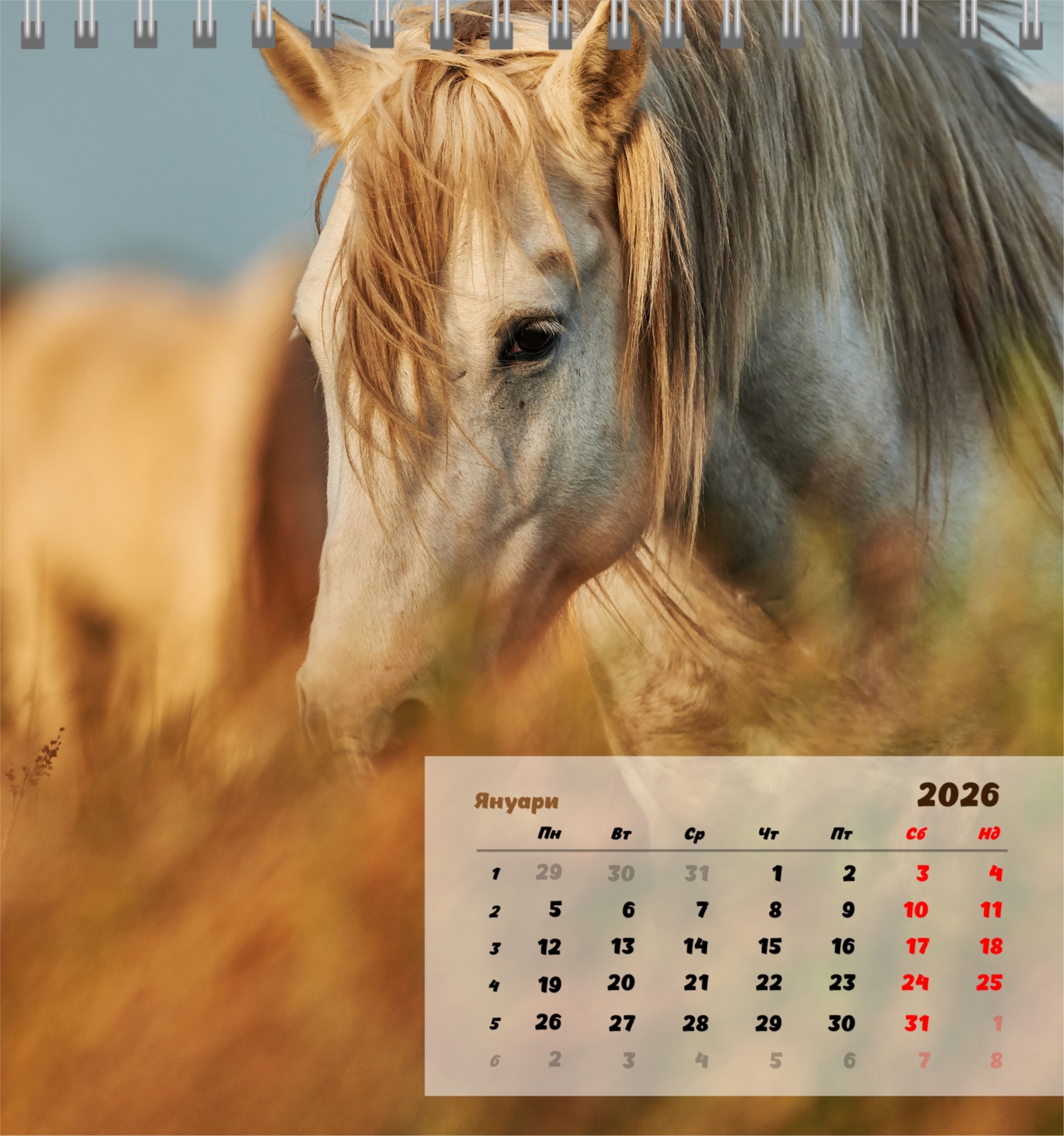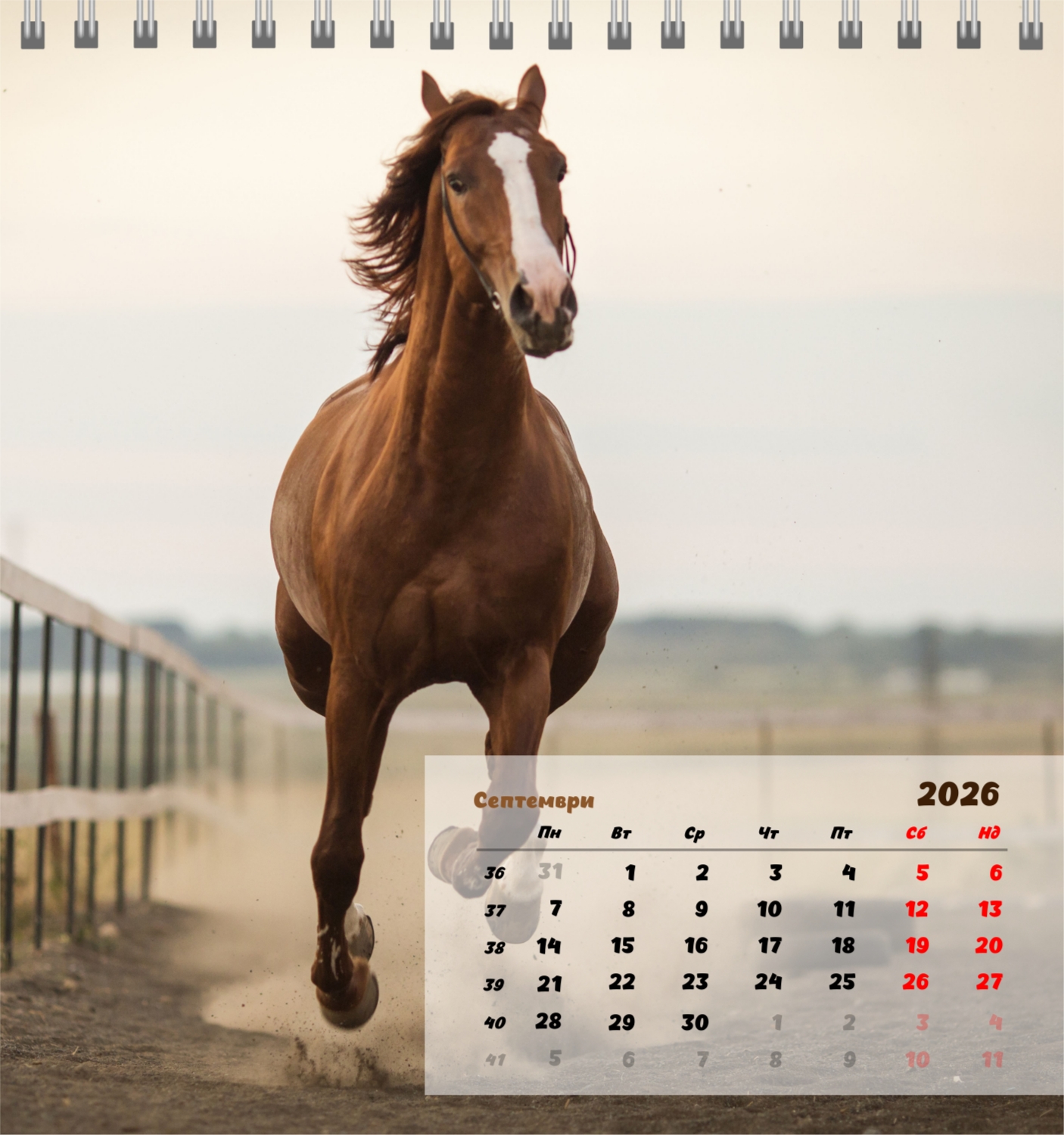 Готов шаблон за настолен компактен календар с коне е създаден за тези, които ценят естествената хармония, динамика и символика на силата. Изображенията показват мощни и благородни животни, които са свързани със свобода, стремеж напред и вътрешен баланс. Такъв календар е идеален за конни клубове, ферми, Ветеринарни центрове, магазини за домашни любимци, както и за треньори, инструктори, фотографи и всички, които са запалени по конния спорт или просто обичат конете. Той ще бъде еднакво подходящ както в офиса, така и в домашния интериор, създавайки атмосфера на спокойствие и вдъхновение. В нашия онлайн конструктор този шаблон може лесно да бъде адаптиран към личните предпочитания. Можете да замените снимките със собствени снимки на коне, да добавите лого на клуб или ферма, да промените шрифтовете, цветовете и подреждането на елементите. Има възможност за подписване на месеци, подчертаване на важни дати, отбелязване на състезания, тренировки, рождени дни и други събития. Всеки елемент от календара – от фона до фините детайли – може да се редактира, което ви позволява да създадете наистина персонализирана опция. Онлайн дизайнерът работи възможно най-удобно и просто: всички промени се показват наведнъж, можете да експериментирате с композиции, да опитате различни стилове и да запазите няколко опции.