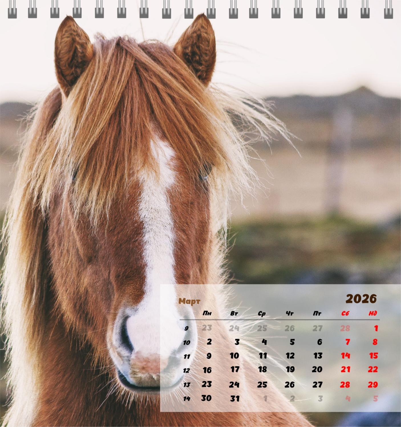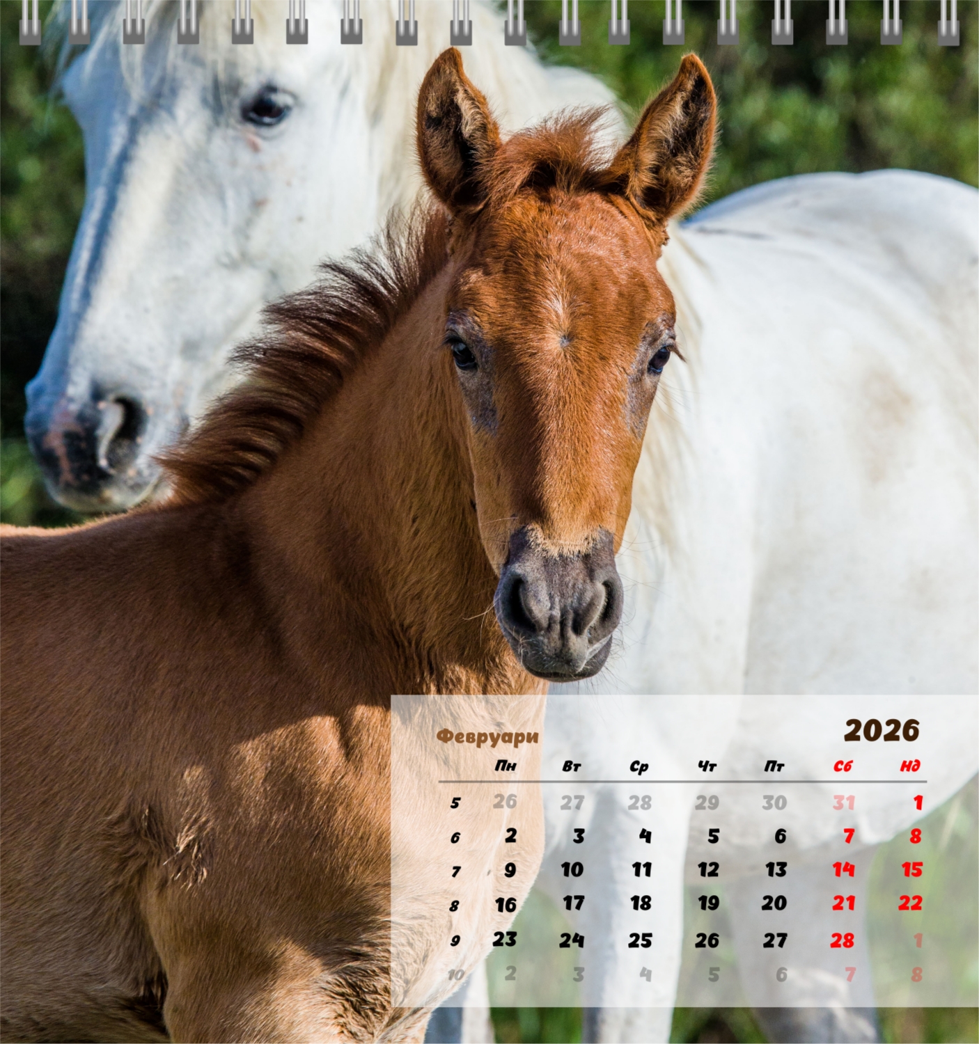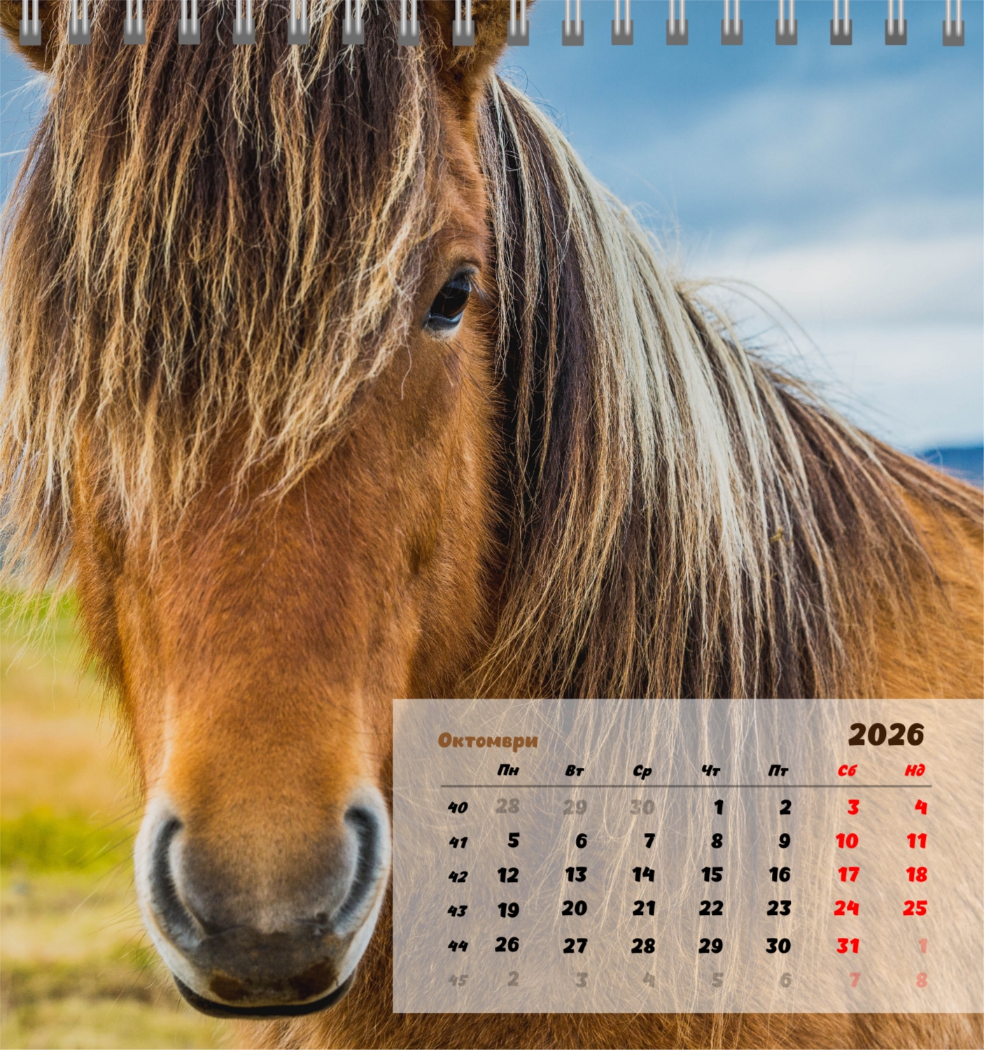 Готов шаблон за настолен компактен календар с коне е създаден за тези, които ценят естествената хармония, динамика и символика на силата. Изображенията показват мощни и благородни животни, които са свързани със свобода, стремеж напред и вътрешен баланс. Такъв календар е идеален за конни клубове, ферми, Ветеринарни центрове, магазини за домашни любимци, както и за треньори, инструктори, фотографи и всички, които са запалени по конния спорт или просто обичат конете. Той ще бъде еднакво подходящ както в офиса, така и в домашния интериор, създавайки атмосфера на спокойствие и вдъхновение. В нашия онлайн конструктор този шаблон може лесно да бъде адаптиран към личните предпочитания. Можете да замените снимките със собствени снимки на коне, да добавите лого на клуб или ферма, да промените шрифтовете, цветовете и подреждането на елементите. Има възможност за подписване на месеци, подчертаване на важни дати, отбелязване на състезания, тренировки, рождени дни и други събития. Всеки елемент от календара – от фона до фините детайли – може да се редактира, което ви позволява да създадете наистина персонализирана опция. Онлайн дизайнерът работи възможно най-удобно и просто: всички промени се показват наведнъж, можете да експериментирате с композиции, да опитате различни стилове и да запазите няколко опции.