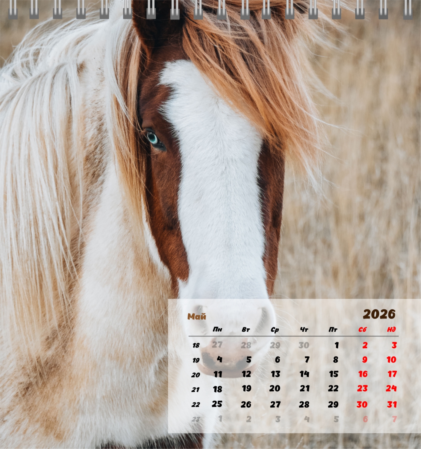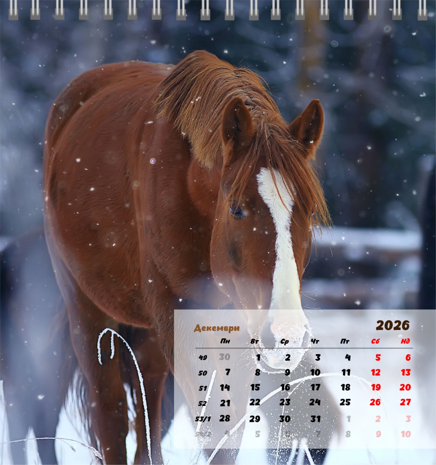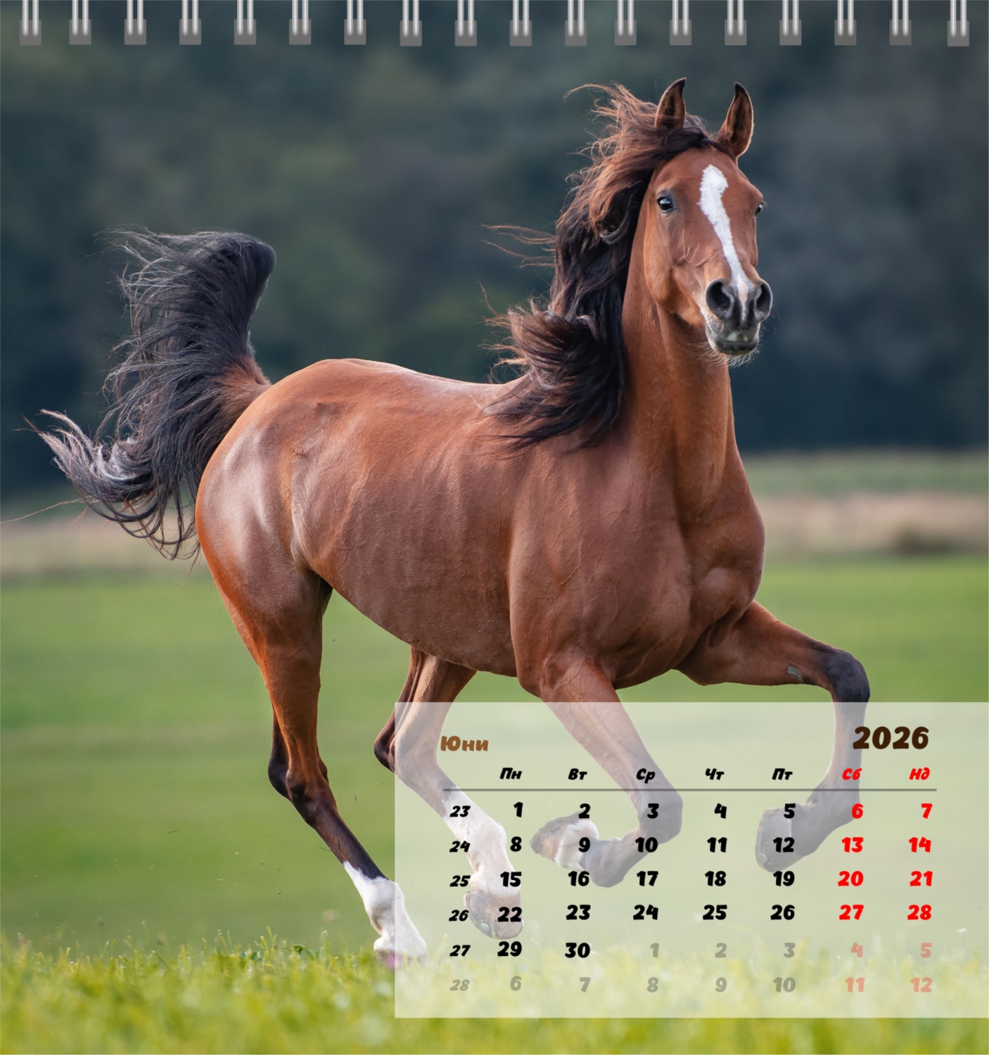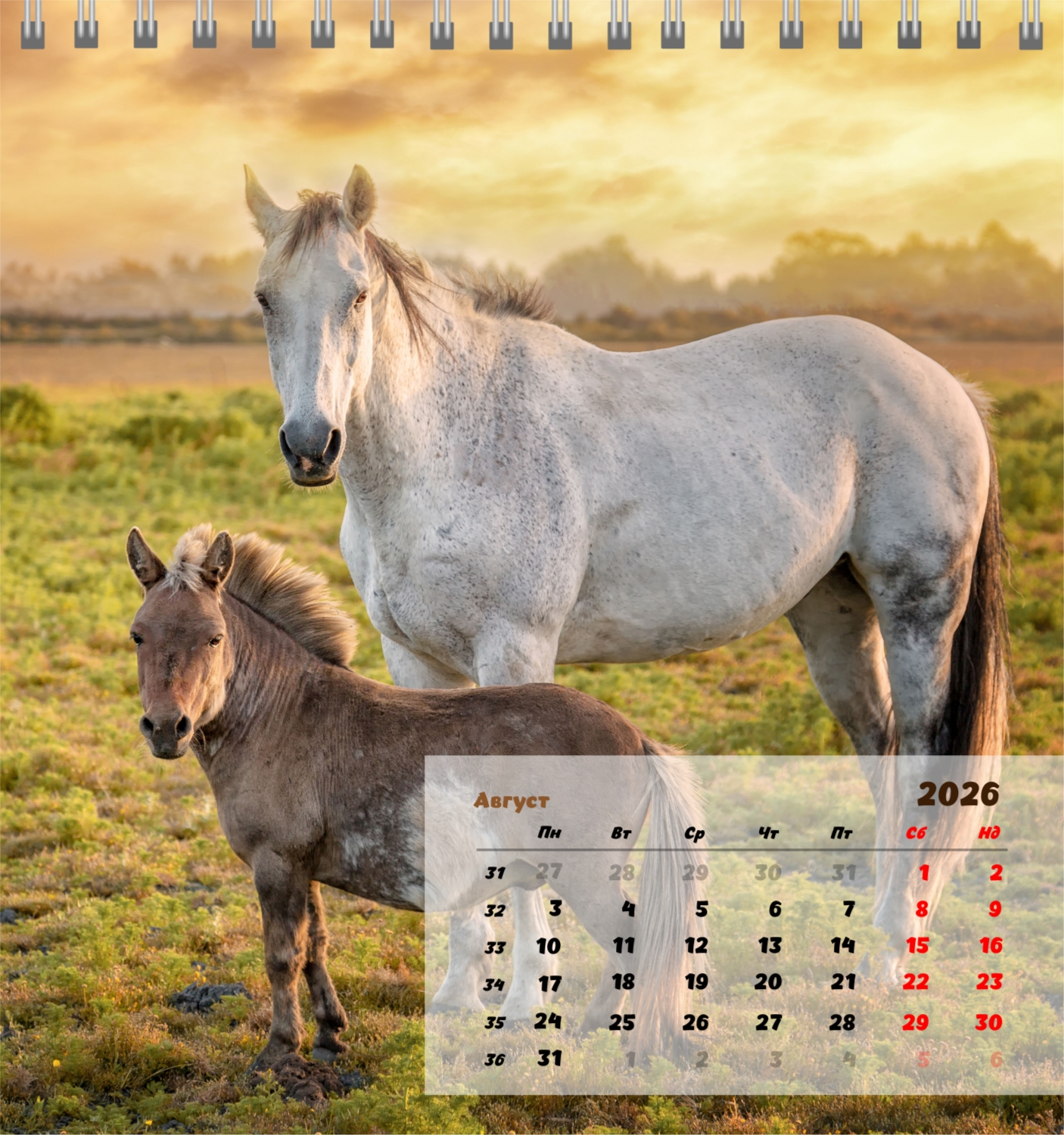 Готов шаблон за настолен компактен календар с коне е създаден за тези, които ценят естествената хармония, динамика и символика на силата. Изображенията показват мощни и благородни животни, които са свързани със свобода, стремеж напред и вътрешен баланс. Такъв календар е идеален за конни клубове, ферми, Ветеринарни центрове, магазини за домашни любимци, както и за треньори, инструктори, фотографи и всички, които са запалени по конния спорт или просто обичат конете. Той ще бъде еднакво подходящ както в офиса, така и в домашния интериор, създавайки атмосфера на спокойствие и вдъхновение. В нашия онлайн конструктор този шаблон може лесно да бъде адаптиран към личните предпочитания. Можете да замените снимките със собствени снимки на коне, да добавите лого на клуб или ферма, да промените шрифтовете, цветовете и подреждането на елементите. Има възможност за подписване на месеци, подчертаване на важни дати, отбелязване на състезания, тренировки, рождени дни и други събития. Всеки елемент от календара – от фона до фините детайли – може да се редактира, което ви позволява да създадете наистина персонализирана опция. Онлайн дизайнерът работи възможно най-удобно и просто: всички промени се показват наведнъж, можете да експериментирате с композиции, да опитате различни стилове и да запазите няколко опции.