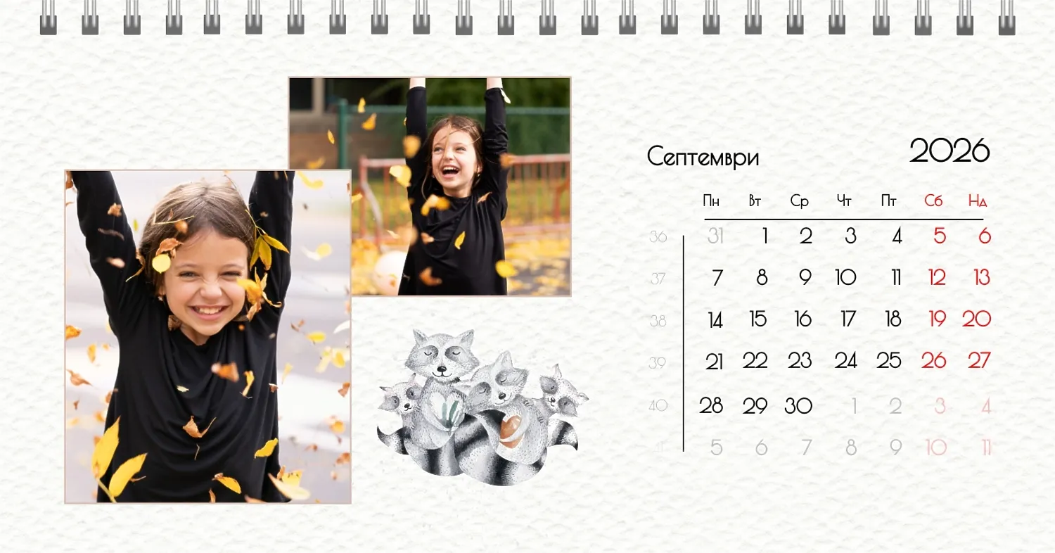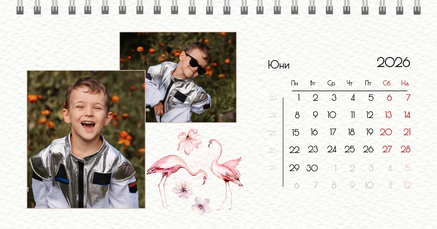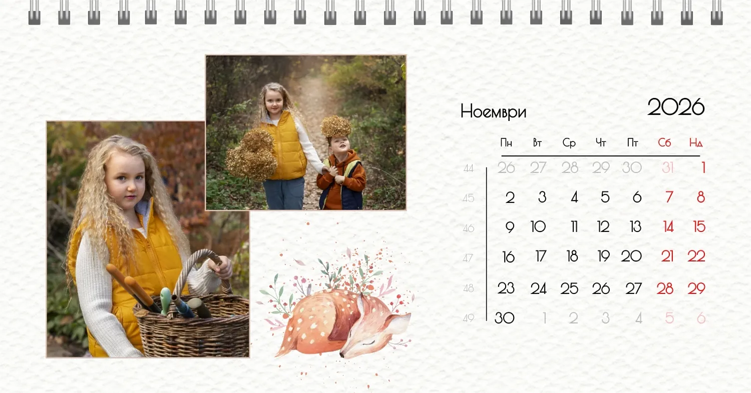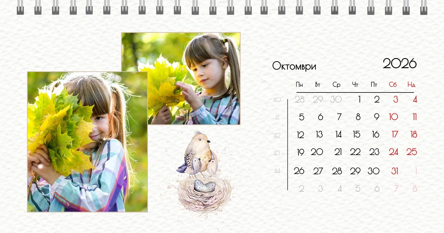 Готовият шаблон за настолен флип календар със снимки на деца и сладък декоративен дизайн е създаден за тези, които ценят топлите семейни емоции и искат да превърнат обикновения календар в уютен личен аксесоар. Нежните пастелни нюанси, спретнатите илюстрации, детските декоративни елементи и акцентът върху фотографията правят такъв календар особено привлекателен за родители, възпитатели, преподаватели в творчески студия, Детски фотографи и всеки, който работи с деца или създава съдържание за тях. Подходящ е за семейни архиви, детски градини, центрове за развитие и малки студия, които искат да предложат на клиентите приятен и емоционален продукт. В нашия онлайн дизайнер този шаблон е лесен за преобразуване за вашите собствени задачи. Можете да замените снимки, да промените местоположението на елементите, да редактирате надписи, да изберете други шрифтове и нюанси, да добавите декоративни вложки или обратно — премахнете ненужните, за да създадете по-минималистична композиция. Всеки месец може да бъде декориран по различен начин, добавяйки важни дати, индивидуални бележки или малки снимки, които подчертават характера на детето или темата на снимката.