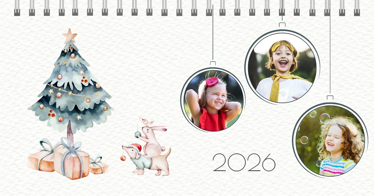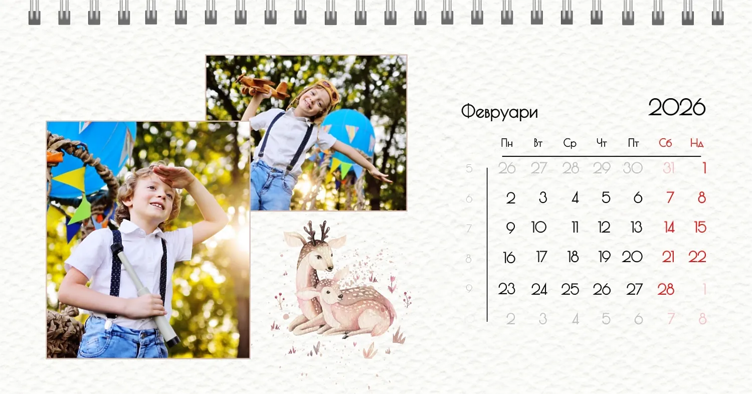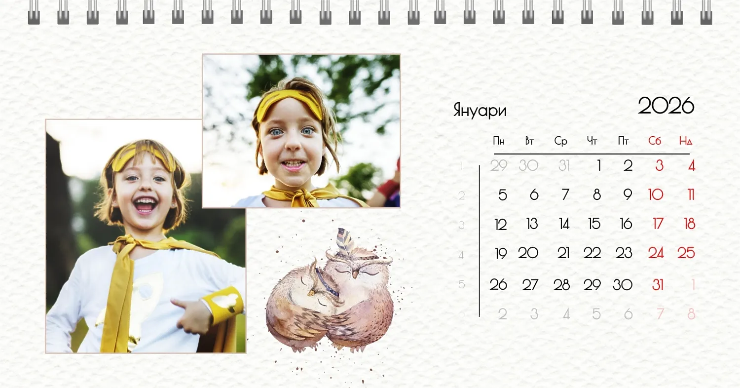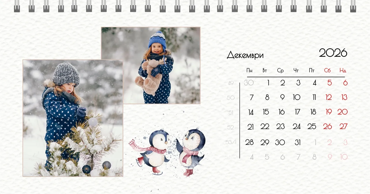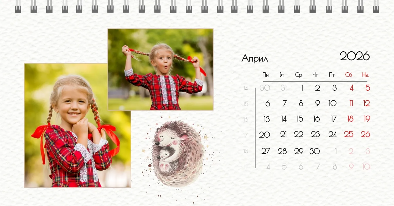 Готовият шаблон за настолен флип календар със снимки на деца и сладък декоративен дизайн е създаден за тези, които ценят топлите семейни емоции и искат да превърнат обикновения календар в уютен личен аксесоар. Нежните пастелни нюанси, спретнатите илюстрации, детските декоративни елементи и акцентът върху фотографията правят такъв календар особено привлекателен за родители, възпитатели, преподаватели в творчески студия, Детски фотографи и всеки, който работи с деца или създава съдържание за тях. Подходящ е за семейни архиви, детски градини, центрове за развитие и малки студия, които искат да предложат на клиентите приятен и емоционален продукт. В нашия онлайн дизайнер този шаблон е лесен за преобразуване за вашите собствени задачи. Можете да замените снимки, да промените местоположението на елементите, да редактирате надписи, да изберете други шрифтове и нюанси, да добавите декоративни вложки или обратно — премахнете ненужните, за да създадете по-минималистична композиция. Всеки месец може да бъде декориран по различен начин, добавяйки важни дати, индивидуални бележки или малки снимки, които подчертават характера на детето или темата на снимката.