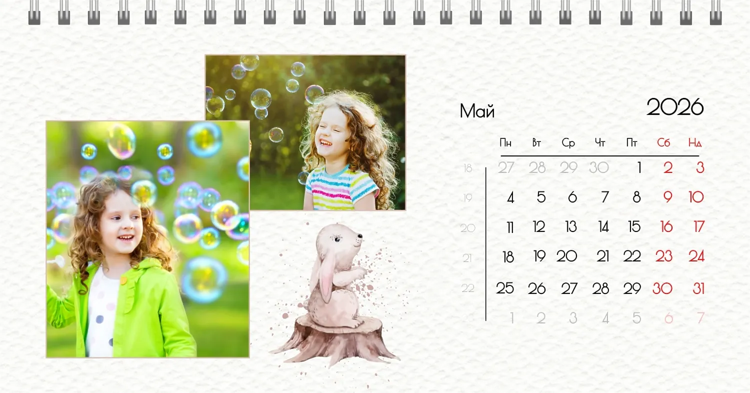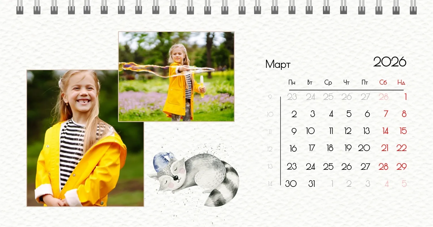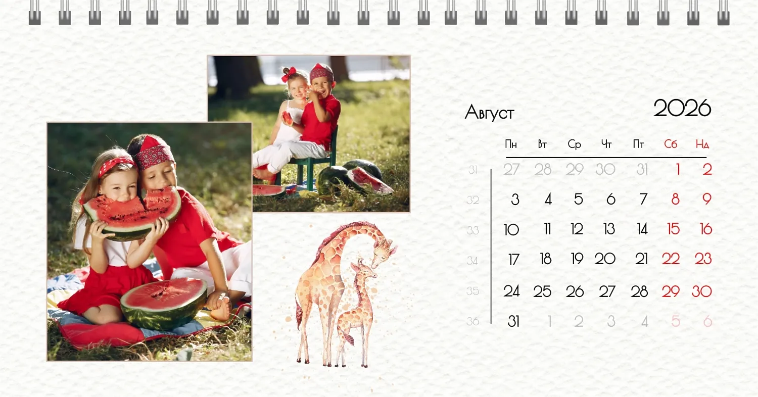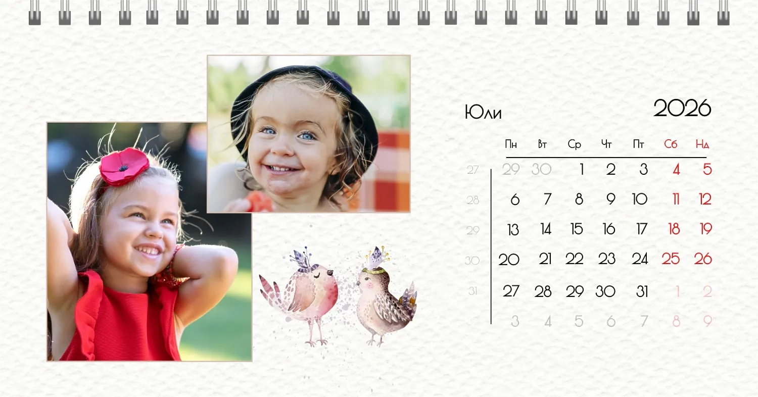 Готовият шаблон за настолен флип календар със снимки на деца и сладък декоративен дизайн е създаден за тези, които ценят топлите семейни емоции и искат да превърнат обикновения календар в уютен личен аксесоар. Нежните пастелни нюанси, спретнатите илюстрации, детските декоративни елементи и акцентът върху фотографията правят такъв календар особено привлекателен за родители, възпитатели, преподаватели в творчески студия, Детски фотографи и всеки, който работи с деца или създава съдържание за тях. Подходящ е за семейни архиви, детски градини, центрове за развитие и малки студия, които искат да предложат на клиентите приятен и емоционален продукт. В нашия онлайн дизайнер този шаблон е лесен за преобразуване за вашите собствени задачи. Можете да замените снимки, да промените местоположението на елементите, да редактирате надписи, да изберете други шрифтове и нюанси, да добавите декоративни вложки или обратно — премахнете ненужните, за да създадете по-минималистична композиция. Всеки месец може да бъде декориран по различен начин, добавяйки важни дати, индивидуални бележки или малки снимки, които подчертават характера на детето или темата на снимката.